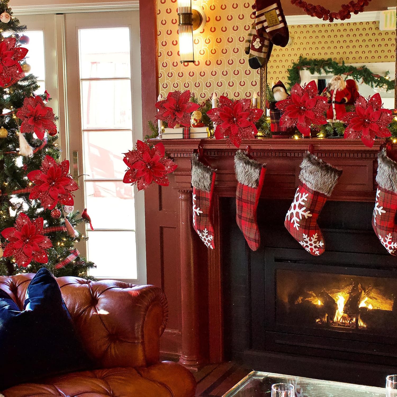 15 PCS Poinsettia Flower Artificial Poinsettia with Clips Christmas Decor Glitter Poinsettia Christmas Ornaments Christmas Tree Flower Decorations with Stems DIY Xmas Wreath Holiday Home Party Decor