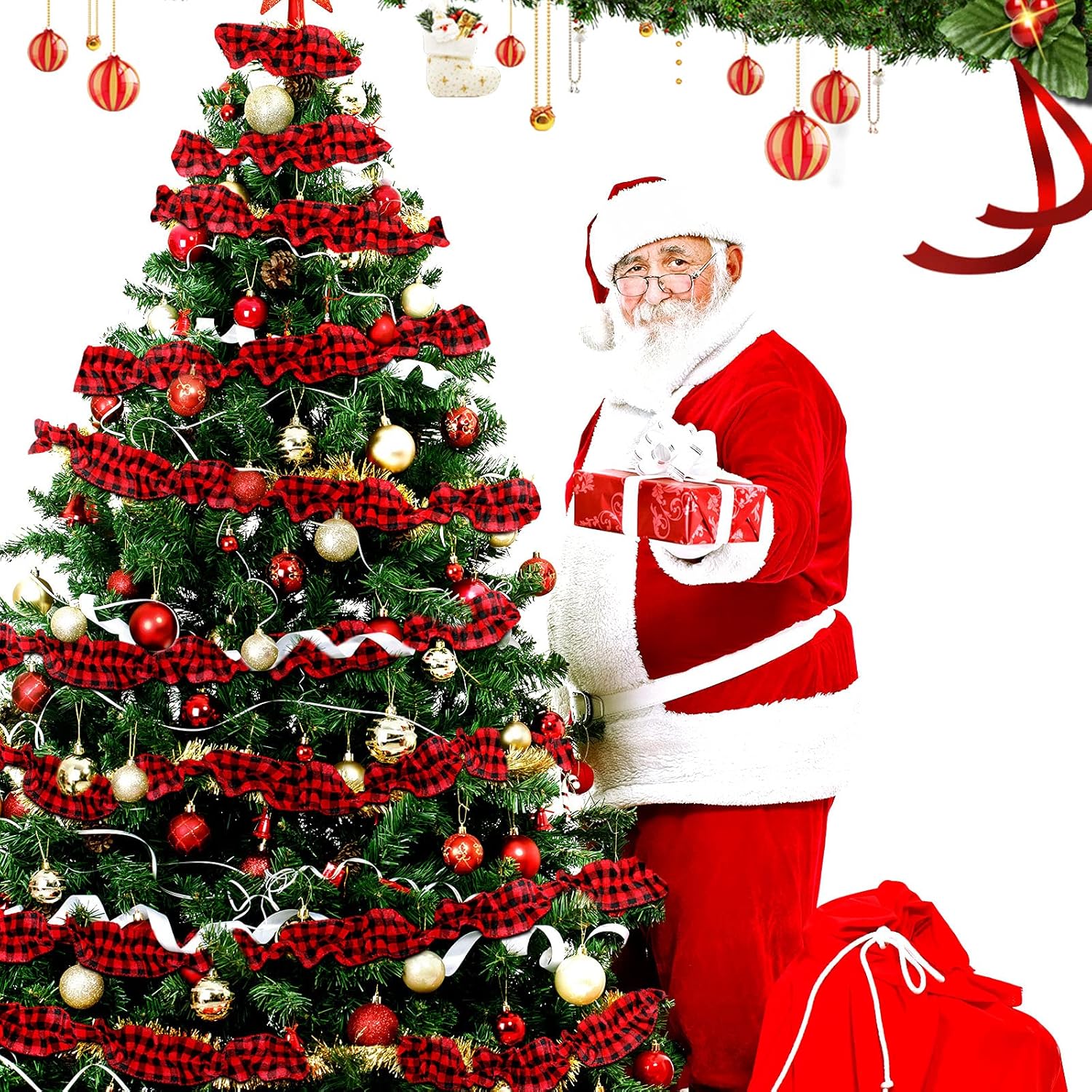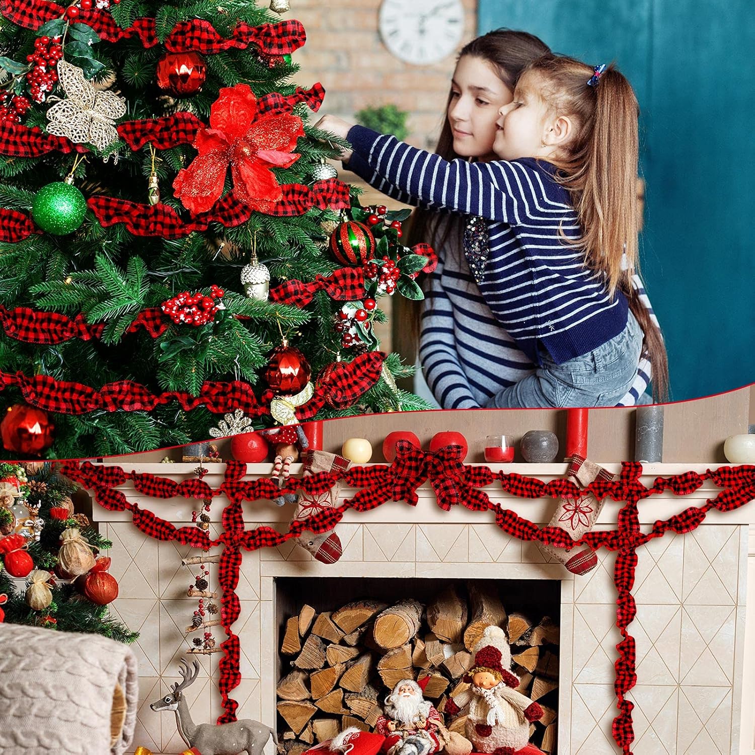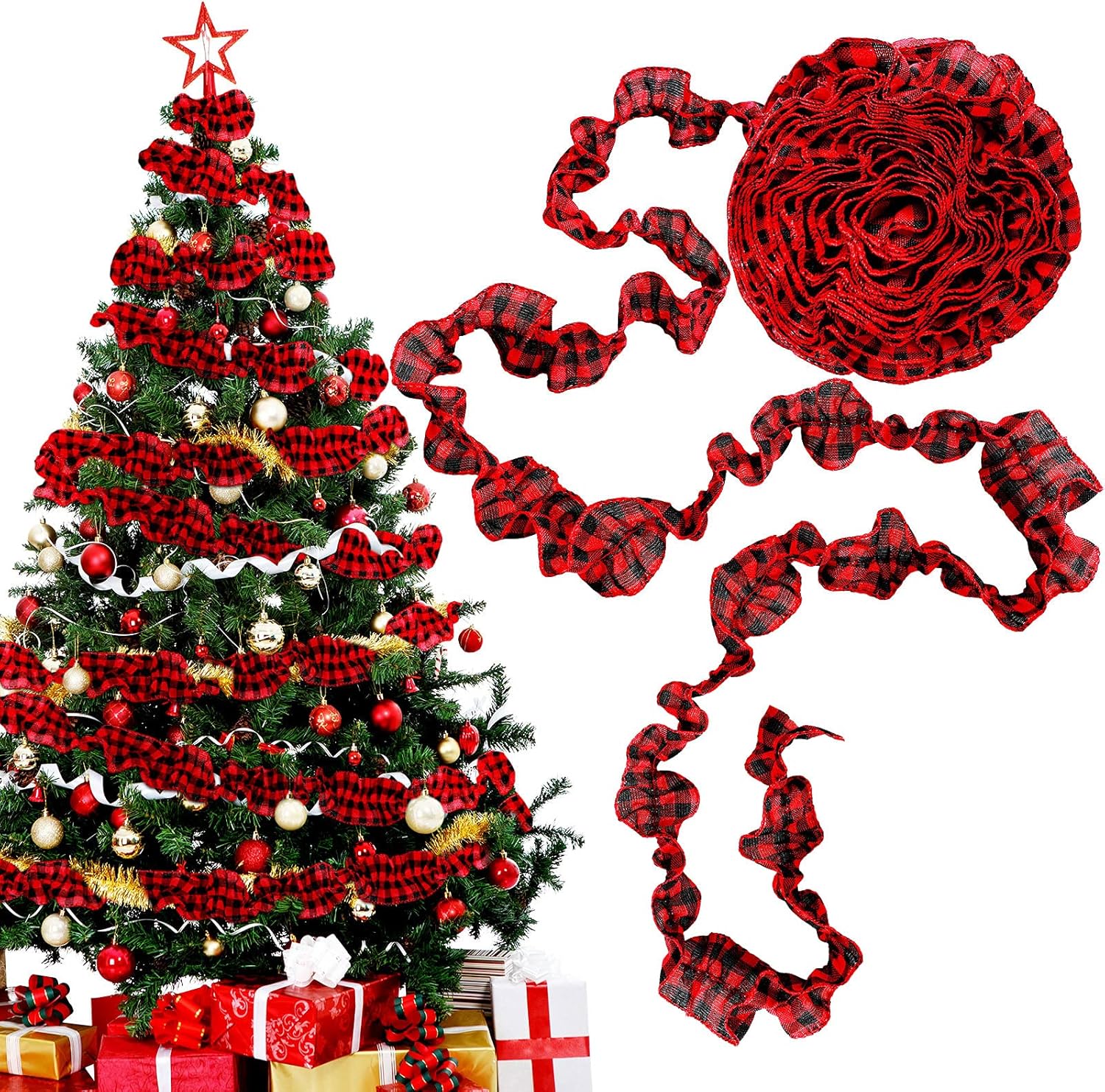 15 Yards Plaid Christmas Tree Garland Christmas Buffalo Plaid Ribbon Ruffled Homespun Fabric Garland Christmas Tree Ribbon Decorations for Christmas Home Wreath Staircase Tree Decor (Red and Black)