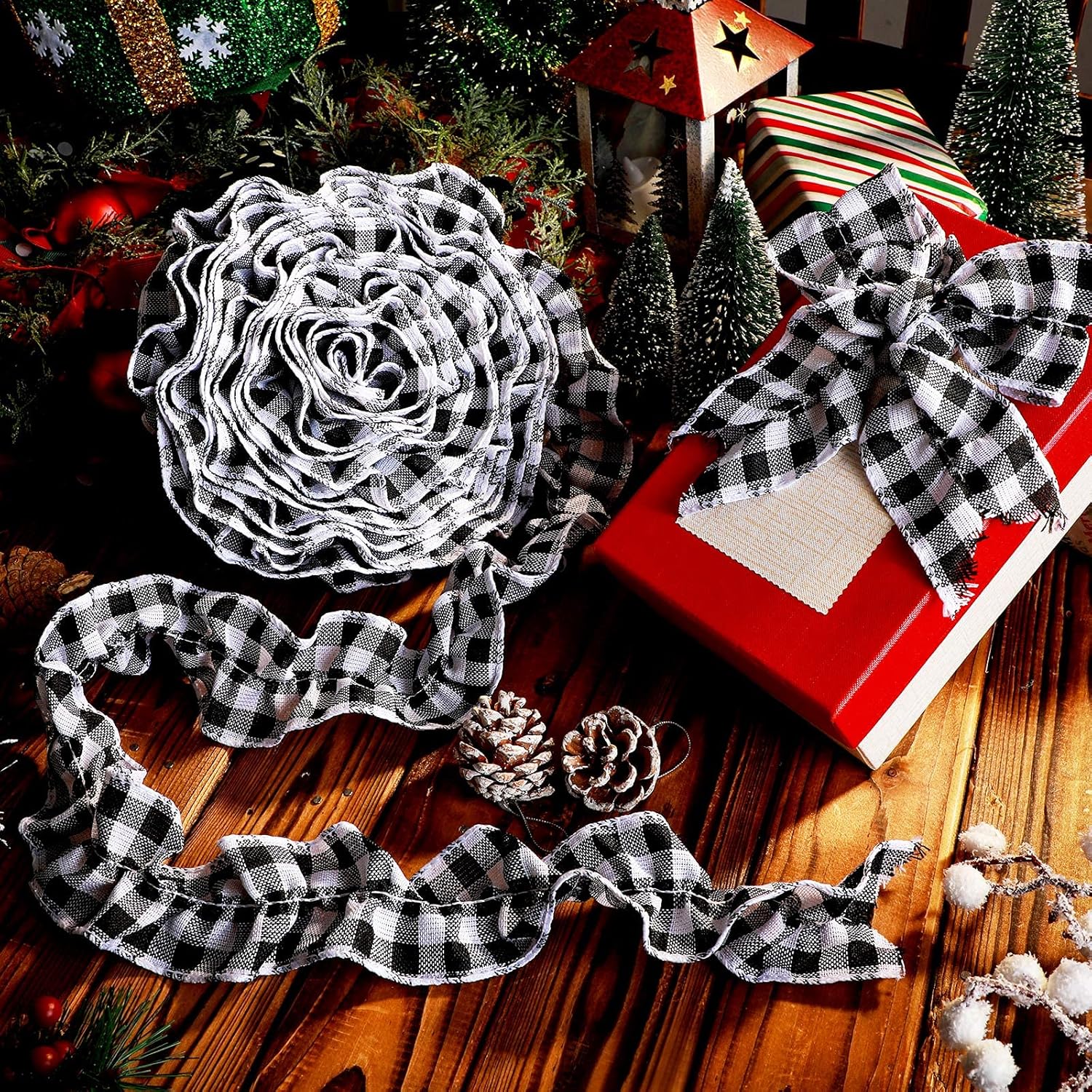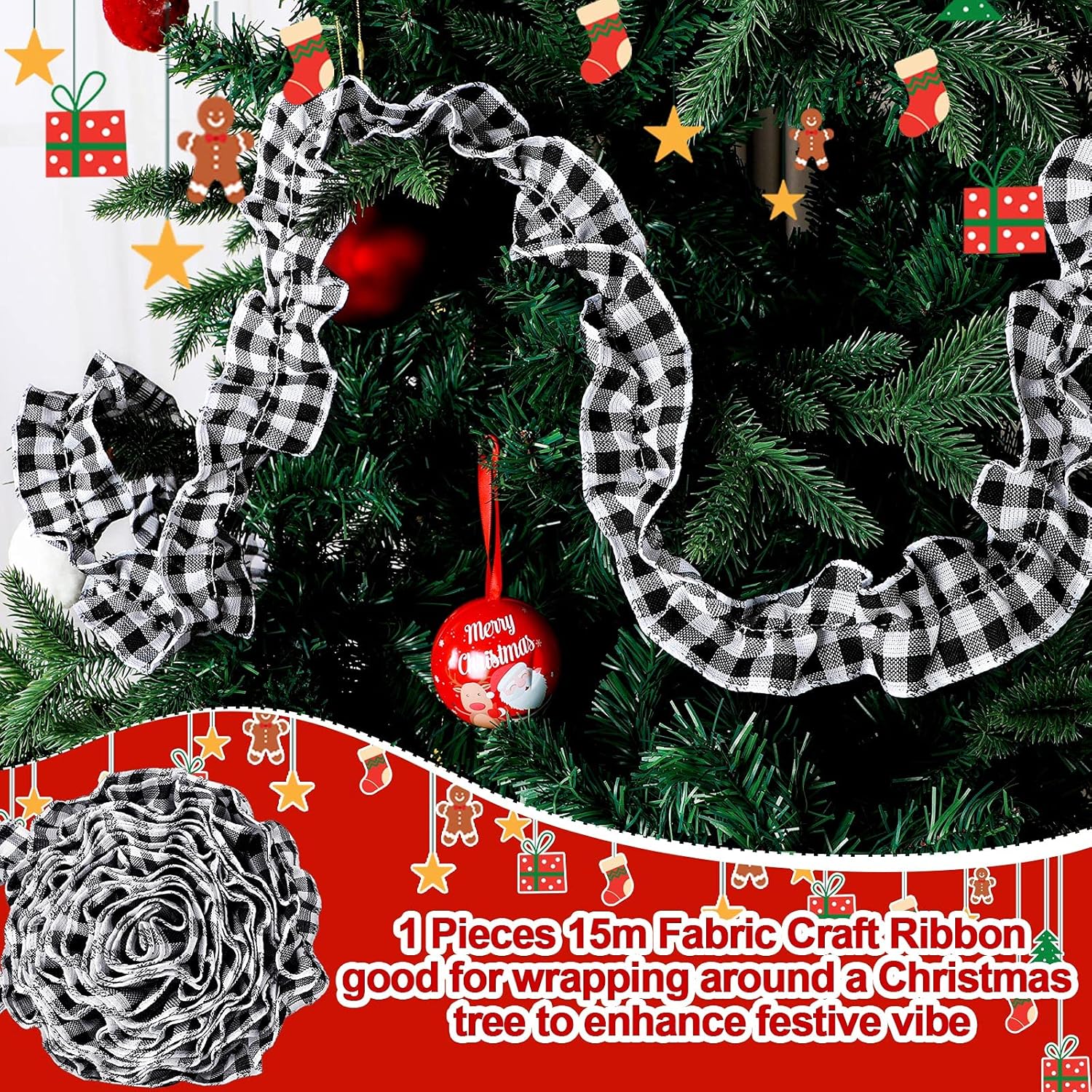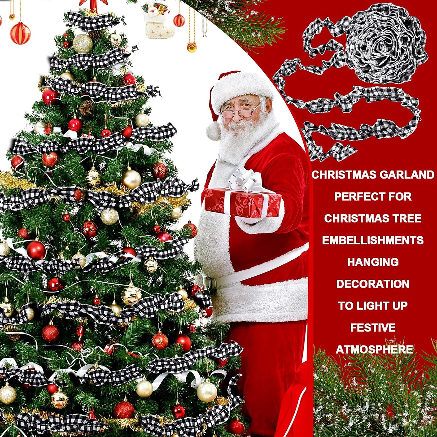 15 Yards Plaid Christmas Tree Garland Christmas Buffalo Plaid Ribbon Ruffled Homespun Fabric Garland Christmas Tree Ribbon Decorations for Christmas Home Wreath Staircase Tree Decor (White and Black)