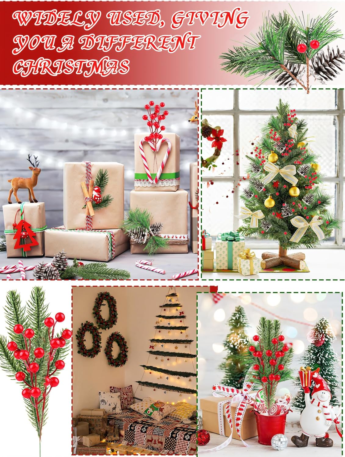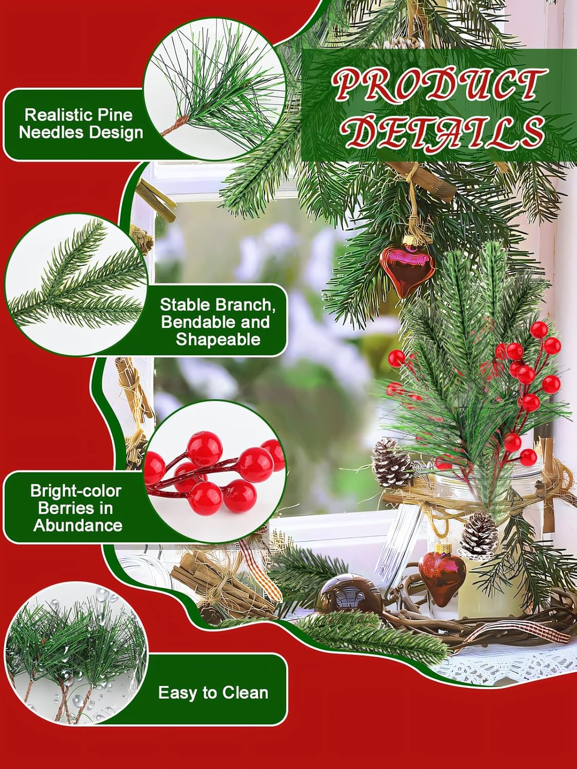 🎄 Assorted Christmas Artificial Pine Stems Kit: You will receive a total of 150 pieces of artificial pine needles branches in 3 different styles, 25 pieces of red berry bouquets with 12 branches each, 50 fake red berries, and 8 fake pine cones. The quantity is sufficient to meet your home decorating needs for Christmas, adding a festive and natural touch to your decorations.🎄 Realistic Pine Cones Appearance: Our Christmas tree picks have a realistic appearance. We designed them with reference to the natural shapes of pine branches and red berries, reproducing their colors and shapes as accurately as possible. This makes our products look lifelike, brightly colored, and attractive. It is difficult to distinguish between the real ones and the fake ones without closely examining or weighing them.