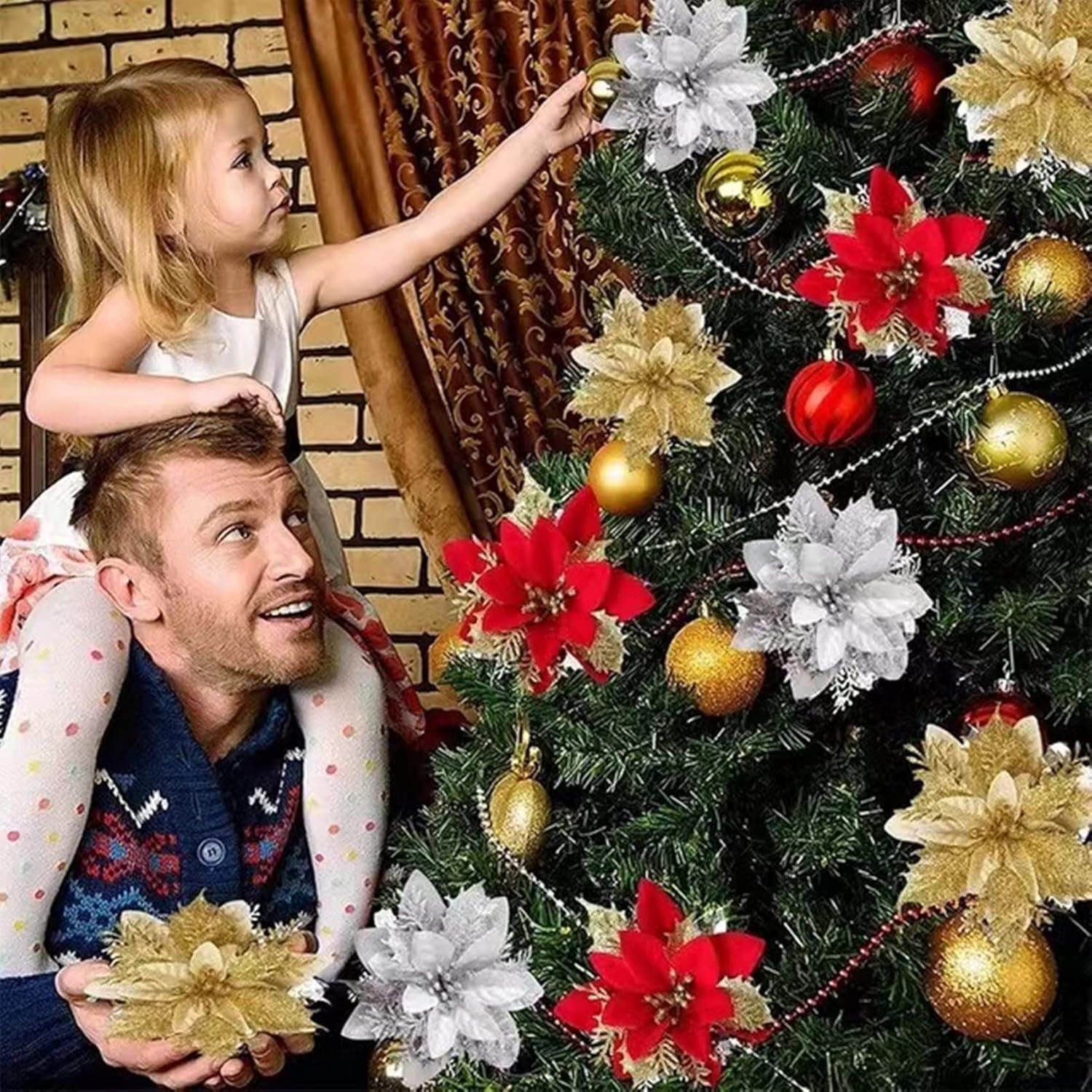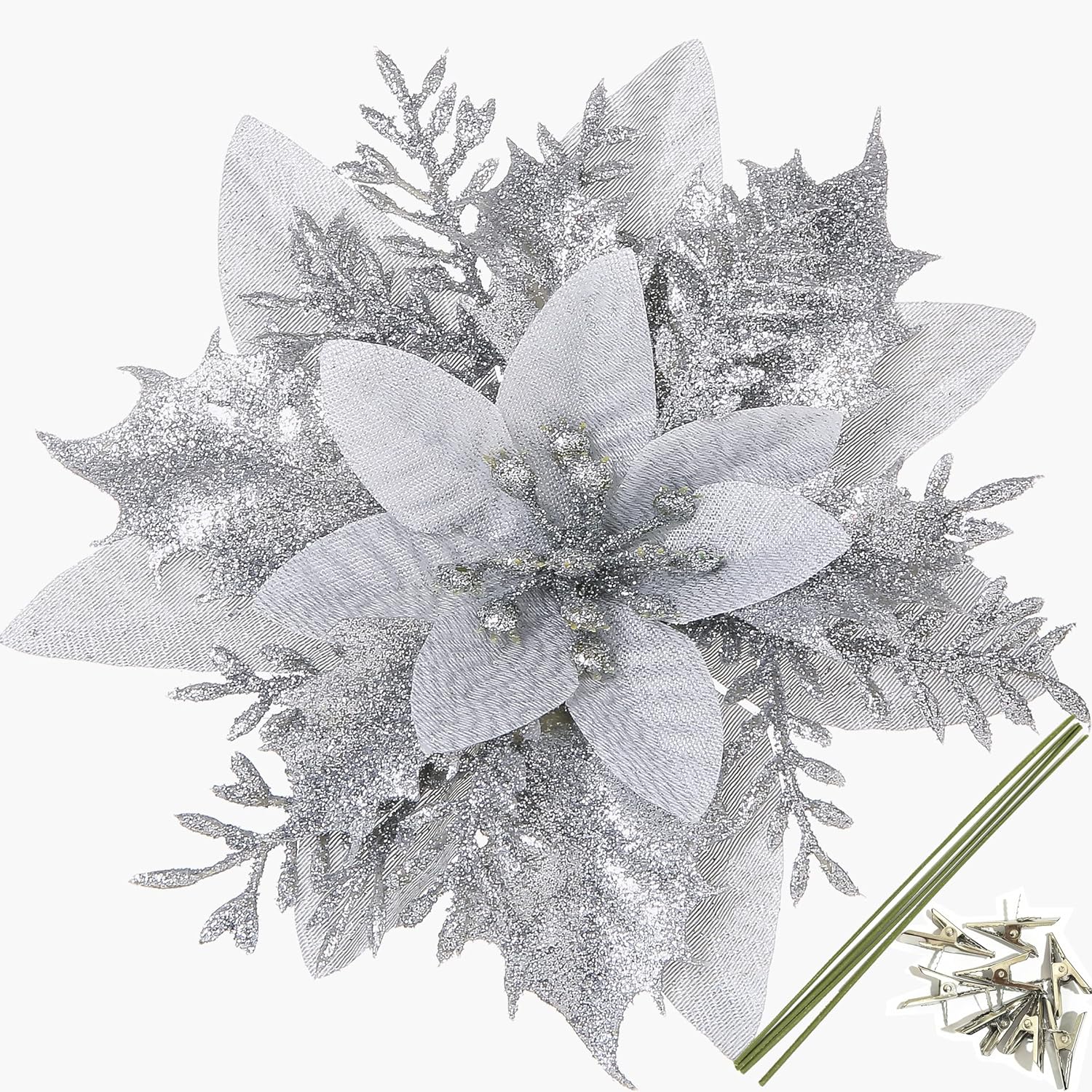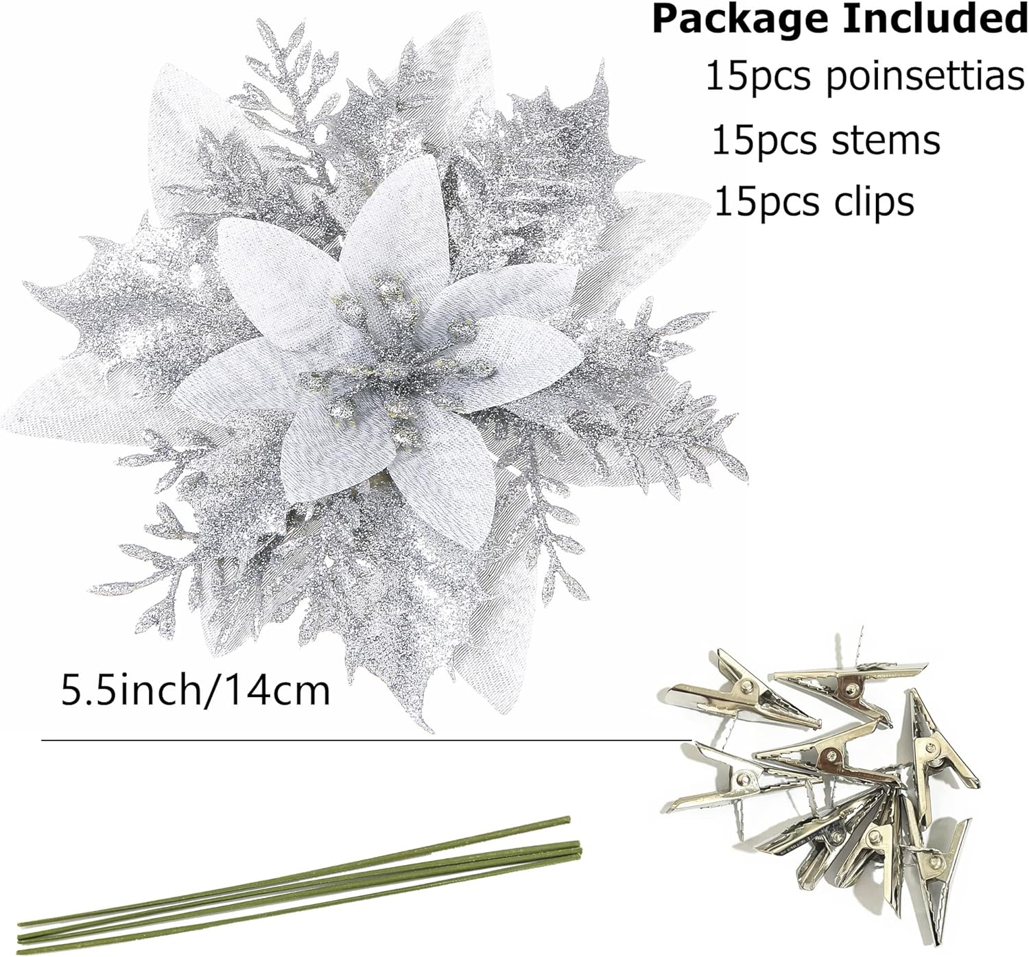 15pcs Christmas Silvery Poinsettia Flowers Artificial with Clips and Stems Christmas Tree Ornaments Glitter Poinsettia Christmas Decorations for Xmas Wreath Holiday Party Décor