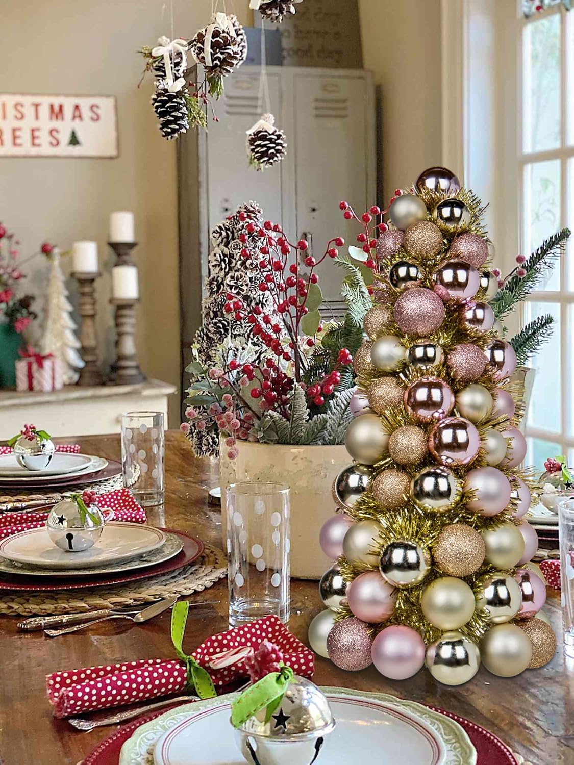 16" Mini Christmas Tree, Small Xmas Tree Decorations with 94 PCS Shatterproof Christmas Ornaments Balls for Christmas Party Centerpiece -Gold Pink