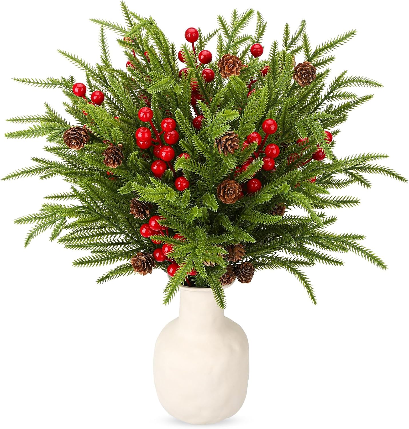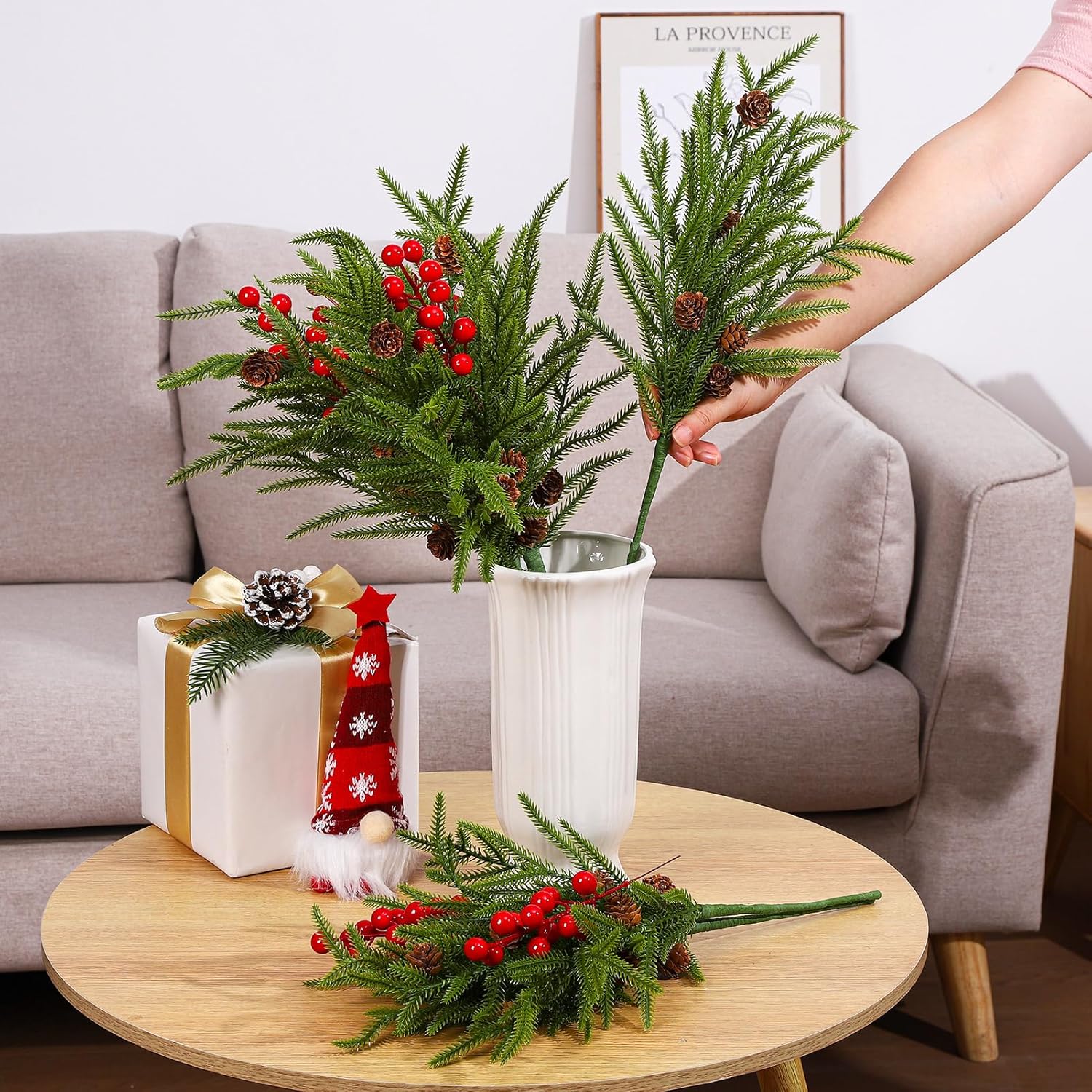 16 Pcs Christmas Norfolk Pine Branches with Red Berry Stems, Including 8 Pcs 18" Christmas Artificial Pine Branches 8 Pcs 8" Red Berry Stems for Xmas DIY Craft Outdoor