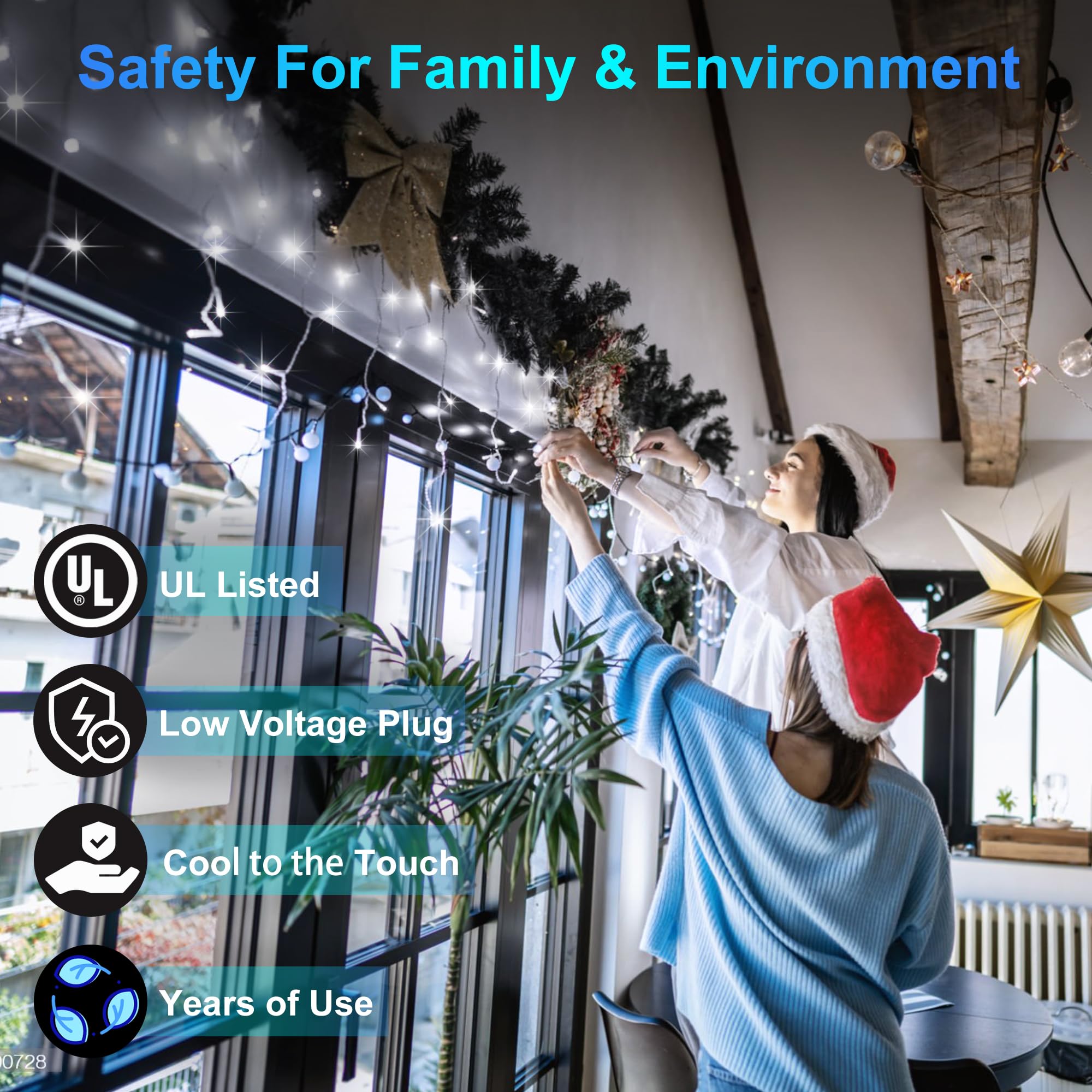 • Safe & Energy-Efficient LED Design: Safety is key when decorating for the holidays, especially with long-lasting displays. These icicle fairy lights use low-voltage LED technology, ensuring they’re cool to the touch and safe for both indoor and outdoor use. Not only are they safe, but they’re also energy-efficient, reducing electricity costs while providing a brilliant, long-lasting glow. Celebrate in style without worrying about your energy bill