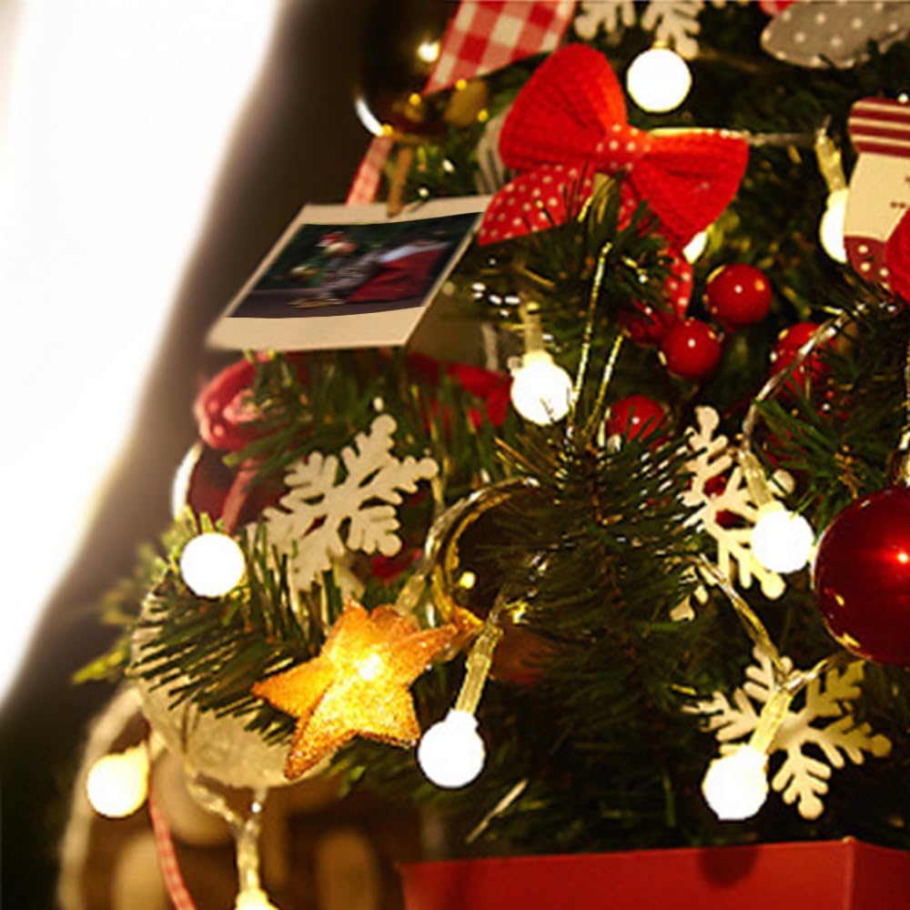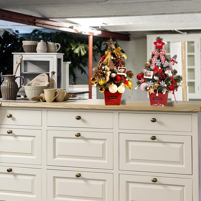 17.7 inches Mini Tabletop Christmas Artificial Pine Trees with Ornaments and Strip Light for Desktop Decoration (Red)