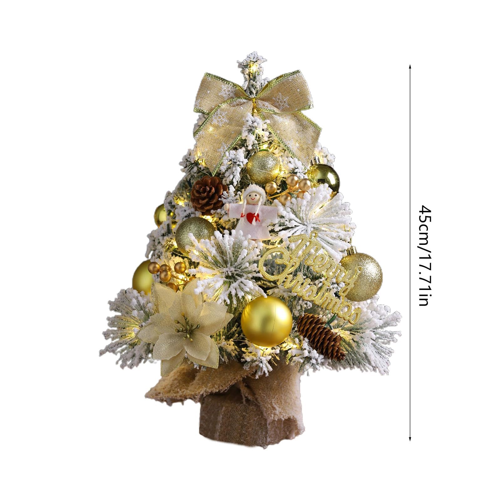 18 inch Gold Snow Flocked Tabletop Christmas Tree Glowing Mini Artificial Christmas Trees with Angel Christmas Balls Ornaments Bow Berries Pine Cones DIY Xmas Tree Winter Table Centerpieces