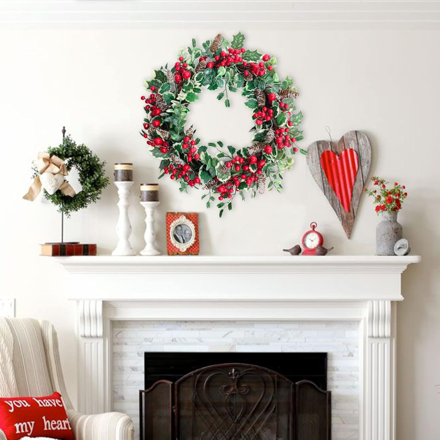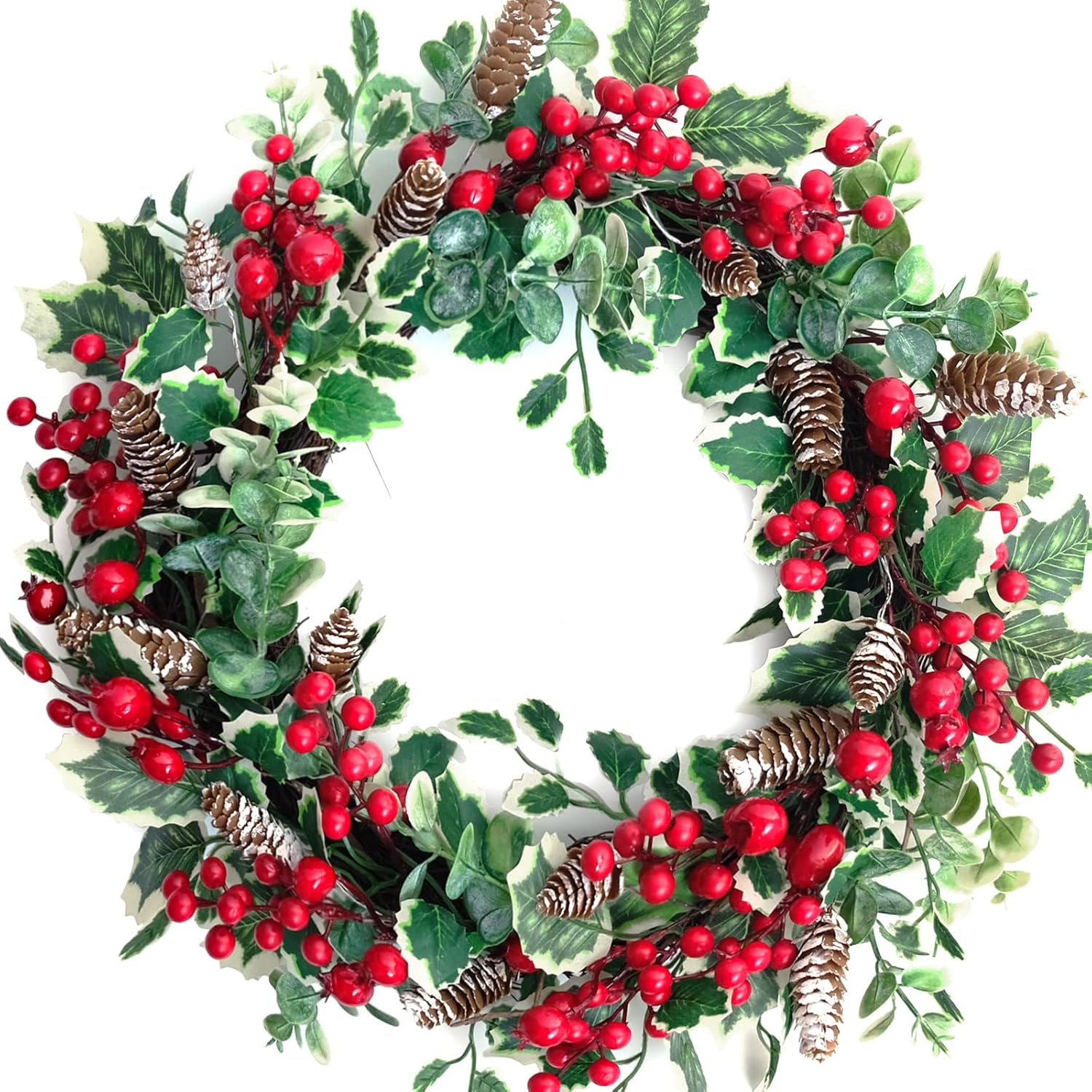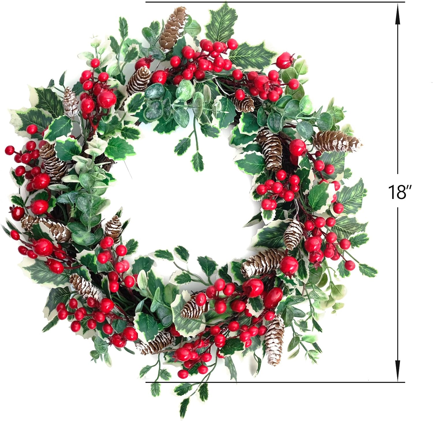 18 Inch Holly Berry Pine Cones Wreath Christmas Wreath for Front Door, Evergreen Winter Holiday Wreath Green Holly Front Door Wreath