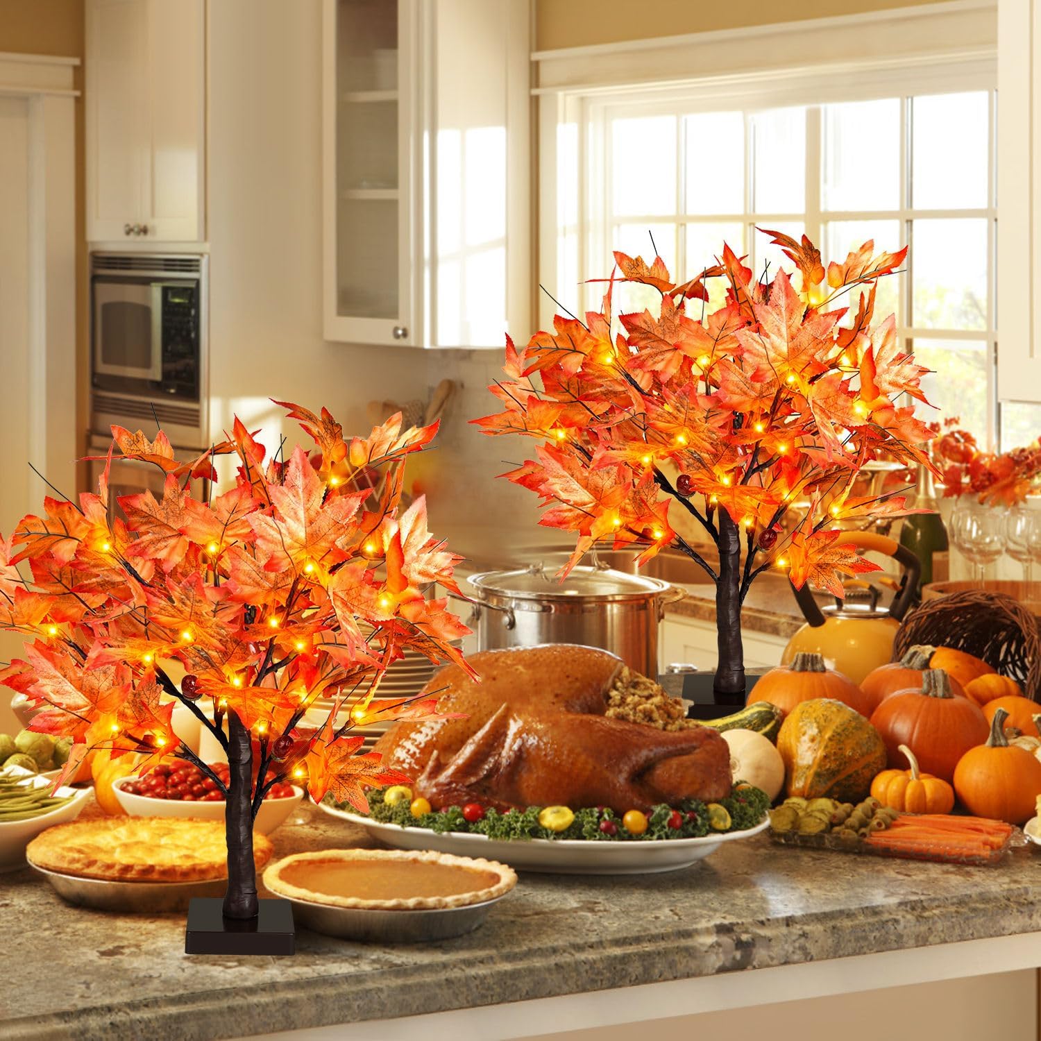 18 Inch Lighted Maple Tree with 36 Lights, 72 Leaves, 6 Acorn, Timer Battery Operated Tabletop Artificial Fall Tree for Thanksgiving Harvest Home Decor, Fall Table Decorations (18 Inch 2 Pack)