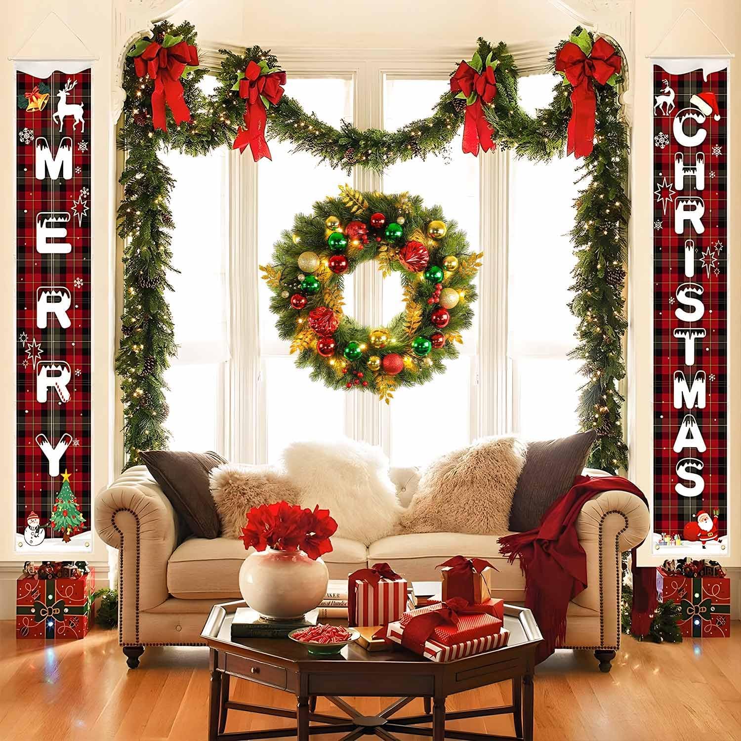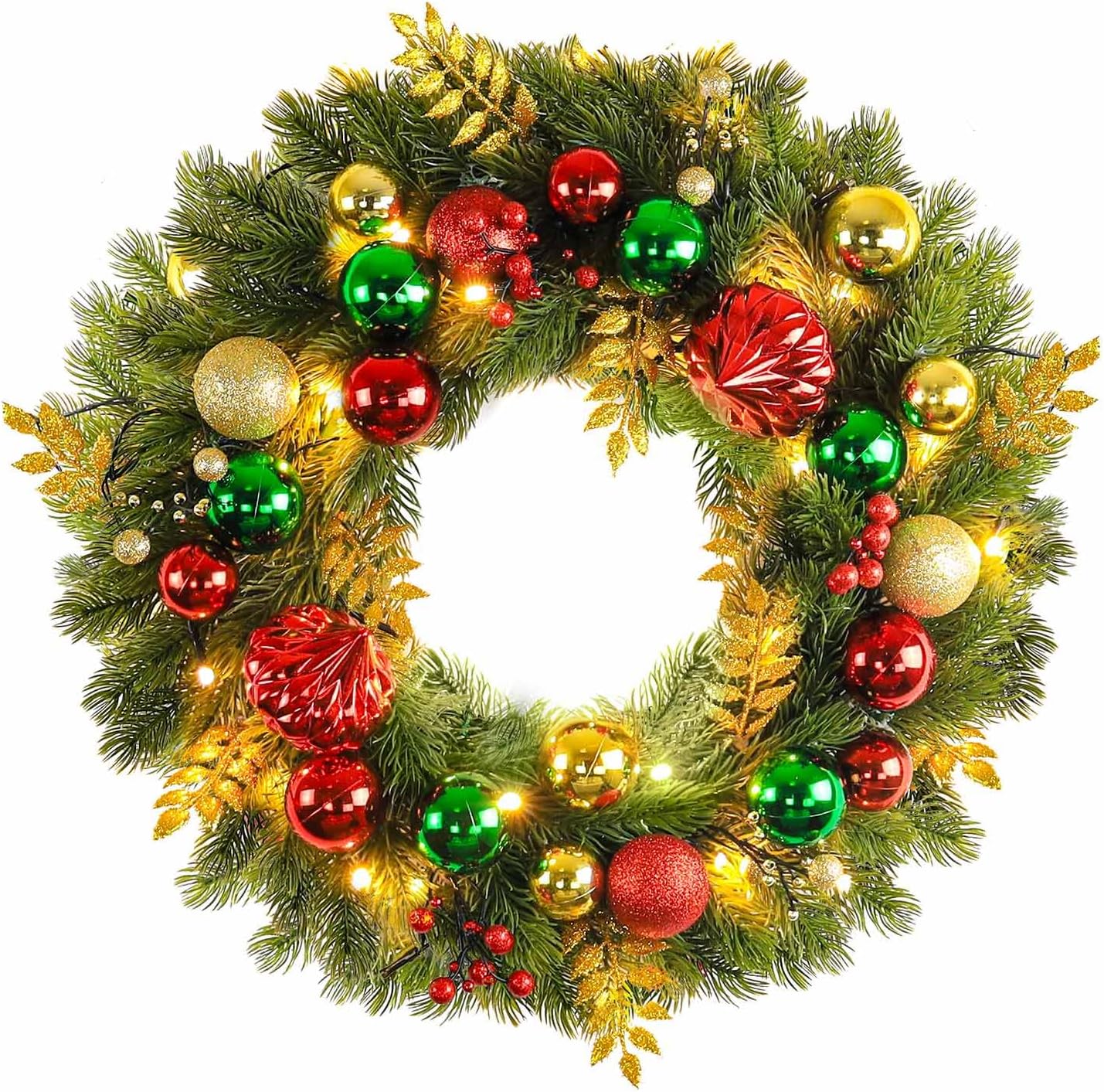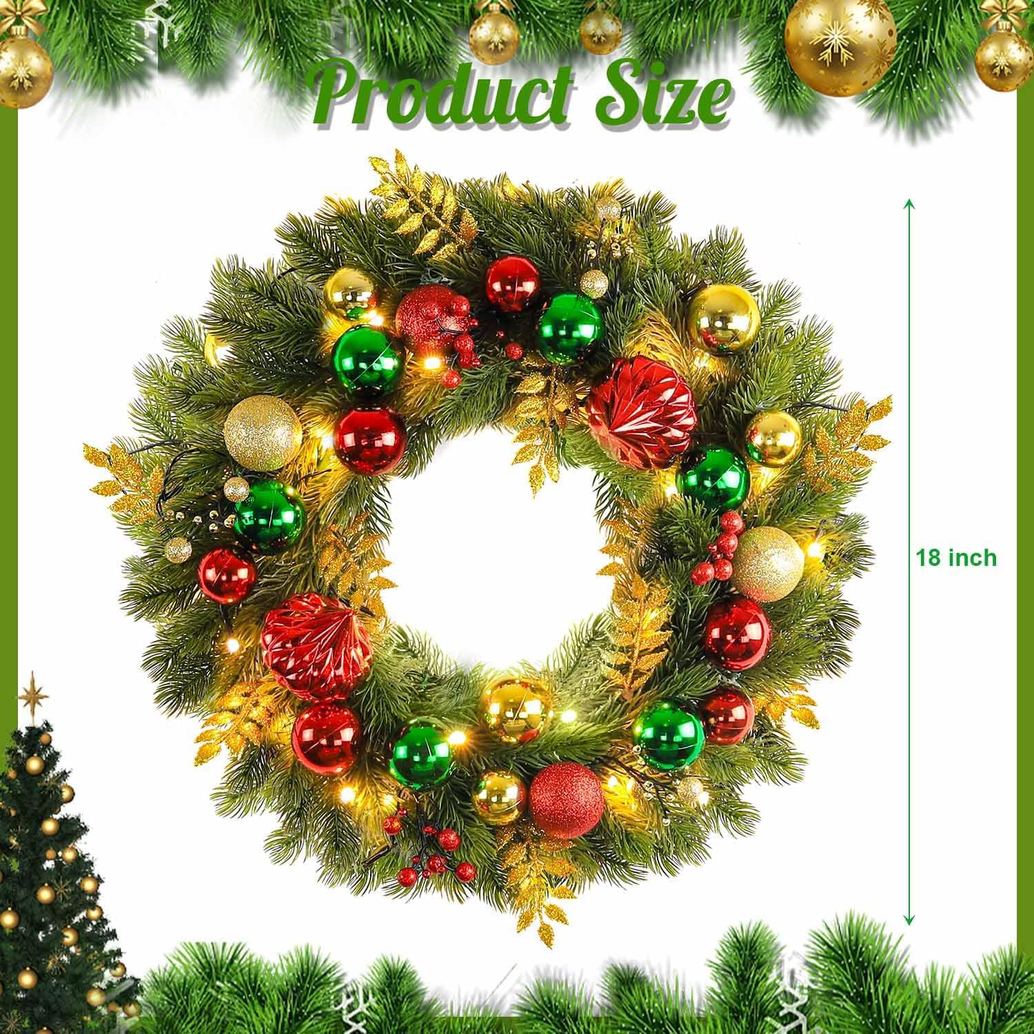 18 Inch Pre-Lit Artificial Christmas Wreath with 40 Lights, Red and Green Christmas Ball for Front Door Indoor Outdoor Farmhouse Festival Home Décor