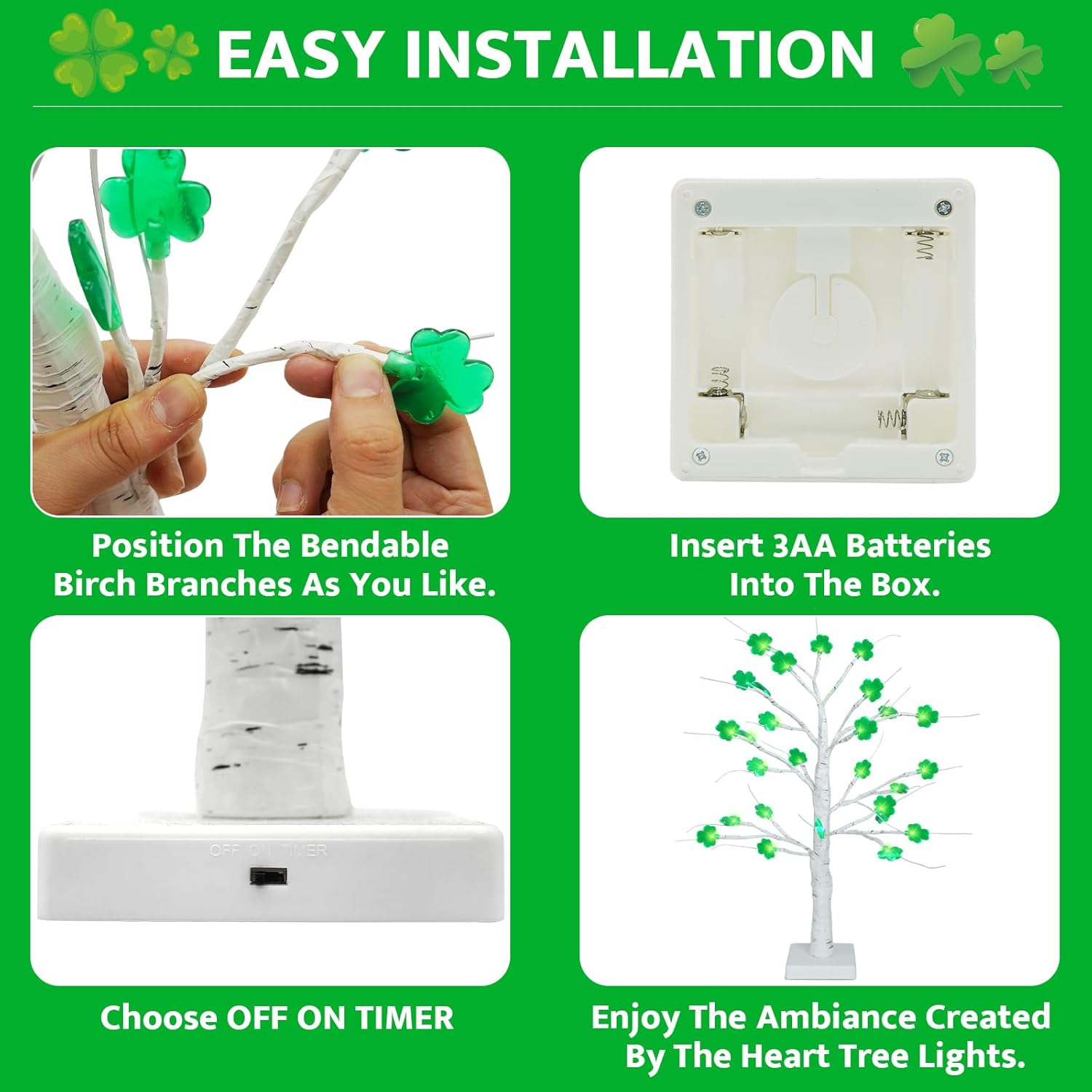 18 Inch Shamrock Tree Lights St Patricks Day Decorations with Timer, Saint Patricks Day Decor Lighted Tree with 24 LED Shamrock Lights, Battery Operated St. Patrick's Day Lights for Home Table Party