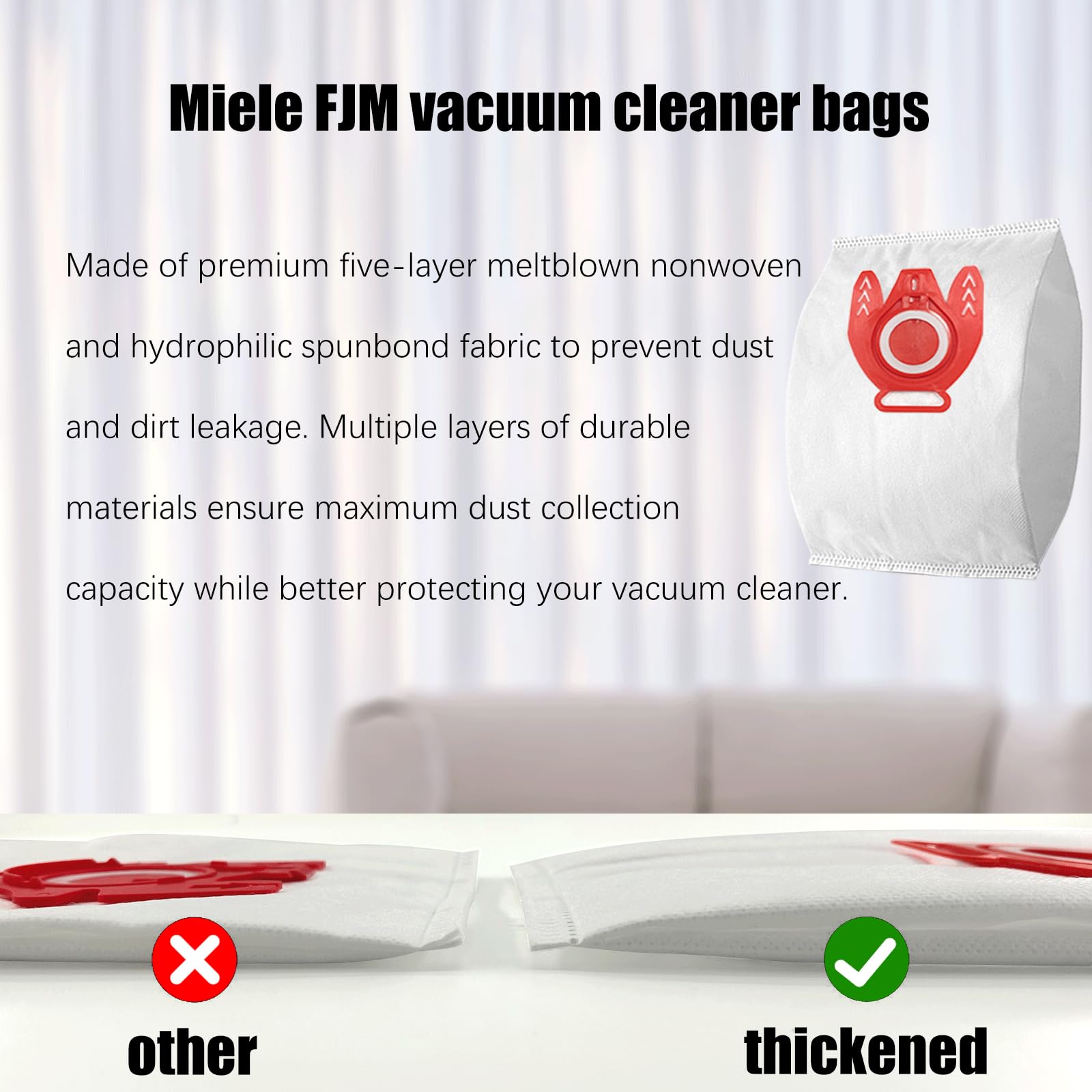 • 【Premium materials and performance】the miele fjm vacuum cleaner bags feature soft construction technology with a 5layer microfiltration system made of microfiber for higher filtration performance, capturing 99.97 of dust, hair, pet dander, etc.miele gn dust vacuum bags selflocking auto seal: once all the dust and debris has been sucked into the vacuum cleaner. Once all the dust and debris has been sucked into the vacuum cleaner, the collar ensures that this dust will not be released back into the air. When the vacuum cleaner is turned on, the collar seals automatically and all dust is sucked into the bag, avoiding the possibility of secondary contamination.