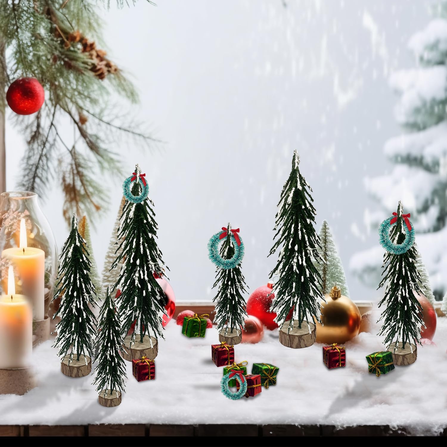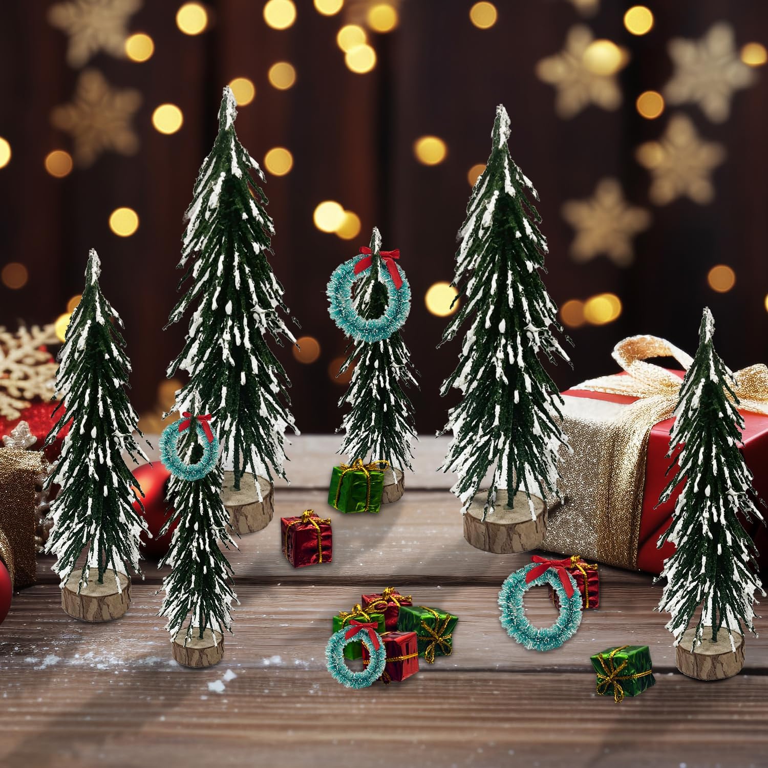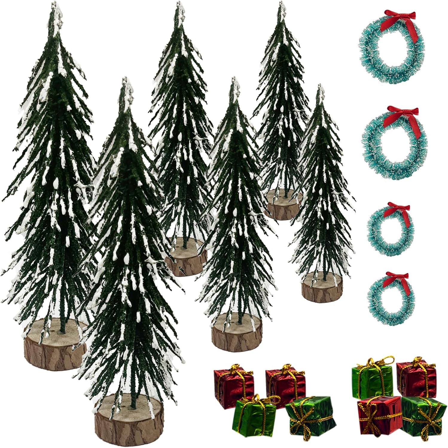 PACKAGE INCLDING: There are 18 pieces of the Christmas decoration, including 6 Pieces mini pine trees, 8 pieces Christmas s boxes and 4pcs mini wreath enough Different styles and sizes to meet your different need for holiday decor and Christmas room decor.HIGH QUALITY:Our Christmas Tree is made up of sisal fibers, bendable wire and a wooden base, longlasting and durable,easy to stand.mini wreath made of plastic ,non-toxic and odorless, no color fading.