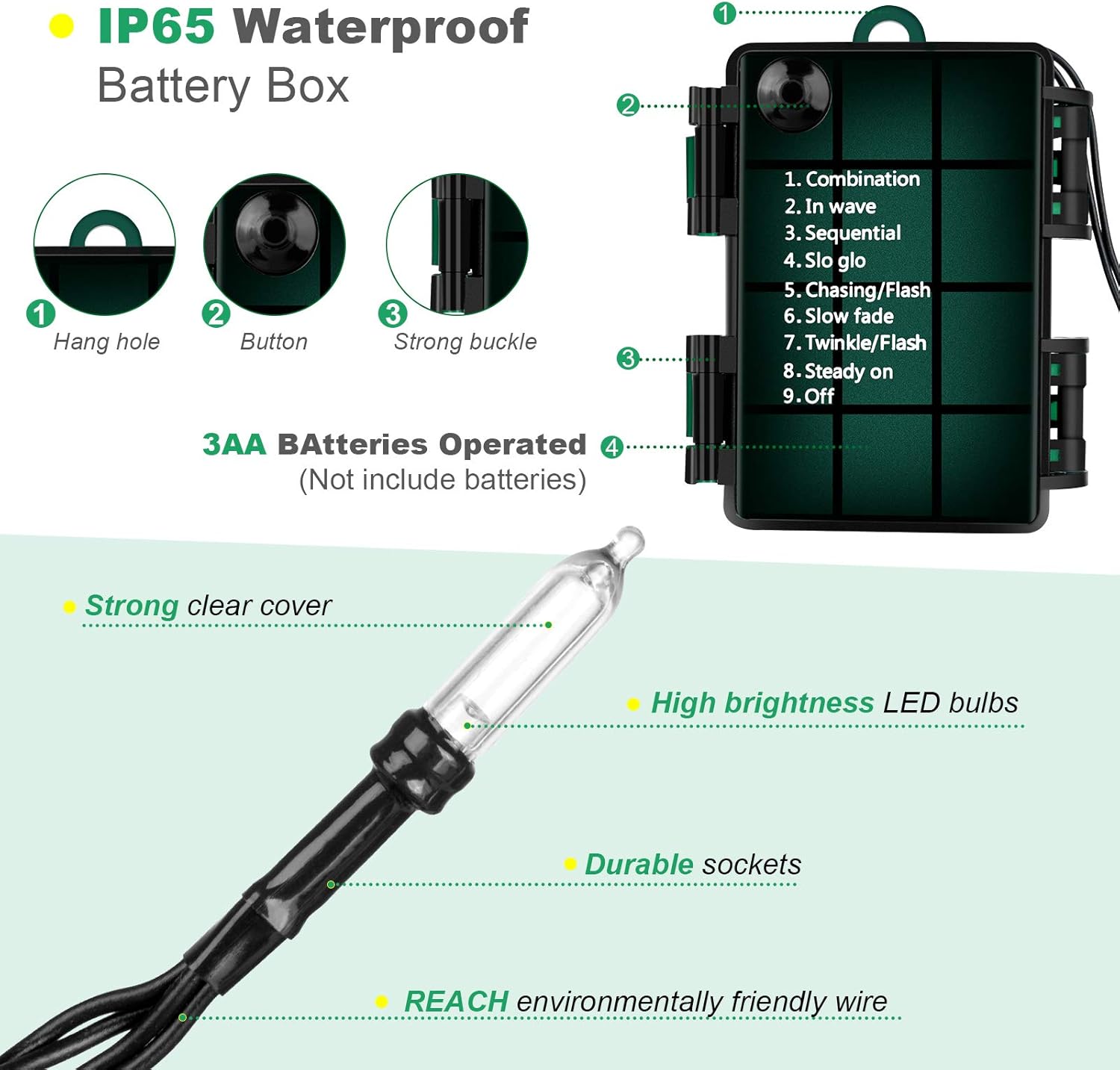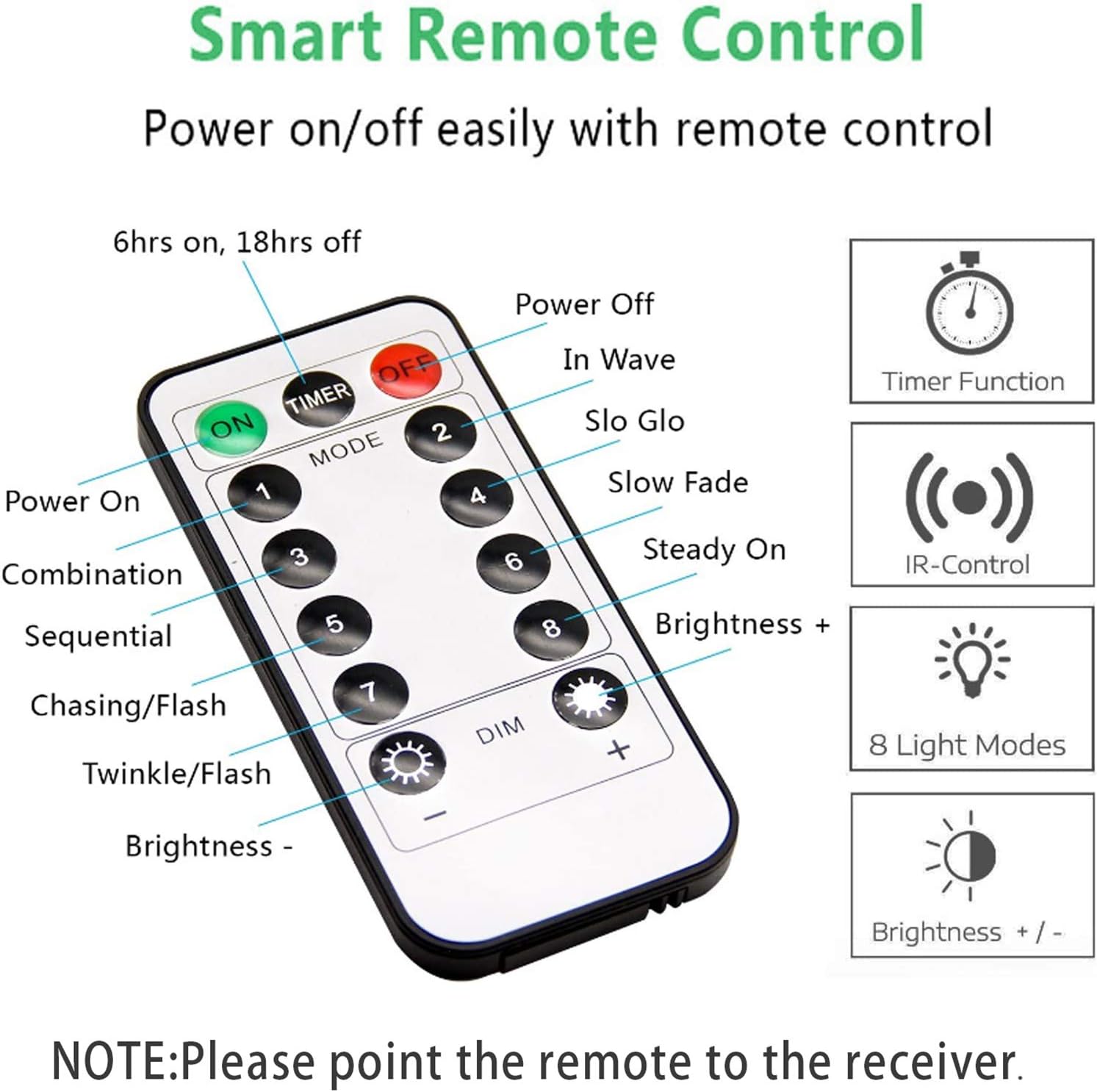 • 【8 Variable Modes】Variable mode (8 Modes) and brightness settings provide the perfect solution for your decorative lighting needs.With 13 keys remote control and 1 button on the battery box, you can adjust the brightness or switch to in waves,combination, sequential, slo glo, chasing/flash, slow fade, twinkle/flash,and steady on.