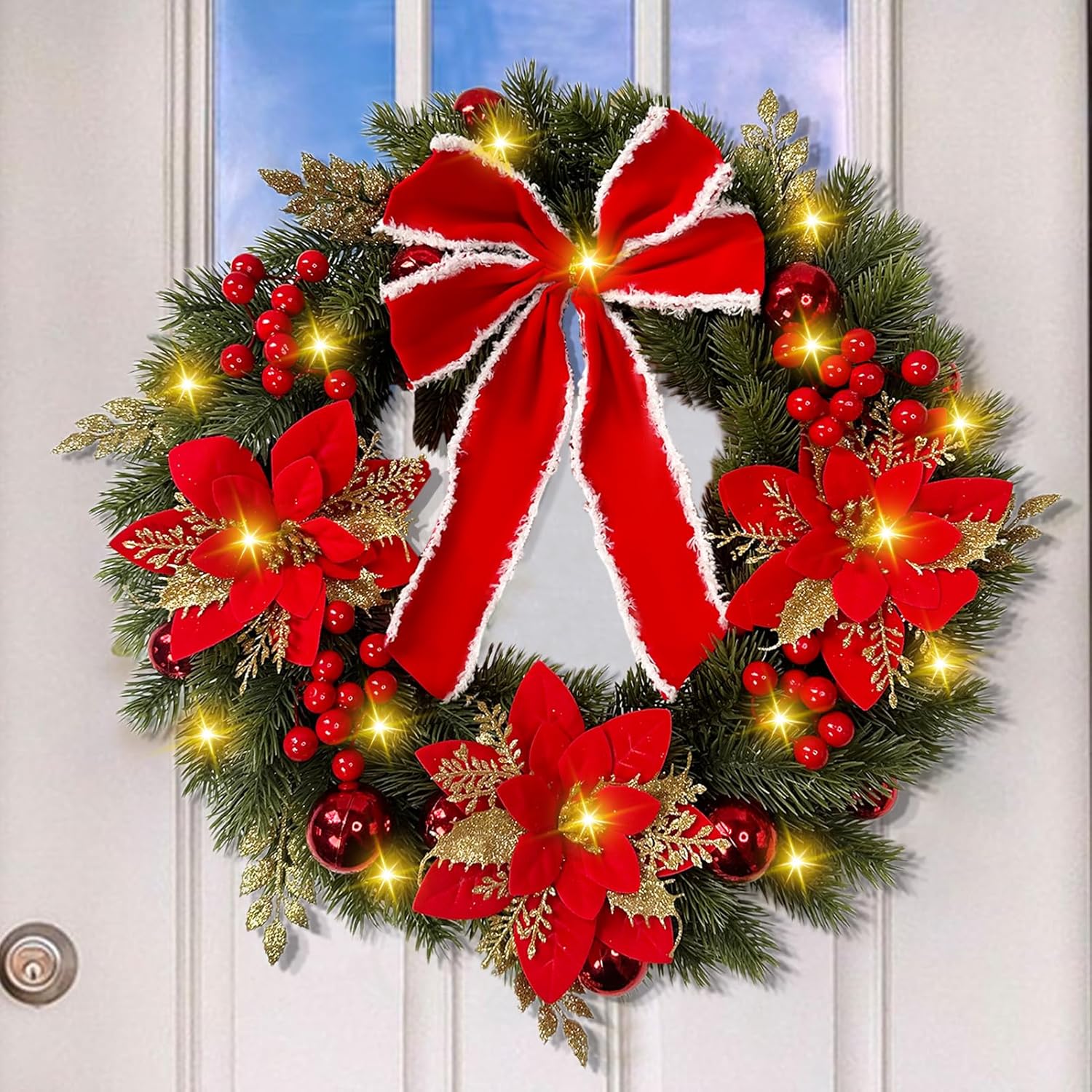 【30 LED Lighted Artificial Wreath with Lights】Christmas Wreath has rich decorations and unique. The garland comes with an led string of 30 lights in total and is 3 meters long and requires 2AA batteries (NOT INCLUDE)make your Christmas wreath no longer simple, convenient for lighting and walking at night, accompany and warm you every winter night.【Pine Garland】Lighted artificial Christmas wreath is 18 inches wide and decorated with pine cones, LED string lights, life-like pine needles, realistic red berry clusters, beautiful poinsettia flowers, red bow. Suitable as an indoor or outdoor Christmas decoration, hanging this handcraft wreath decoration on front door, wall, window, fireplace to add a festive feel to the house.