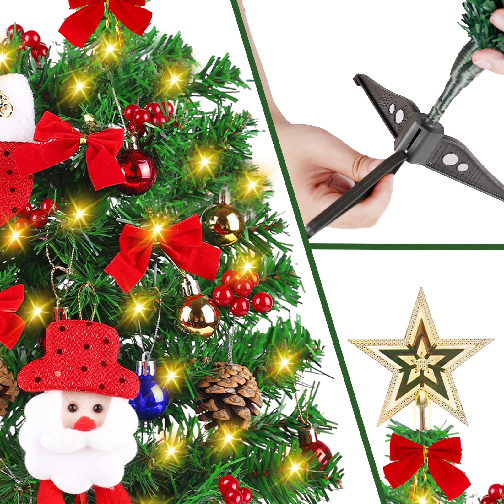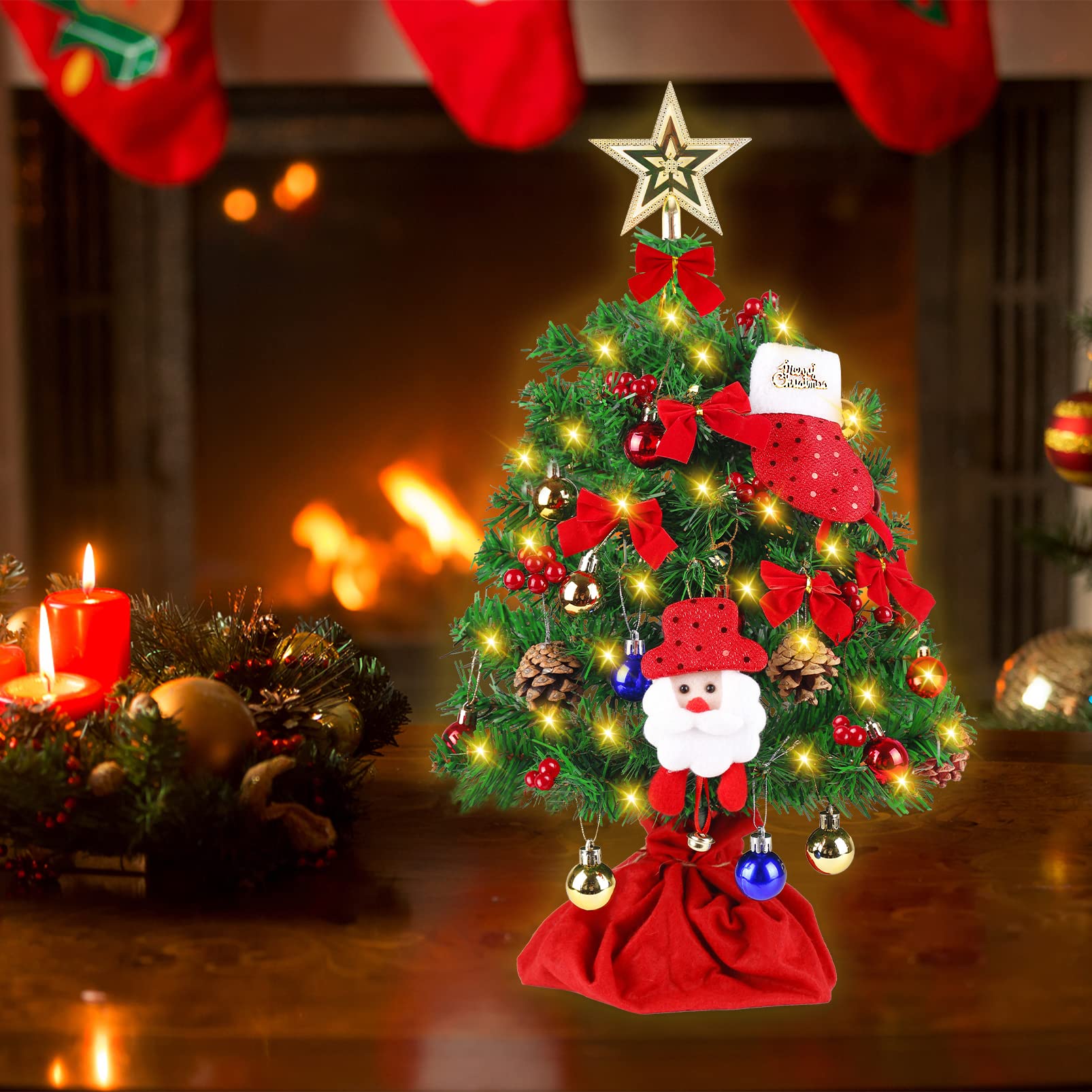 2 Ft Little Tabletop Christmas Trees Led Lights Artificial Pre-Lit Decoration And Ornaments Mini Xmas Decorated Topper Star Bow Miniature Snowman Indoor Small Desktop Potted Balls Battery Operated Set