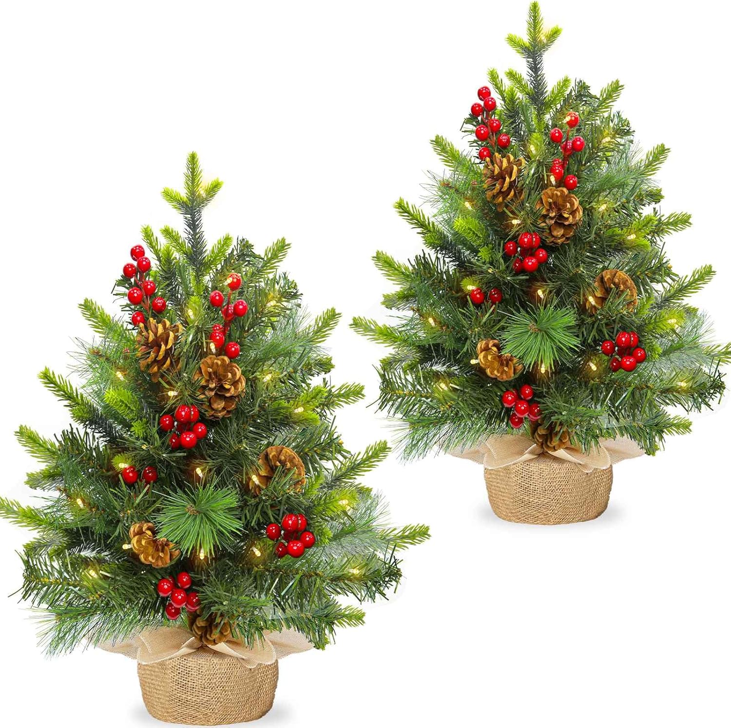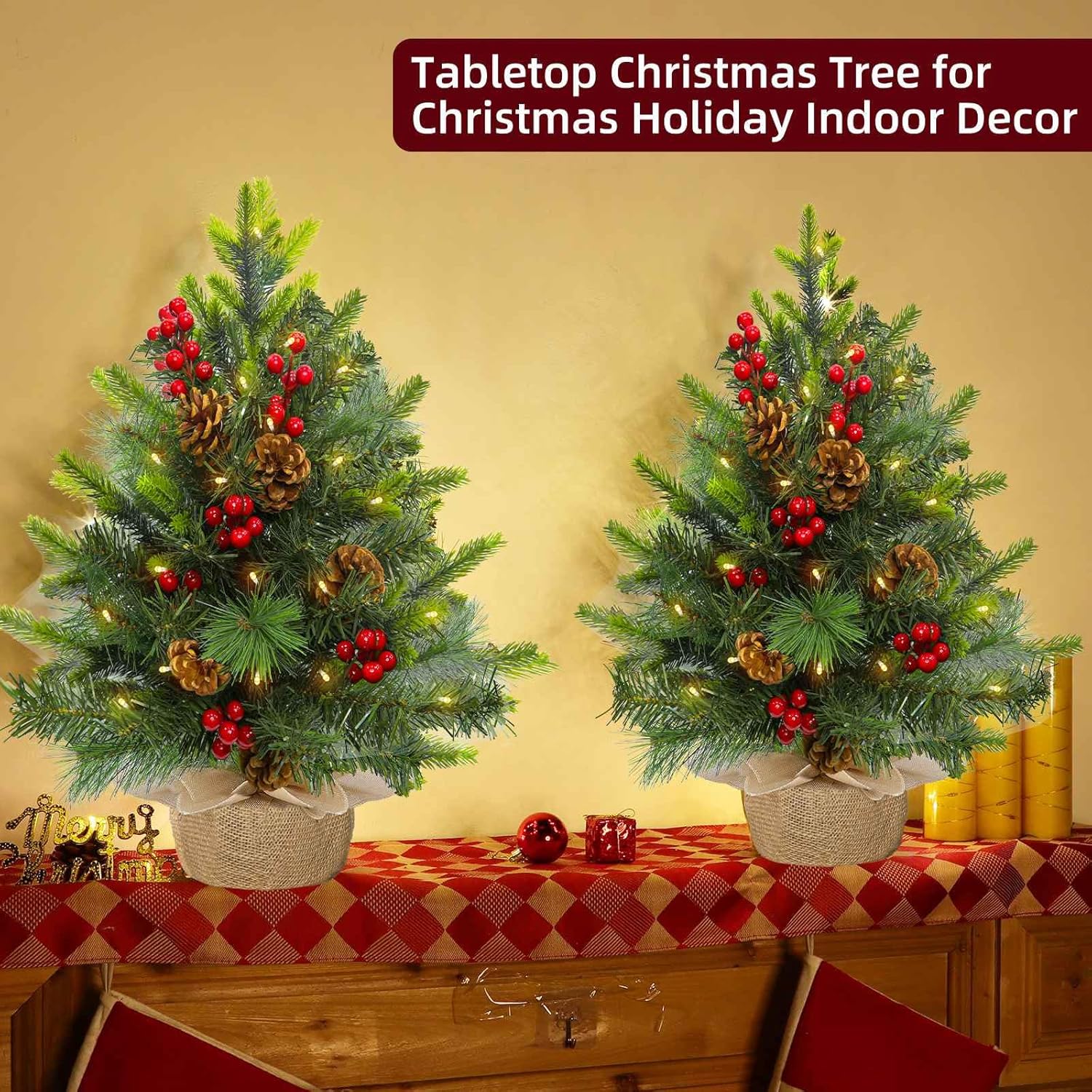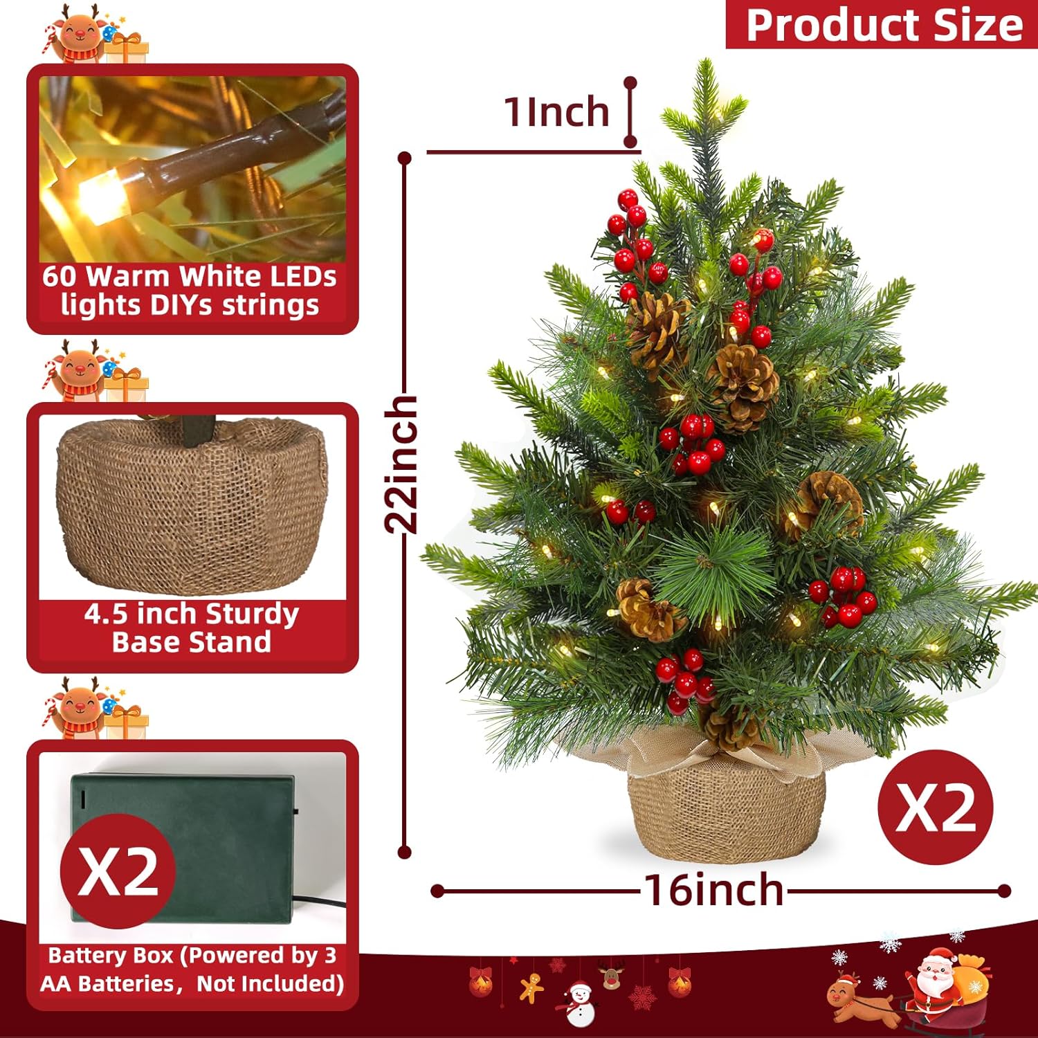 2 Pack 22 Inch Table top Christmas Tree with 60 LED Lights Timer, Realistic-Feel PE Artificial Small Christmas Trees Warm White Lights Pine Cones Red Berried, Xmas Mini Tree for Indoor Home Holiday
