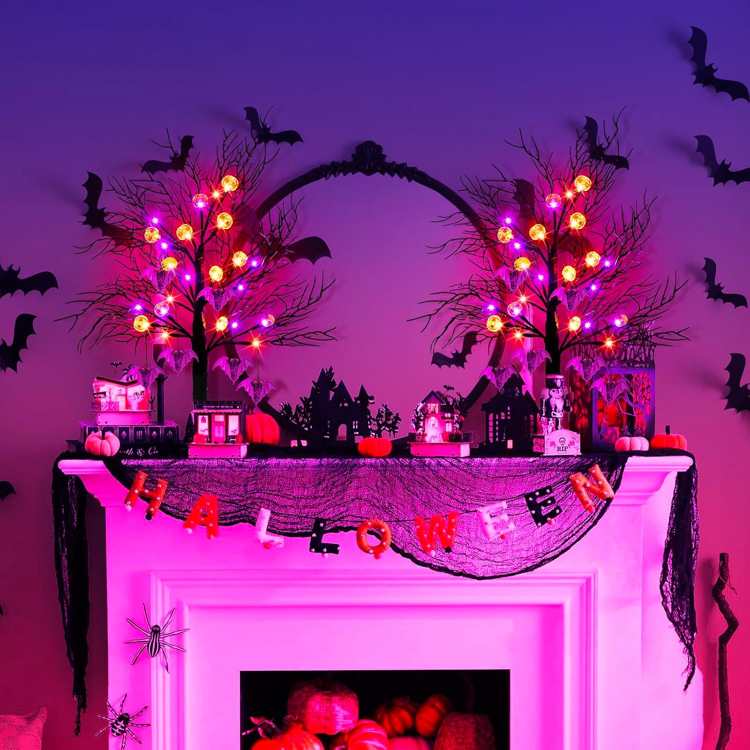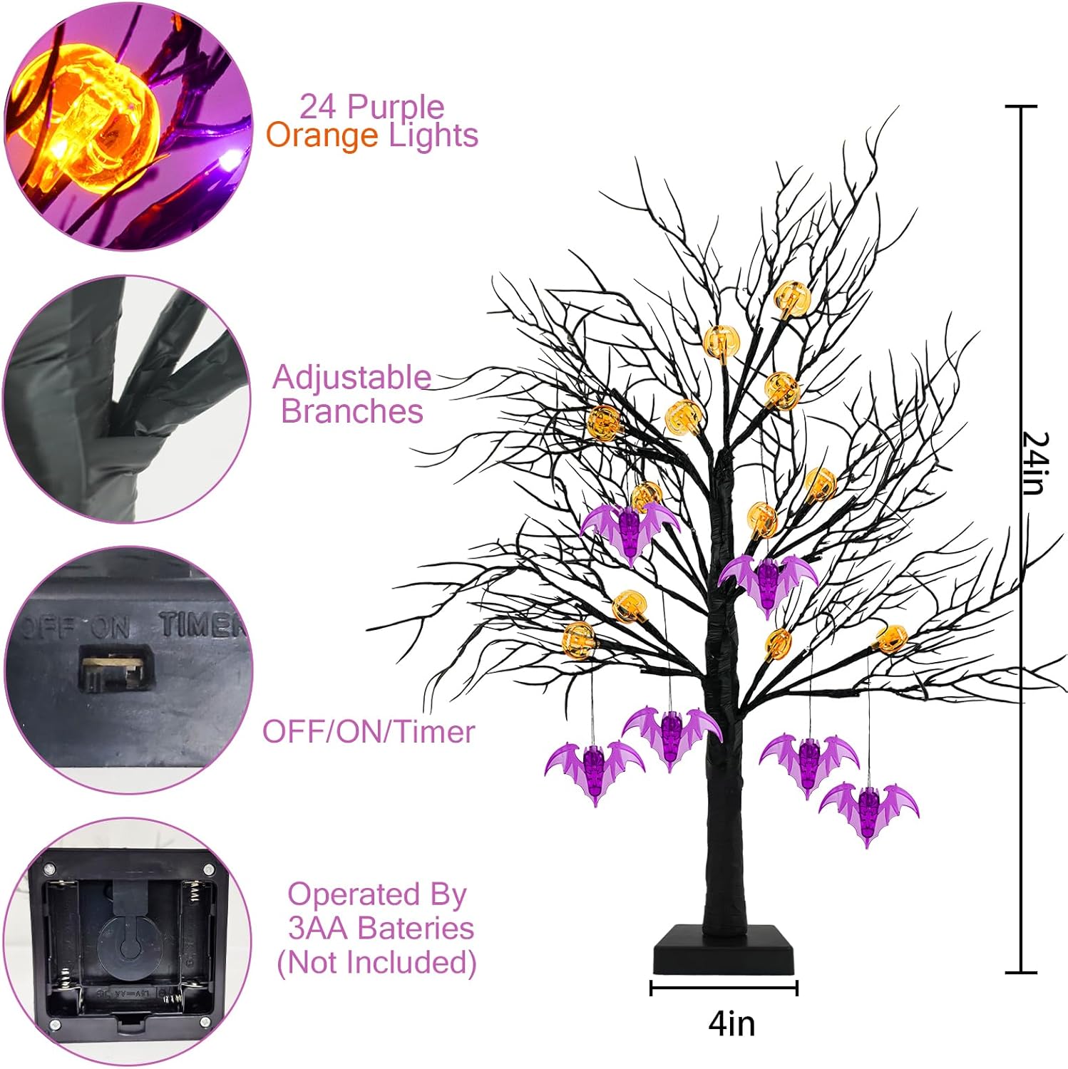 2 Pack 24 Inch Black Halloween Tree Lights, 24 LED Light Up Spooky Tree with Orange & Purple Pumpkin Bat Lights Battery Operated Tabletop Halloween Tree with Timer for Halloween Decorations