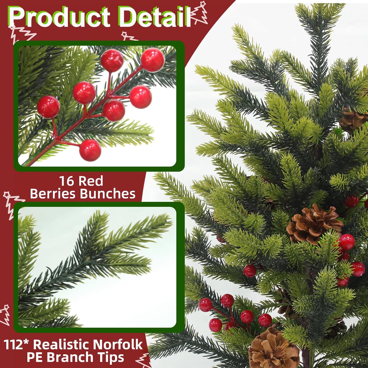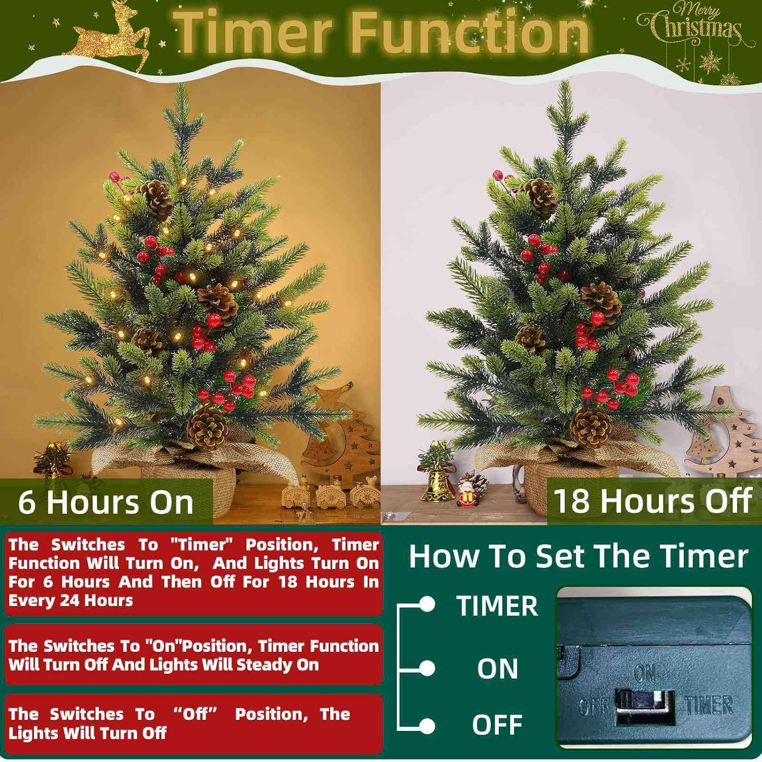 2 Pack 24 Inch Tabletop Small Christmas Trees with Lights Timer Full PE Pine Artificial Mini Christmas Tree Realistic-Feel Tips Red Berries Pinecone Stable Base Christmas Decorations Indoor Xmas Home