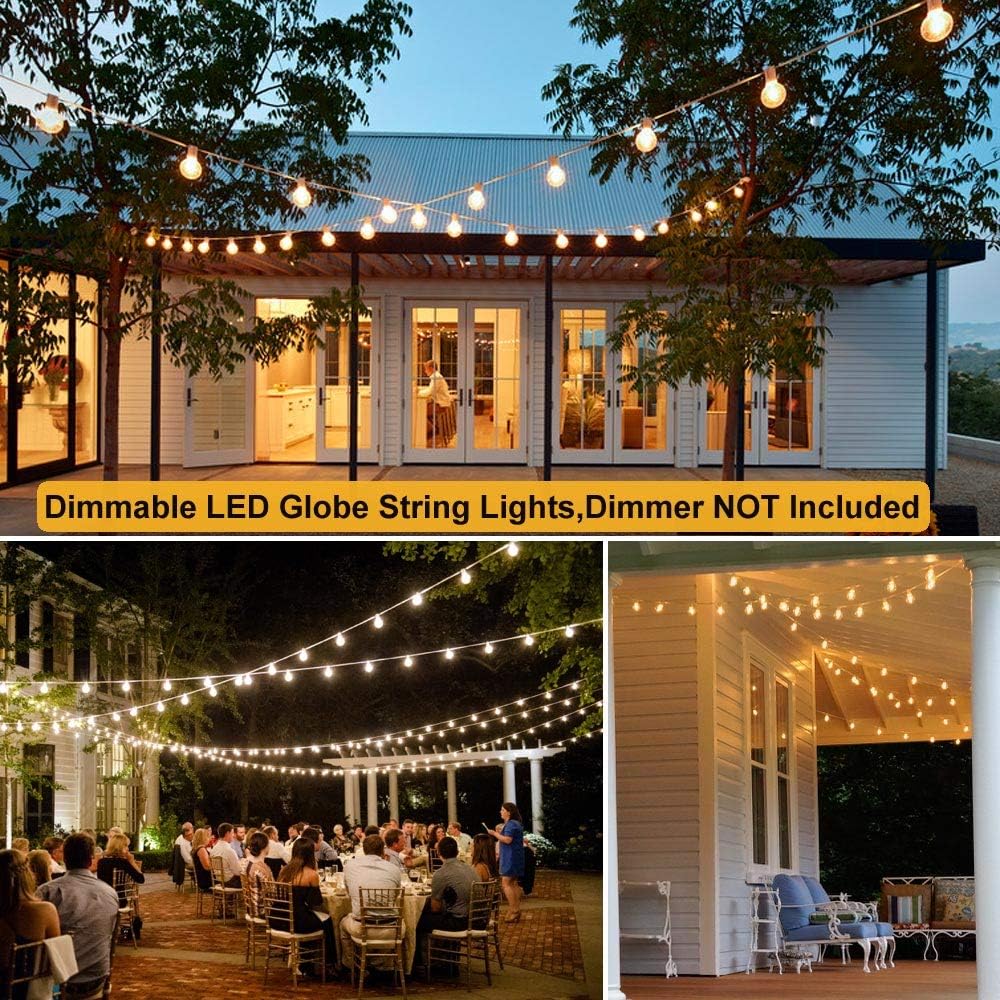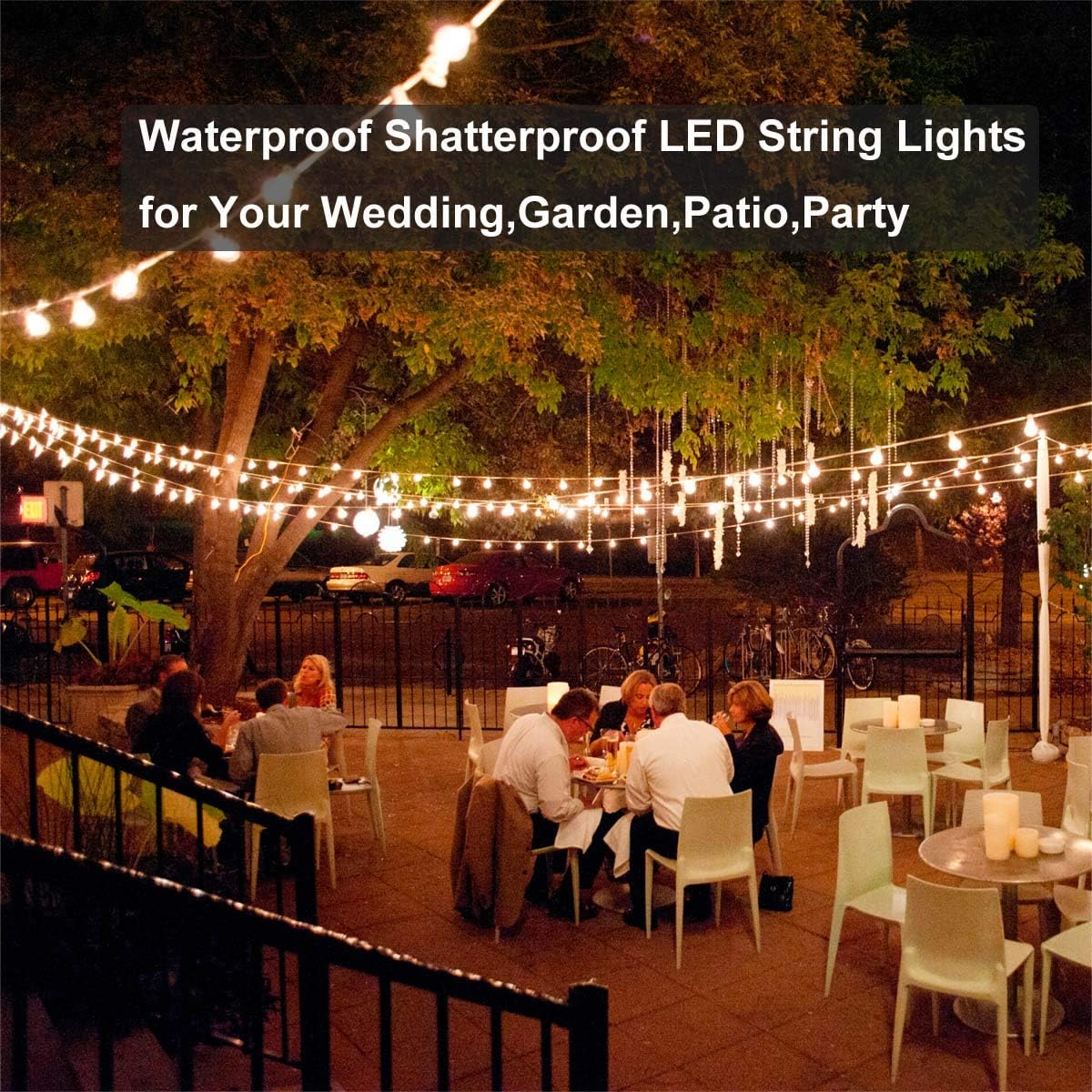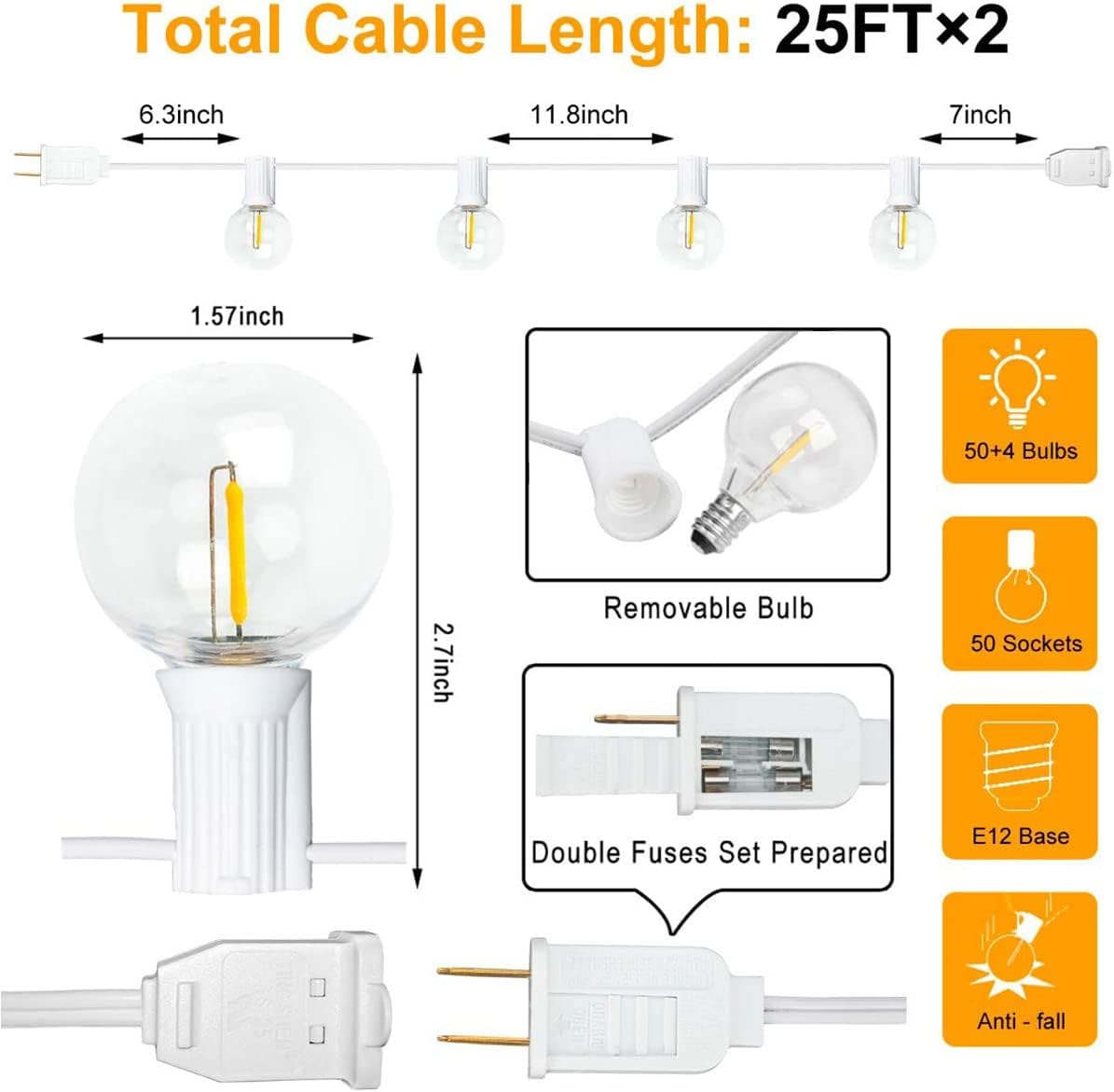✔【2 Pack 25FT G40 White String Lights】 -- This white led string lights totally with 50 sockets(E12 Base),54 plastic clear G40 Bulbs( 2 spare),Shatterproof,save over 90% energy over incandescent bulbs.The outdoor string lights 2700K soft warm lighting is perfect for creating romantic ambience for wedding,family reunion,party and etc. ✔【UL LISTED & Commercial Grade】 -- The heavy - duty insulating layer construction LED Bistro string lights are d with UL certification for safe use.String lights for outside IP44 waterproof,outdoor patio lights will last through sun,rain,wind,snow and any weather condition.The plastic clear LED Shatterproof Bulbs won't break if dropped.