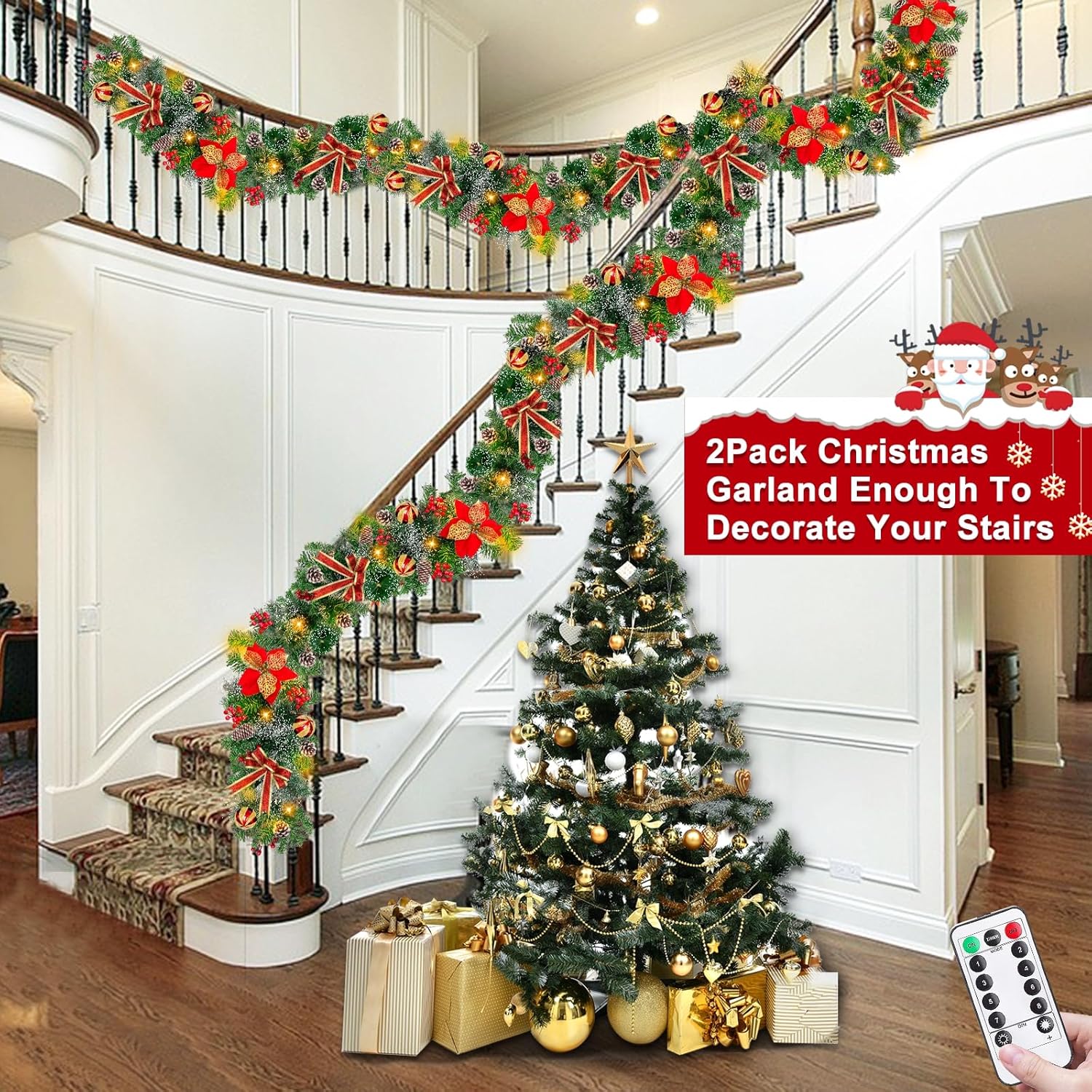 2 Pack prelit Christmas garlands: 2 pack total 18 Ft 100 LED Christmas garlands, each is 9 Ft by 10 inch, 50 warm white LED lights, thick branches tips, red and golden spirals balls, Christmas poinsettia, bows, pine needles, snowy pine cones,red berriesBattery powered & 8 modes: Require 3AA batteries(not included) . 8 Flashing modes include combination, In waves, sequential, slow glow, chasing, slow fade, flash, steady on. No plug needed. The green light wire and battery box are easy to hide