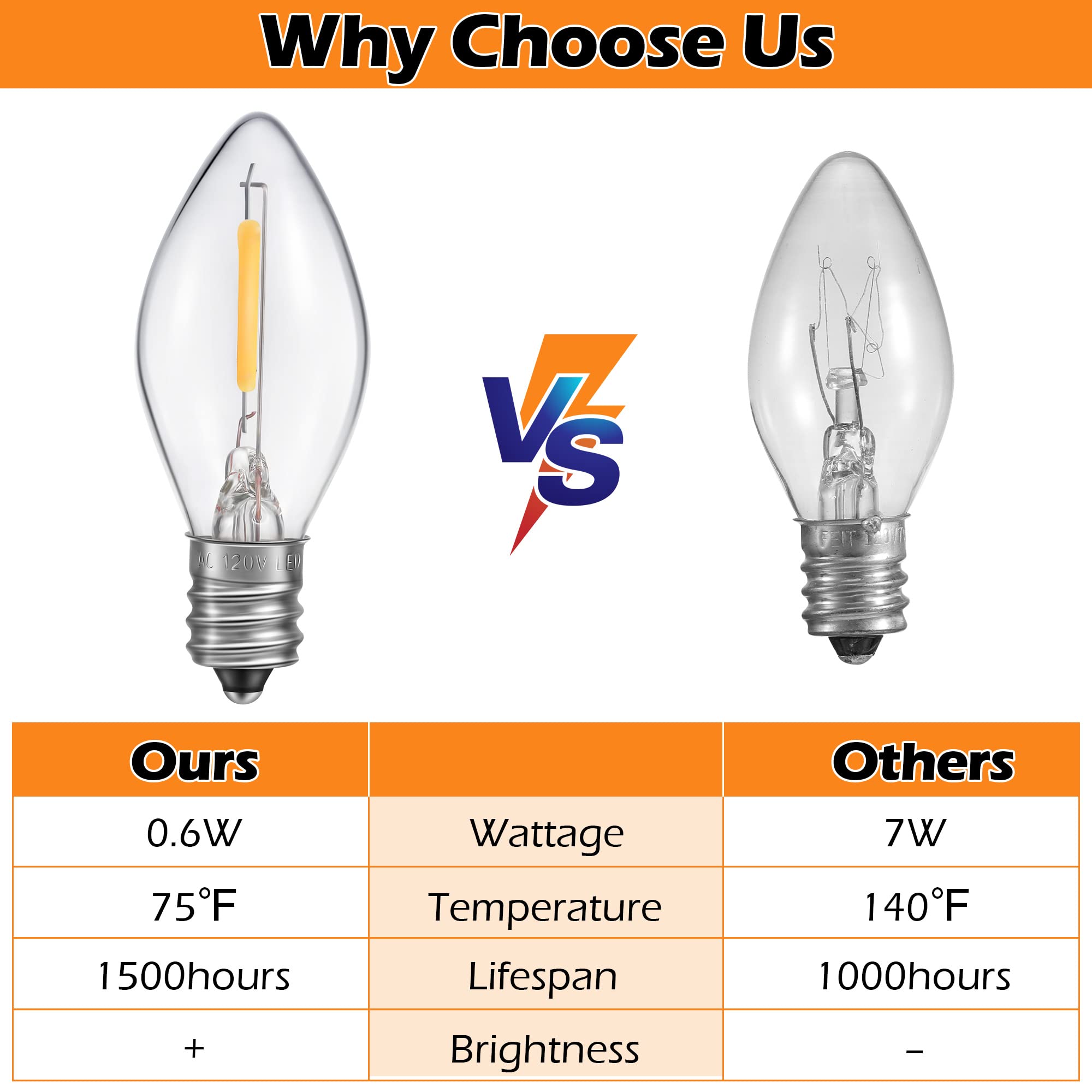 • Energy Saving C7 String Lamps: C7 LED blow mold lamps replacement cord lights have less energy consumption, lower watt, safe and energy saving, can be touched by hand, will not cause burns, safe for children to use