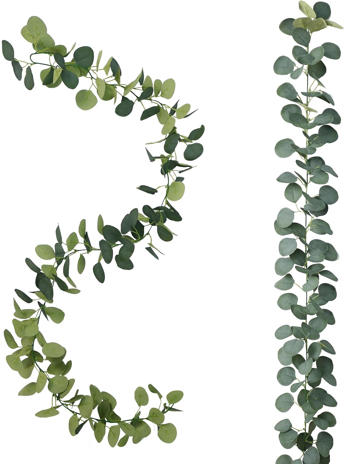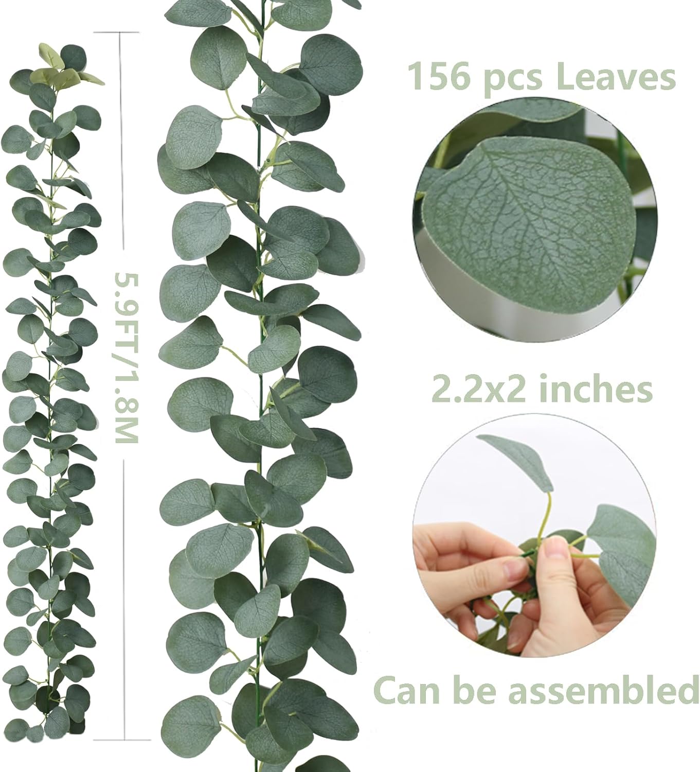 Size: Each eucalyptus garland is about 5.9 feet with 156 leaves. The total length is about 11.8 FT. The leaf size is about 2.2 x 2 inches, and the eucalyptus leaves are detachableMaterial: The artificial silver dollar eucalyptus garland is made of silk and plastic, it is lifelike and durable, and feel vivid. Each leaf is meticulously handmade. If leaves falling off, you can directly re-insert the leaves onto the vine.