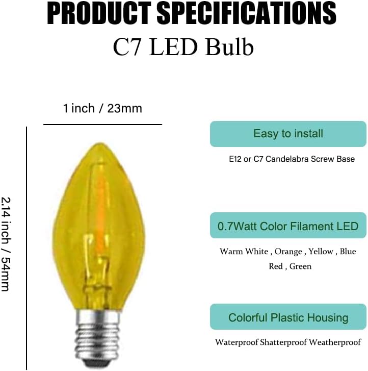 2 Pack C7 Yellow LED Replacement Christmas Light Bulbs,E12 Candelabra Base, Shatterproof Plastic, for Christmas Outdoor String Lights (Yellow)