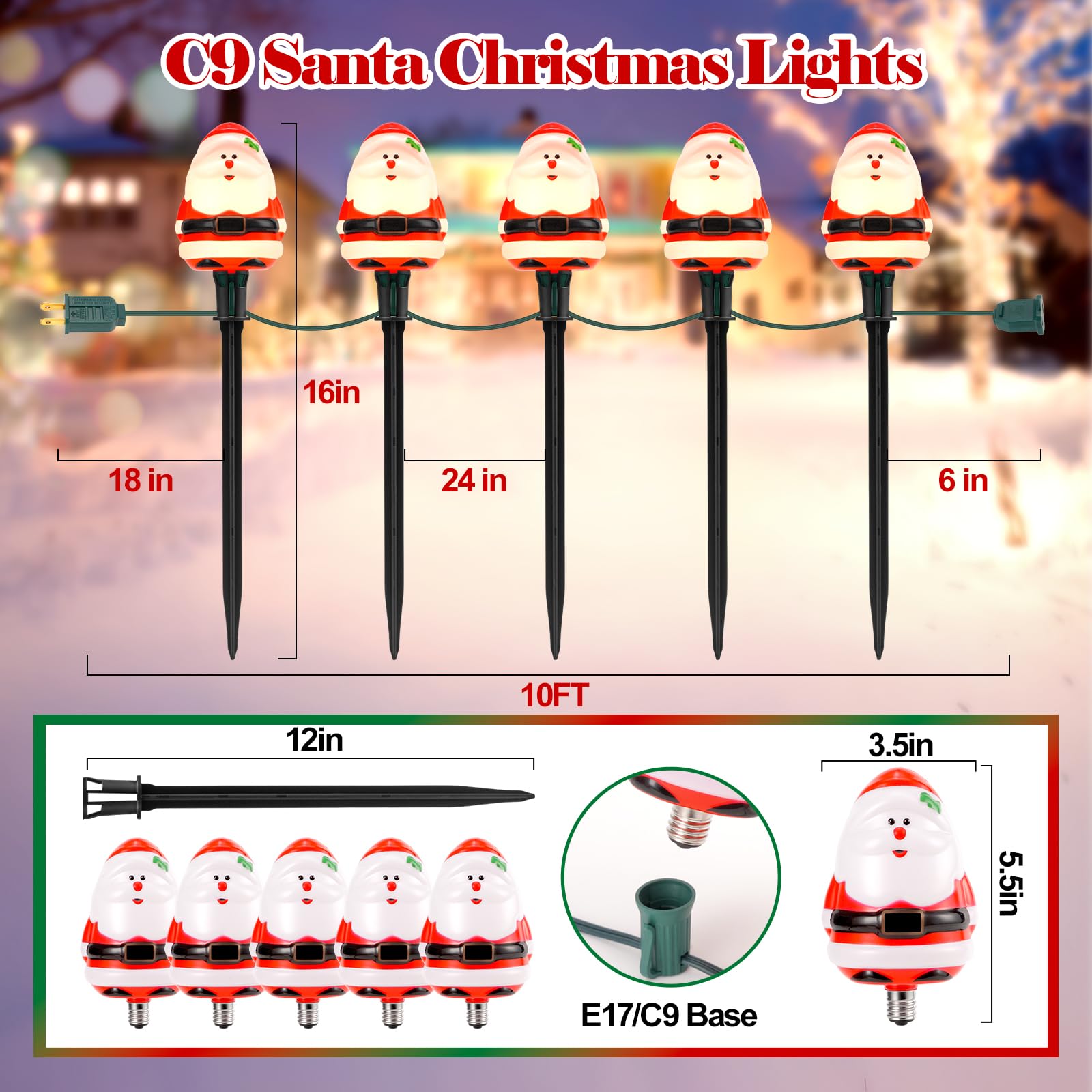 2-Pack Christmas Pathway Lights Outdoor with 5 Santa Lights, 10FT Santa Claus String Lights with Stakes, Plug in LED Xmas Path Lights, Waterproof Outside Christmas Decorations for Yard Lawn Walkway