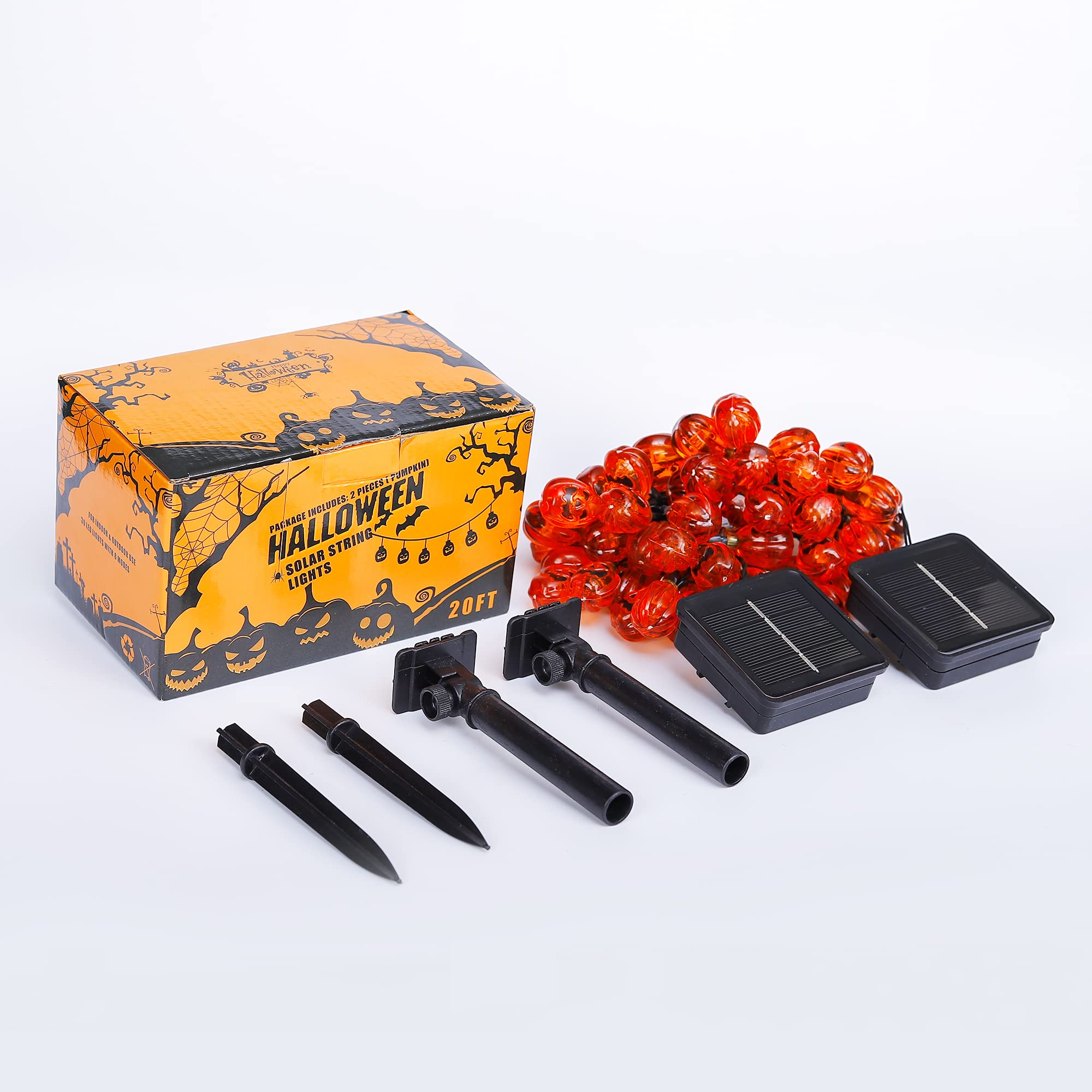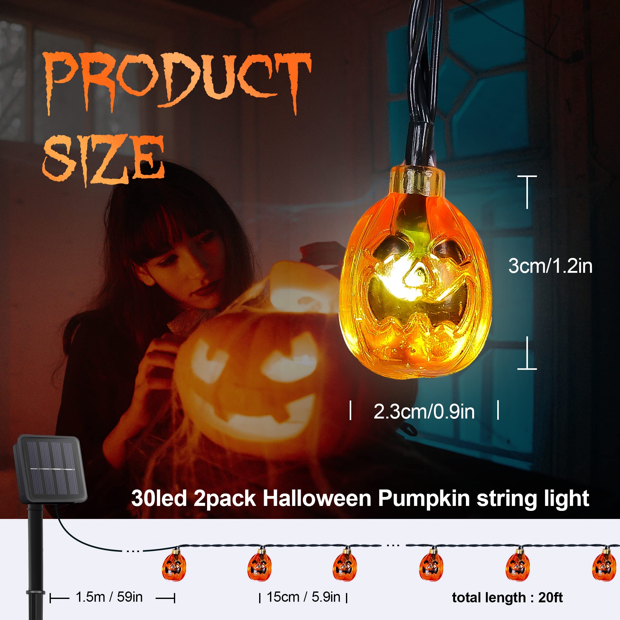 Solar pumpkin String Lights:Get 2 in 1 package Qunlight solar pumpkin string lights is with 30LEDs, 20ft Long. These LED string lights will make a beautiful decoration at your home, office, or outside front yard for Halloween, Christmas, or any party. 8Modes to Choose with Light Sensor: Every Halloween String Lights comes with Solar Panel for your convenient decoration. With 8 modes: combination, in waves, sequential, slogs, chasing/ flash, slow fade, twinkle/ flash, and steady on.This solar Christmas light is built in with light sensor, it can light on in the dark, light off and charge in bright conditions automatically.