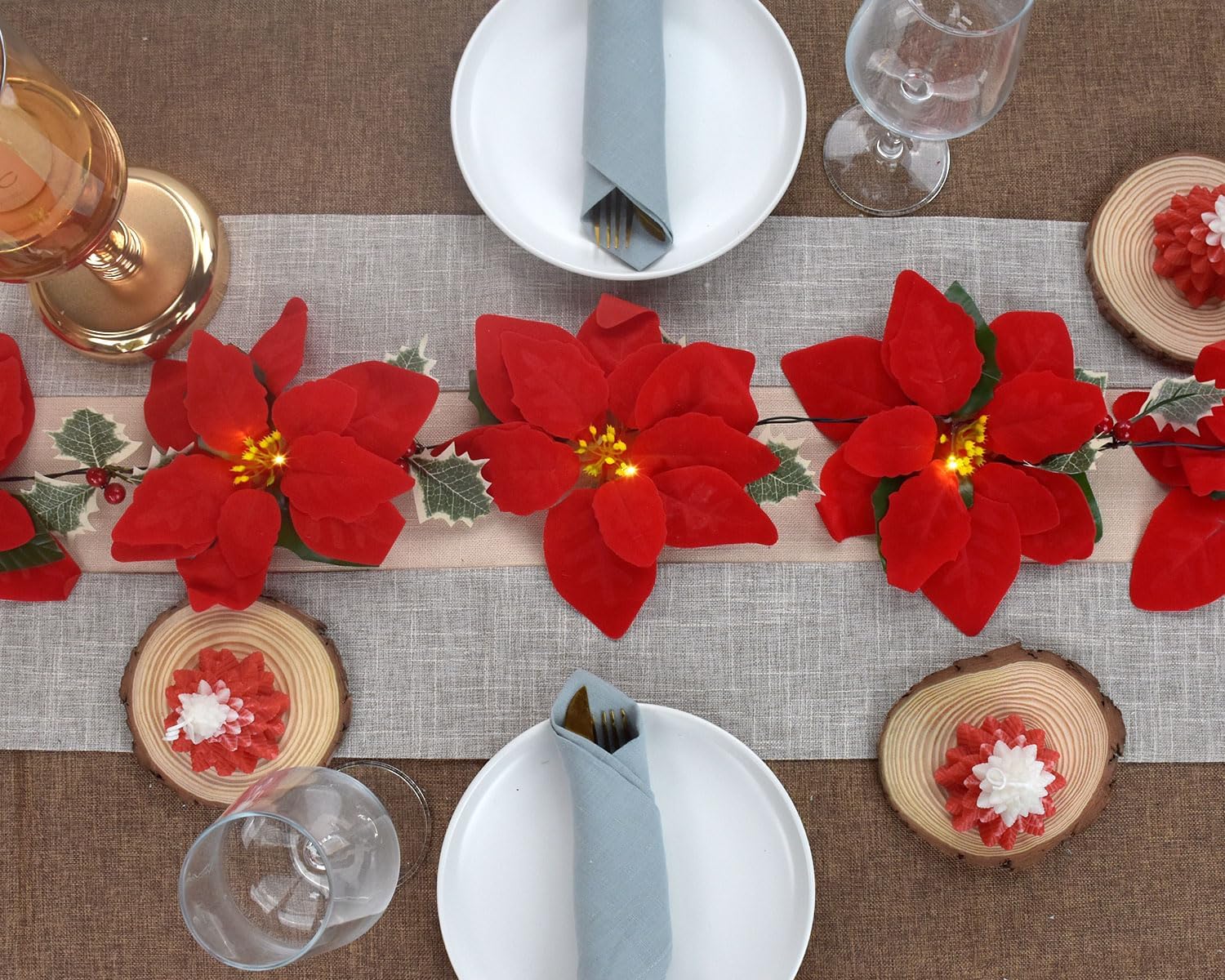 2 Pack Poinsettia Garland Christmas Decorations, Velvet Silk Artificial Flowers 6ft Garland with Red Berries and Holly Leaves for Indoor Outdoor Party Tree Decor