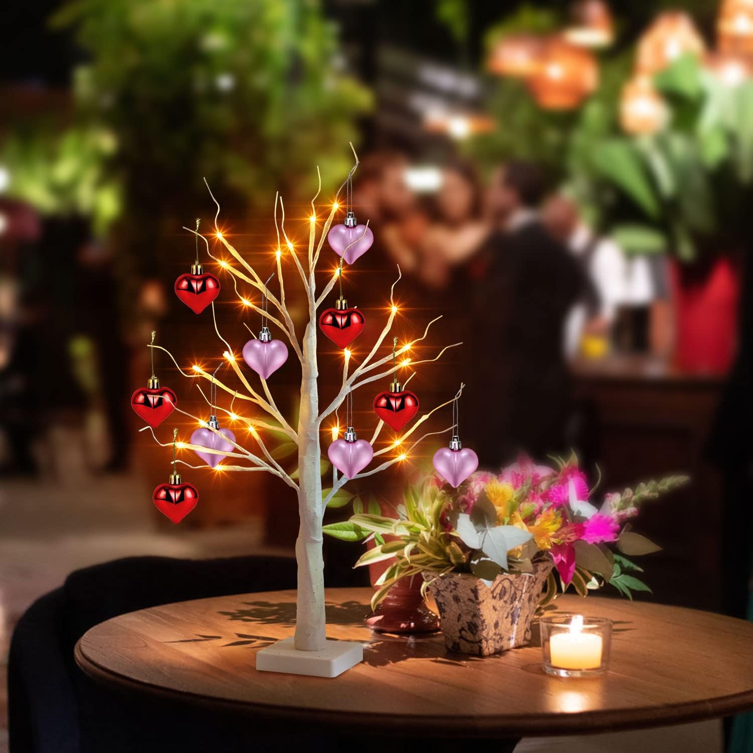 2 Pack Prelit White Birch Tree -2FT Valentines Tree with 10 Pink & Red Heart-Shaped Ornaments, 24 Warm White LED, Battery Operated, 6-Hours Timer, Tabletop Lamp for Home Party Wedding Xmas Decor