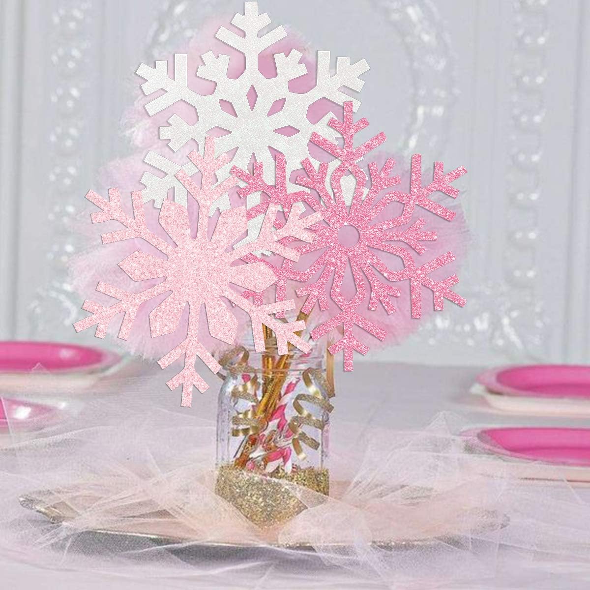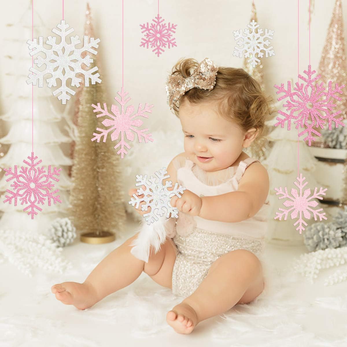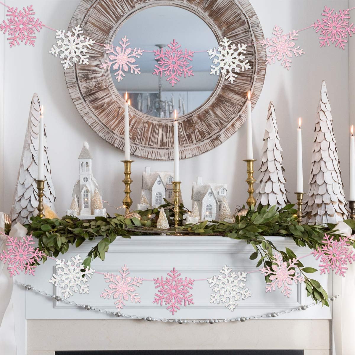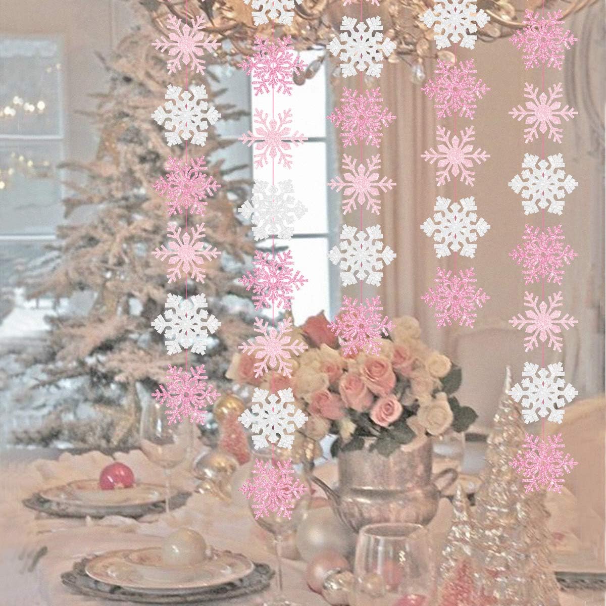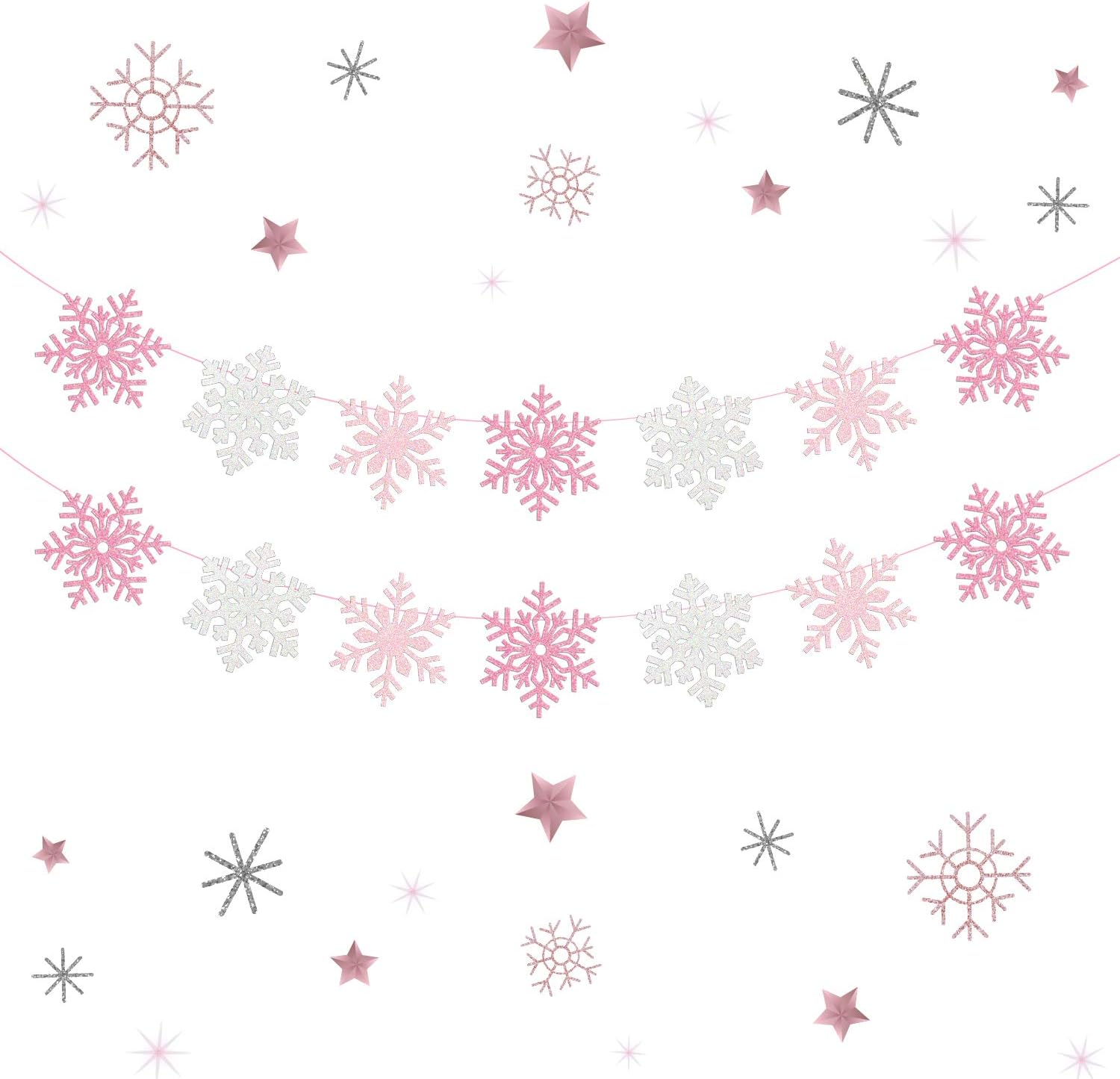 2 Pack Snowflake Banner Garland Ornaments Decorations Pink & White for Christmas Party Girls Winter Wonderland Birthday Baby Shower, Holiday Home Table Decor