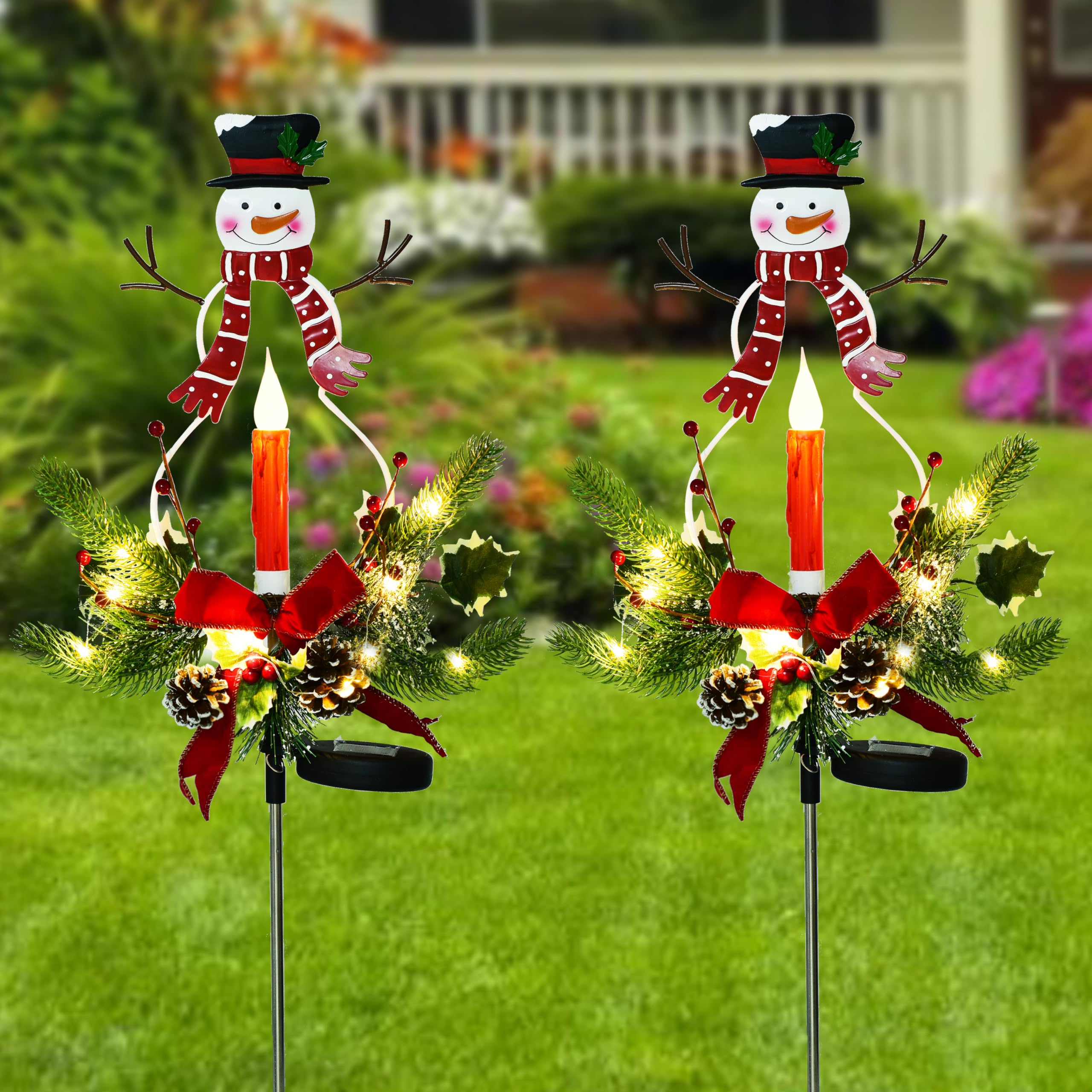 2 Pack Solar Christmas Light Outdoor Decoration Clearance, LED Candle, Snowman Christmas Light with Faux Pine Cones, Foliage Accents Garden Decorative Stake