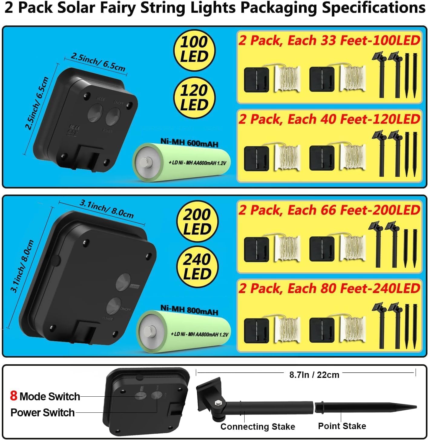 Super - Bright LED Lights - 8 light modes (waves, combination, fading, fireflies, chasing, fading slowly, steady-on,) are selectable. Steady 360 degree viewing angle they illuminate in every direction. Make every night starry nights. Glow lends a cozy and festive touch to varied areas such as garden, patio, bedroom, living room, deck, pool, yard, pathway, etc. d Larger Panels - Our solar fairy lights equipped with 2 premium silicon solar panels and inbuilt rechargeable batteries (33ft&40ft d 2.52.5 inch solar panels 600mAh battery) (66ft&80ft d 3.13.1 inch solar panels 800mAh battery) , 8hrs auto-charging at daytime, providing twinkle shining lights above 10hrs in night