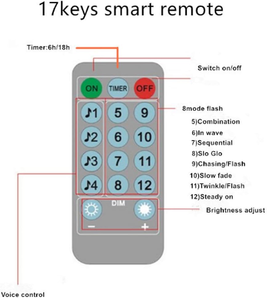 [Sound activate&12 lighting modes] With smart beat sensor,the lights can react to music and different sounds.it can perfectly sync with the music in the environment.It has 4 music mode:combintion,piecewise,synchronous jump,alternate jump,you can choose the diferent mode to fell the music rhythm.it also have 8 lighting modes which are unaffected by the sound and music,8 lighting modes:combination,in wave,sequential,slo glo,flash,slow fade,twinkle,steady on. [Adjustable brightness & Set timer]with the remote,you can adjust the brightness by DIM "+" and "-".you can also set the time by the "TIMER" key,it will on 6 hours and off 18 hours.
