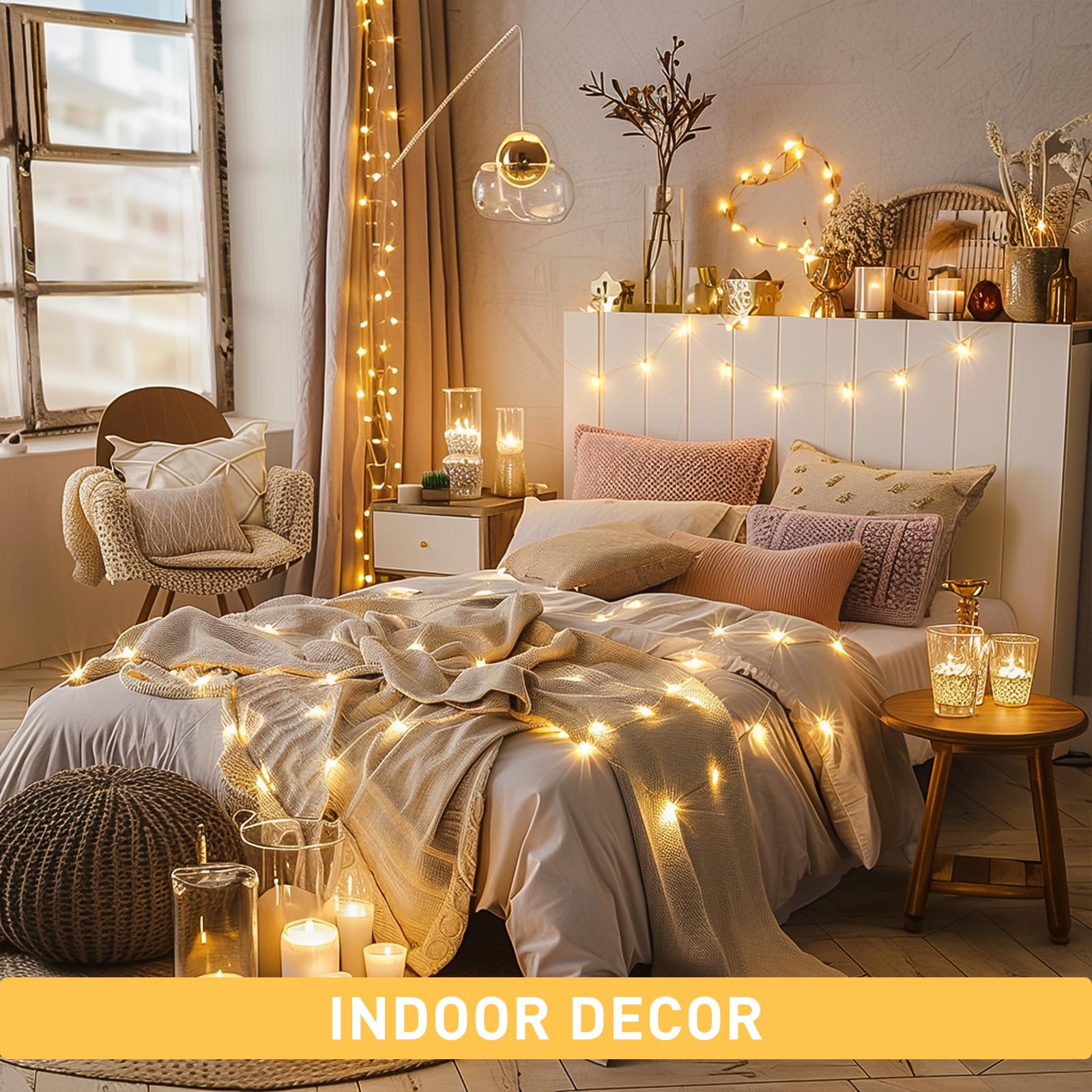 • 【Widely Used Fairy Lights】The warm white LED give off a cozy and inviting glow that is perfect for decorating your Christmas tree, wreath,mantel, or any other part of your home. Led string lights for bedroom are not only suitable for indoor decoration but also for outdoor decoration , wrap around tree trunks or gazebos, decorate your patio, garden, balcony, yard , fence make your house and garden more charming and romantic