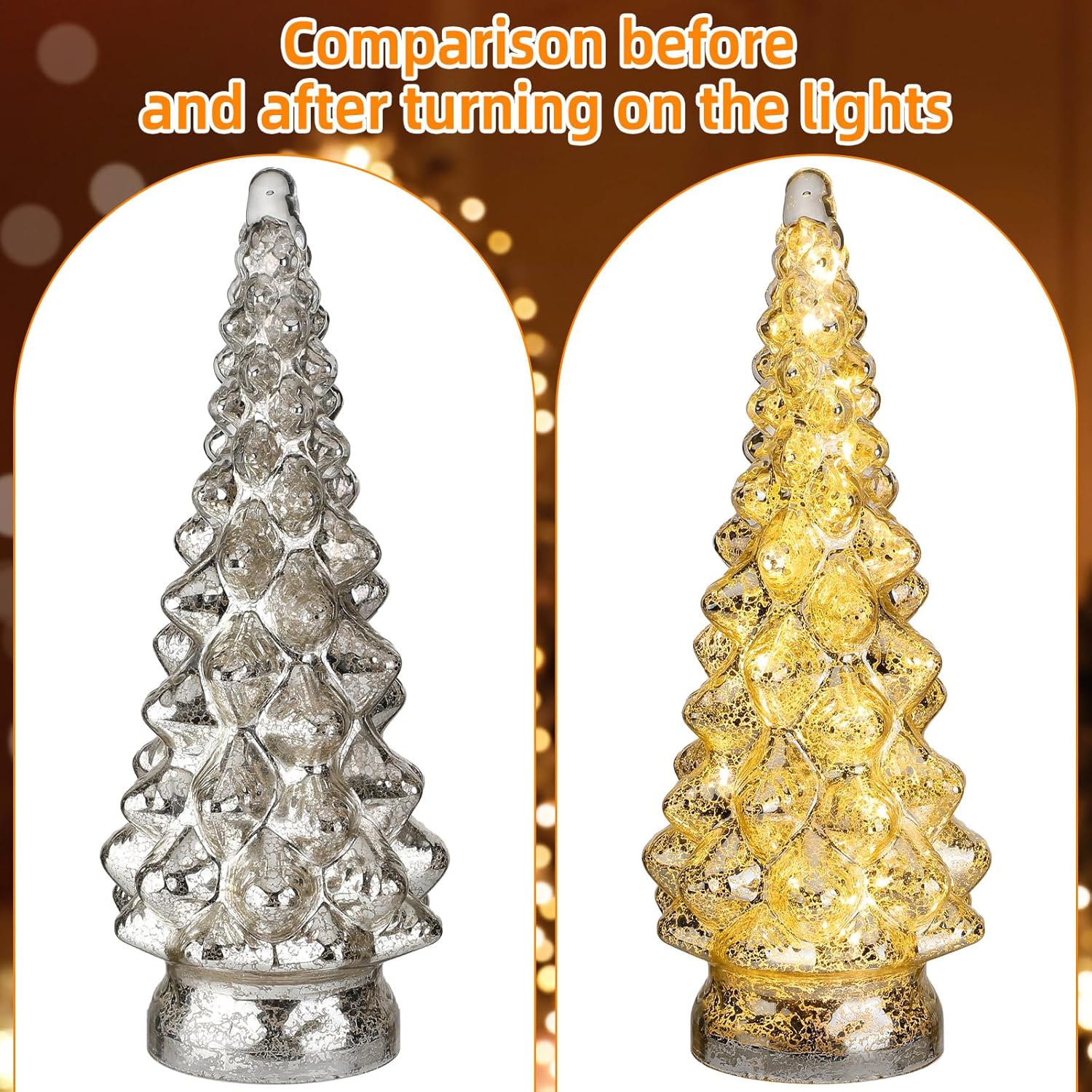 Comprehensive Package: our package includes 2 stunning mercury glass Christmas trees with lights, you'll only need to add batteries to light up your home with these breathtaking pieces, the twofold quantity ensures that you can either place them together or split them across rooms for a consistent Christmas themeChristmas Tree Design with LED Light: our mercury glass decor are not just ordinary ones, it comes embedded with LED lights that brighten up any space with a soft, warm glow, the tree design, paired with radiant lighting, paints a cozy, enchanting winter night; Warm note: there are no batteries in the light, and you need to buy them by yourself