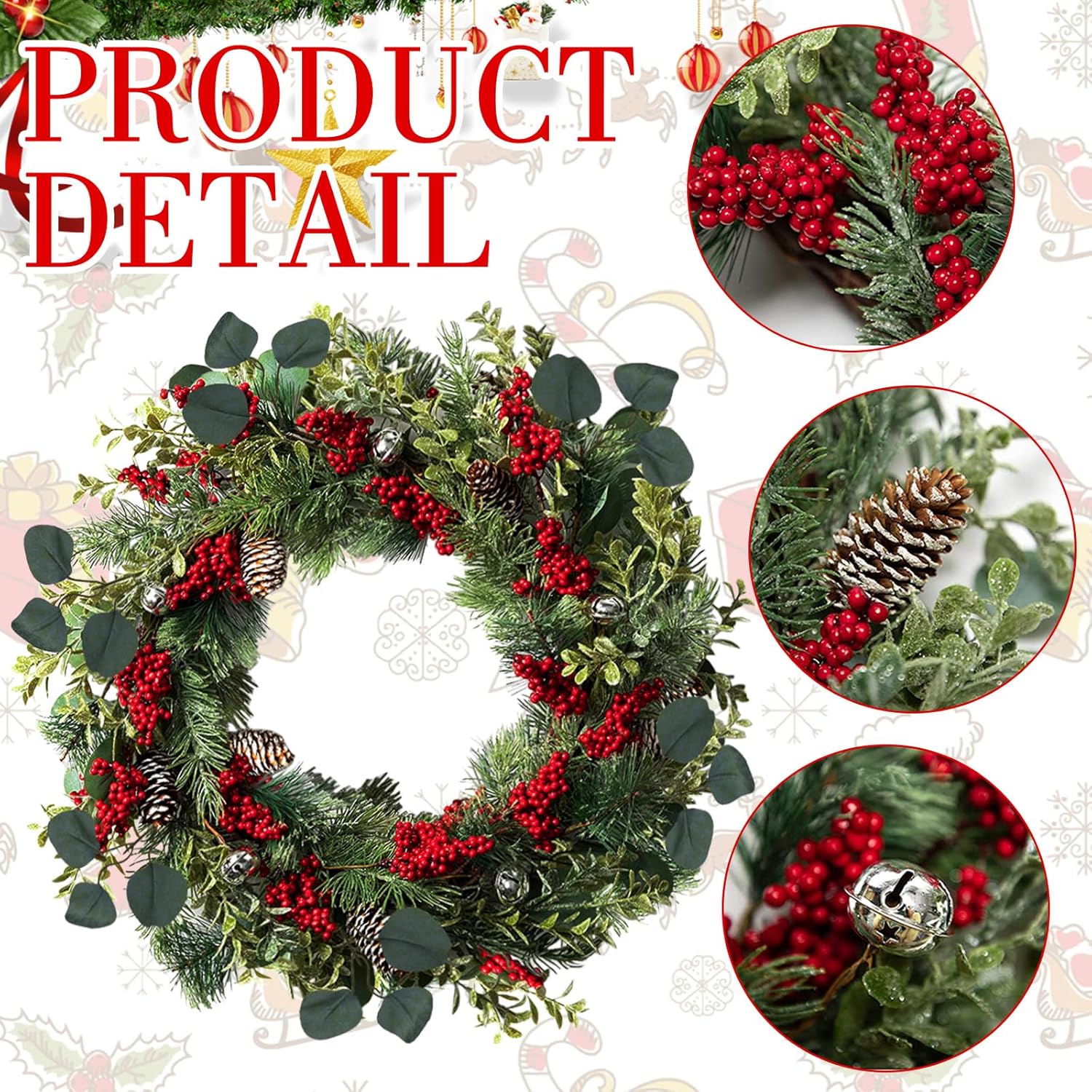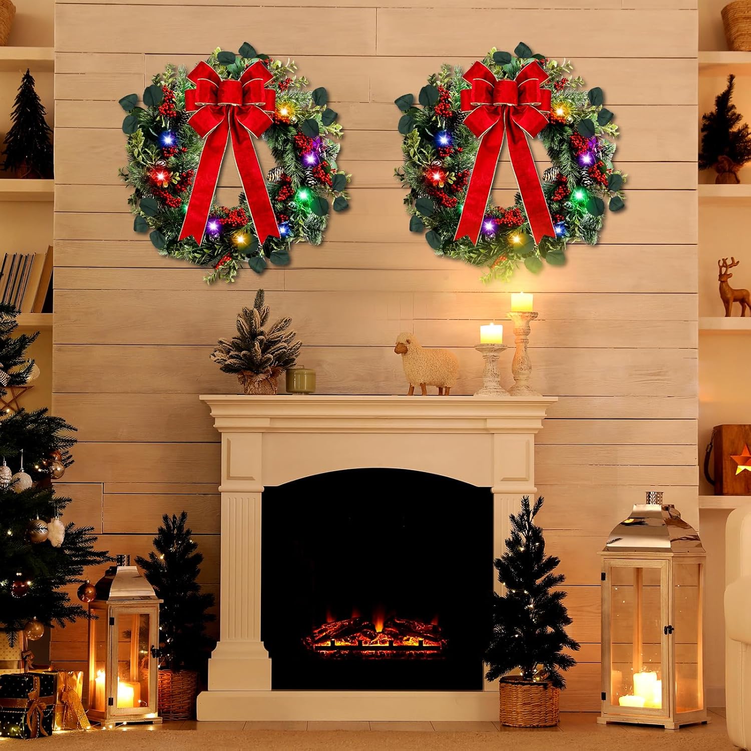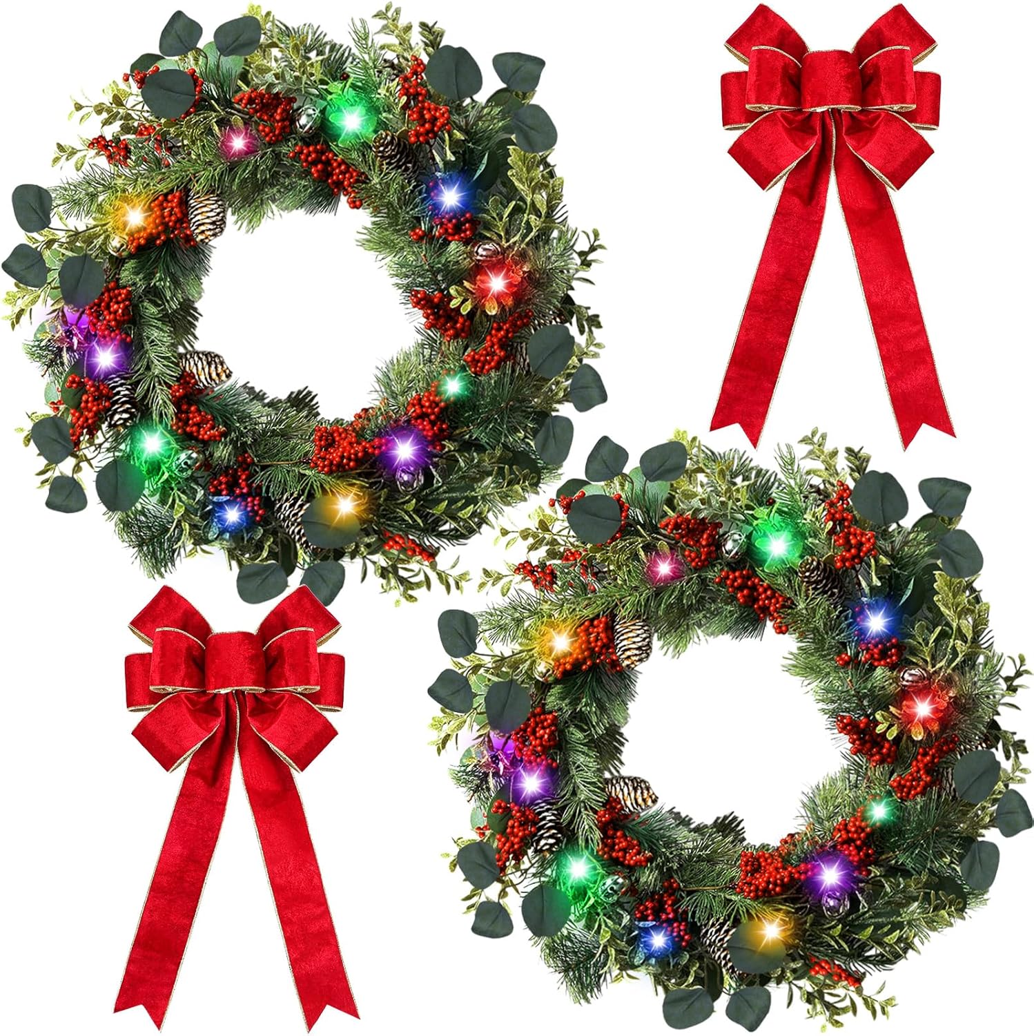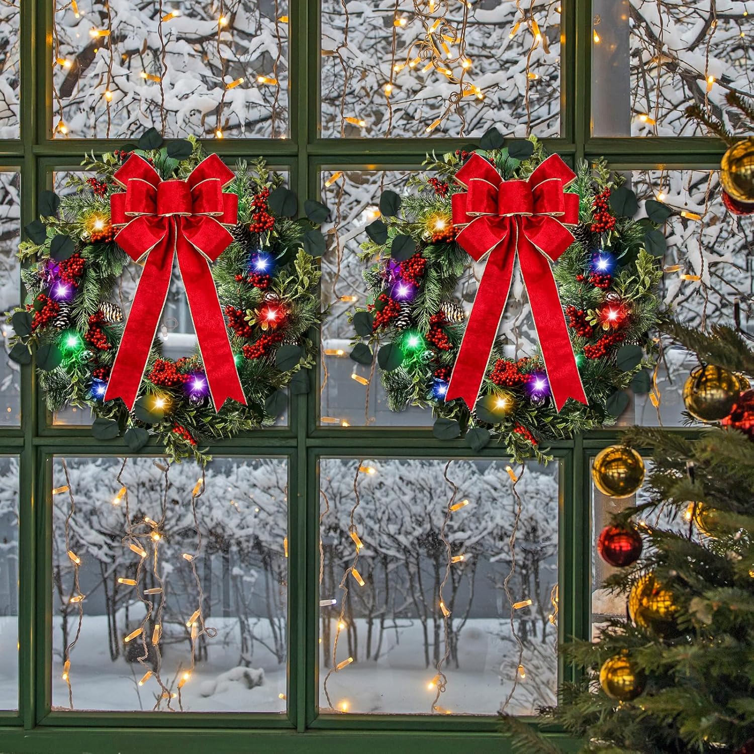 2 Pcs 16 Inch Pre Lit Christmas Wreath with Large Red Bow, Battery Operated Xmas Wreaths, Artificial Front Door Wreaths, Adorned with Red Berries, Pine Needle, Holly Leaves Xmas Door Decor