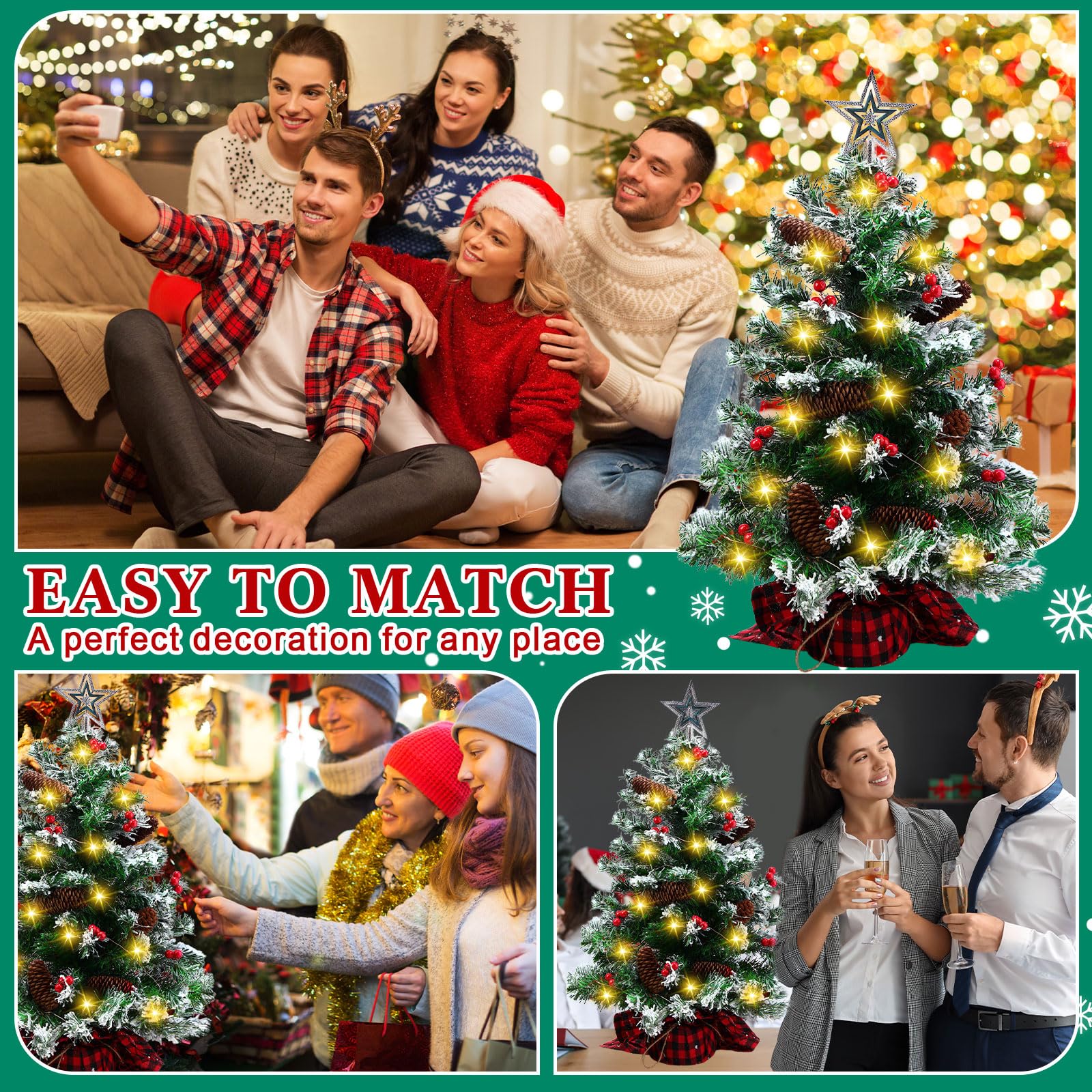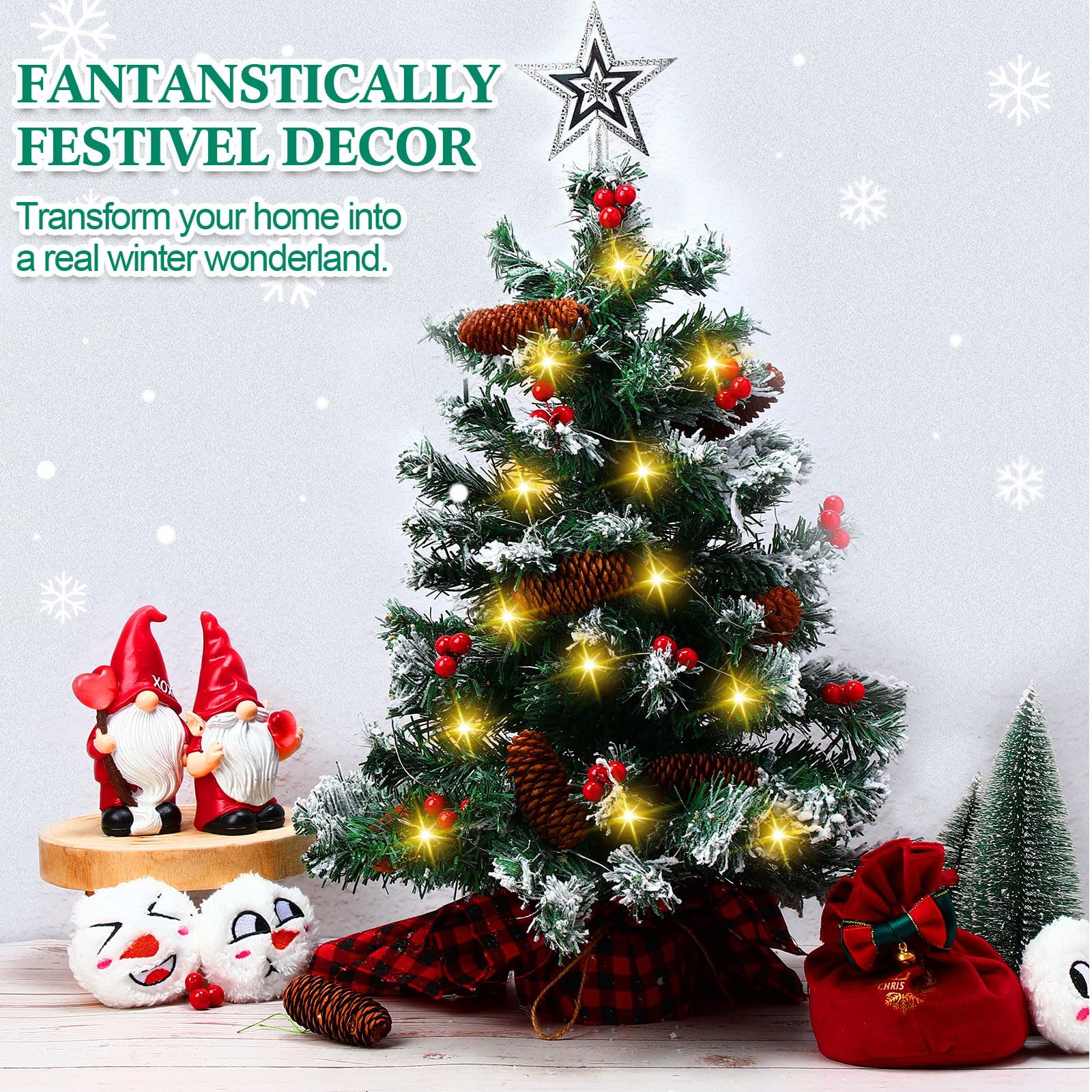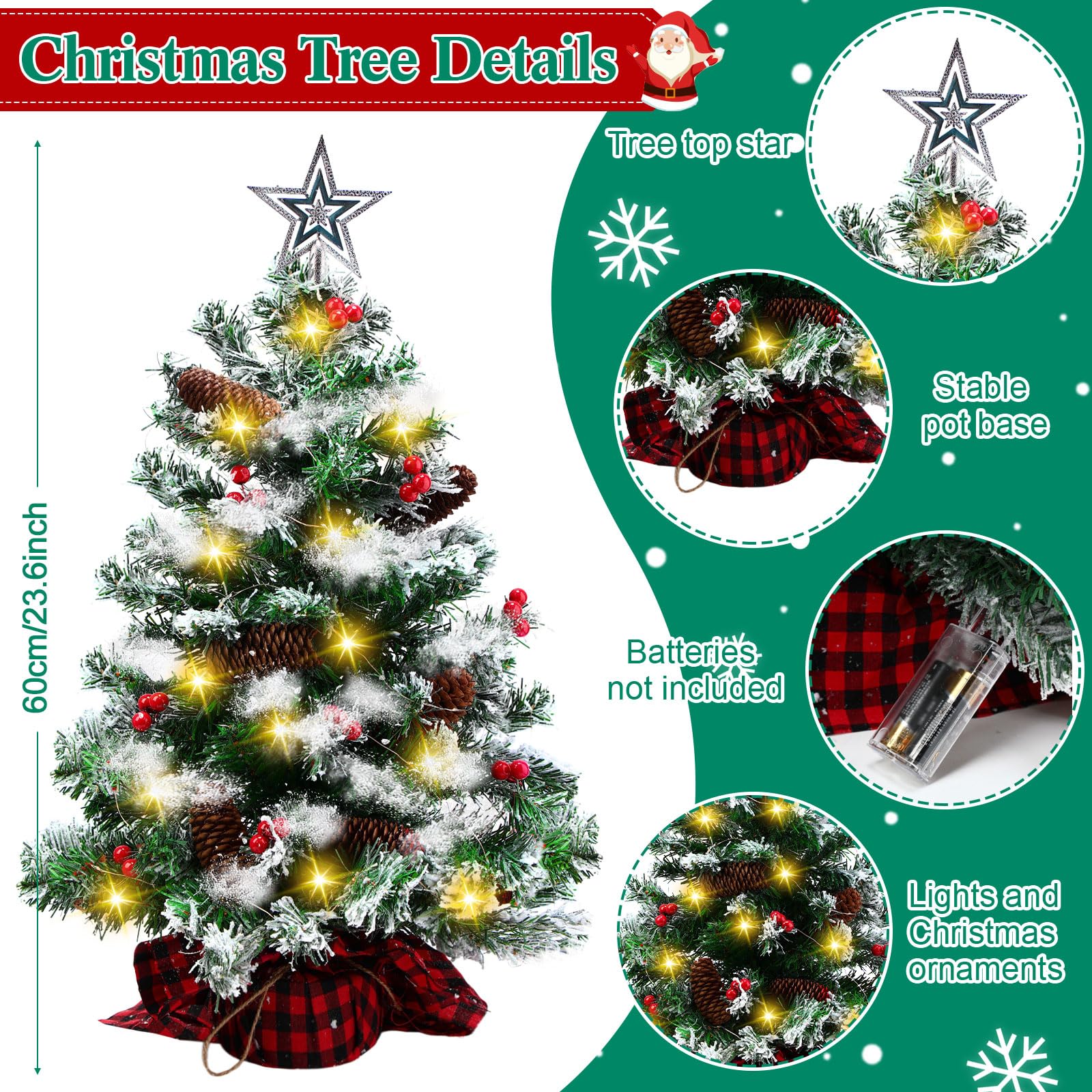 2 Pcs 2FT Mini Christmas Trees with Lights Artificial Christmas Trees Tabletop with Berries Pine Cones Hanging Ornaments Red Lattice Cloth Base Holiday Party Xmas Decorations, Sliver