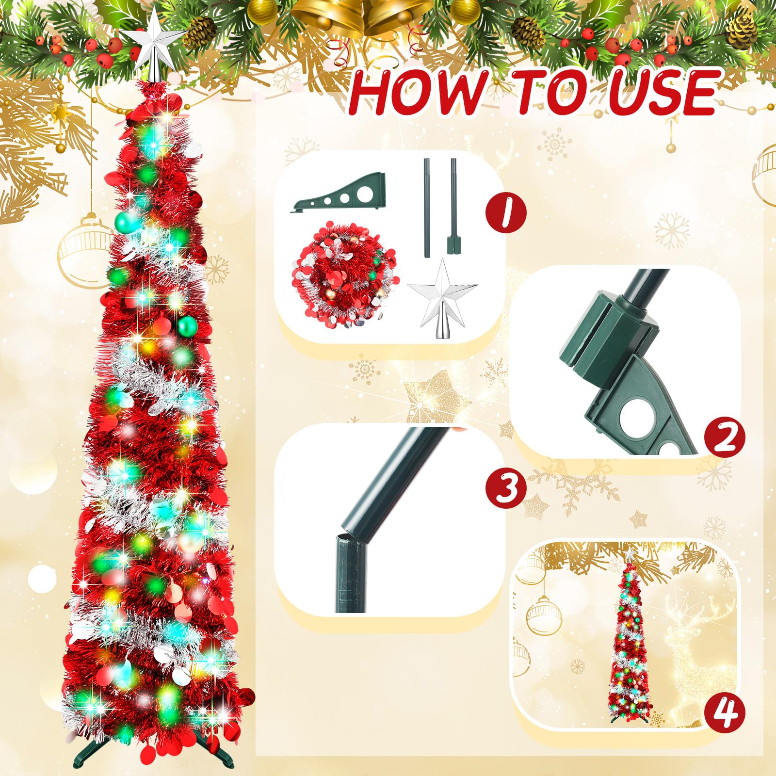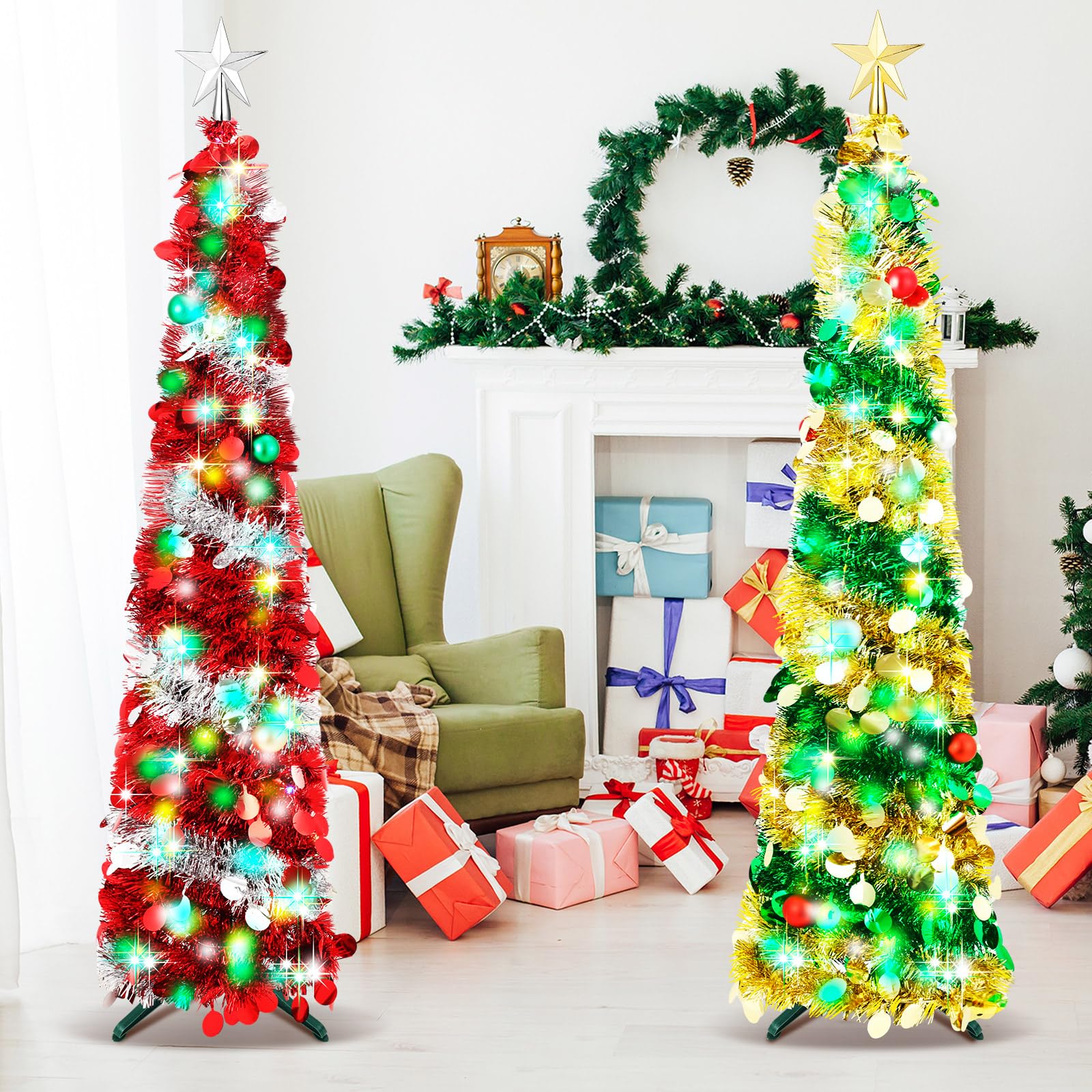 2 Pcs 5 ft Prelit Slim Christmas Tree Decor Pop Up Pencil Christmas Tree with String Lights Artificial Sequin Collapsible Christmas Tree with Star Topper for Xmas Holiday Outdoor Decorations