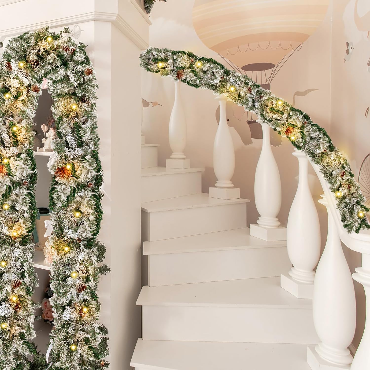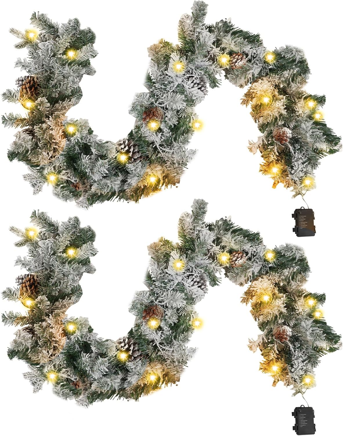 2 Pcs 6ft Frosted Christmas Garland Cedar Garland with 50 Warm White LED Lights Battery Operated with Timer and 8 Functions Pre Lit Artificial Christmas Garland 170 Branches Indoor Outdoor