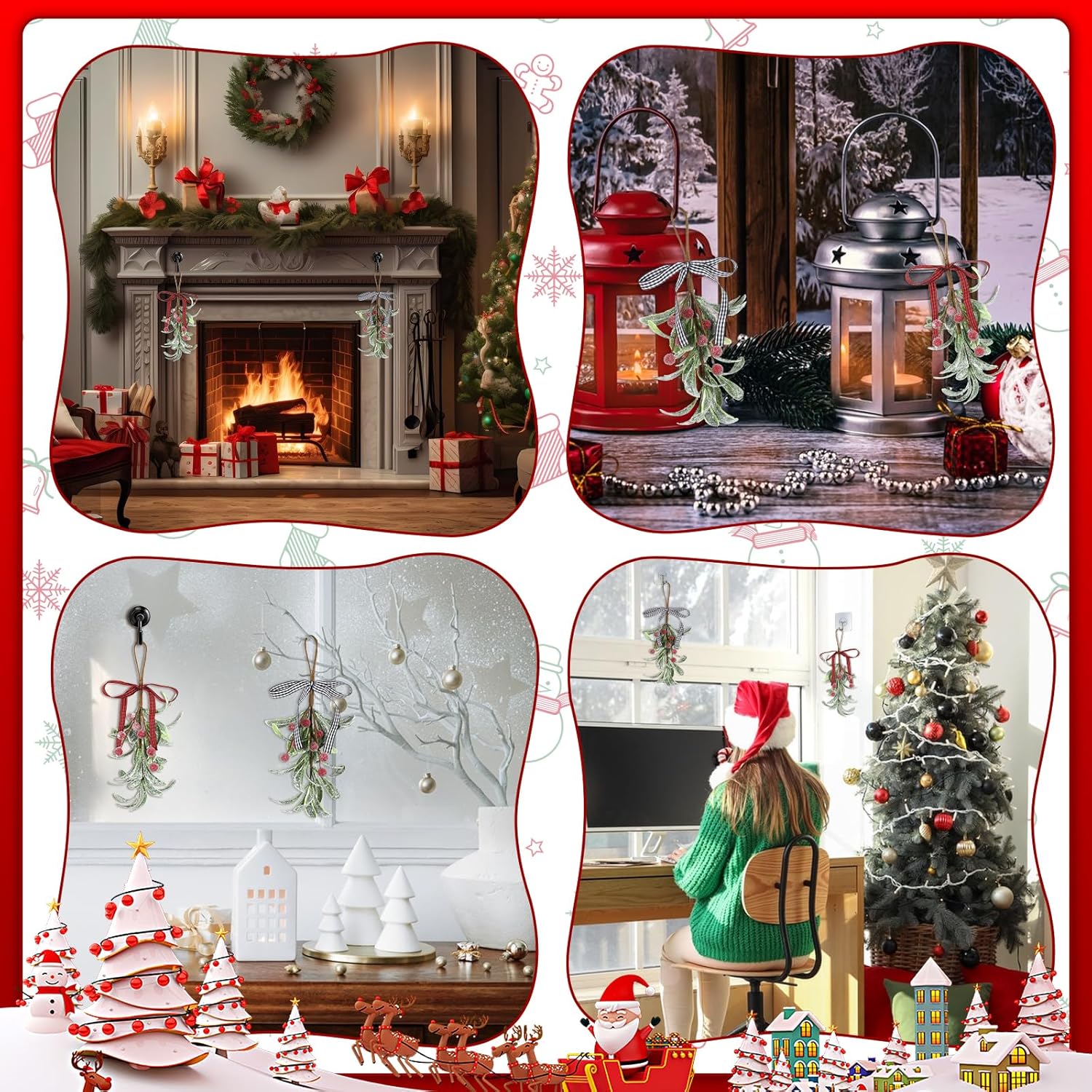 2 Pcs Christmas Mistletoe Decor, Xmas Mistletoe Hanging Ornament with Plaid Bow, Artificial Red Berry Mistletoe Decorations Glitter Christmas Tree Accessories Mistletoe Kissing Ball(Red+White)