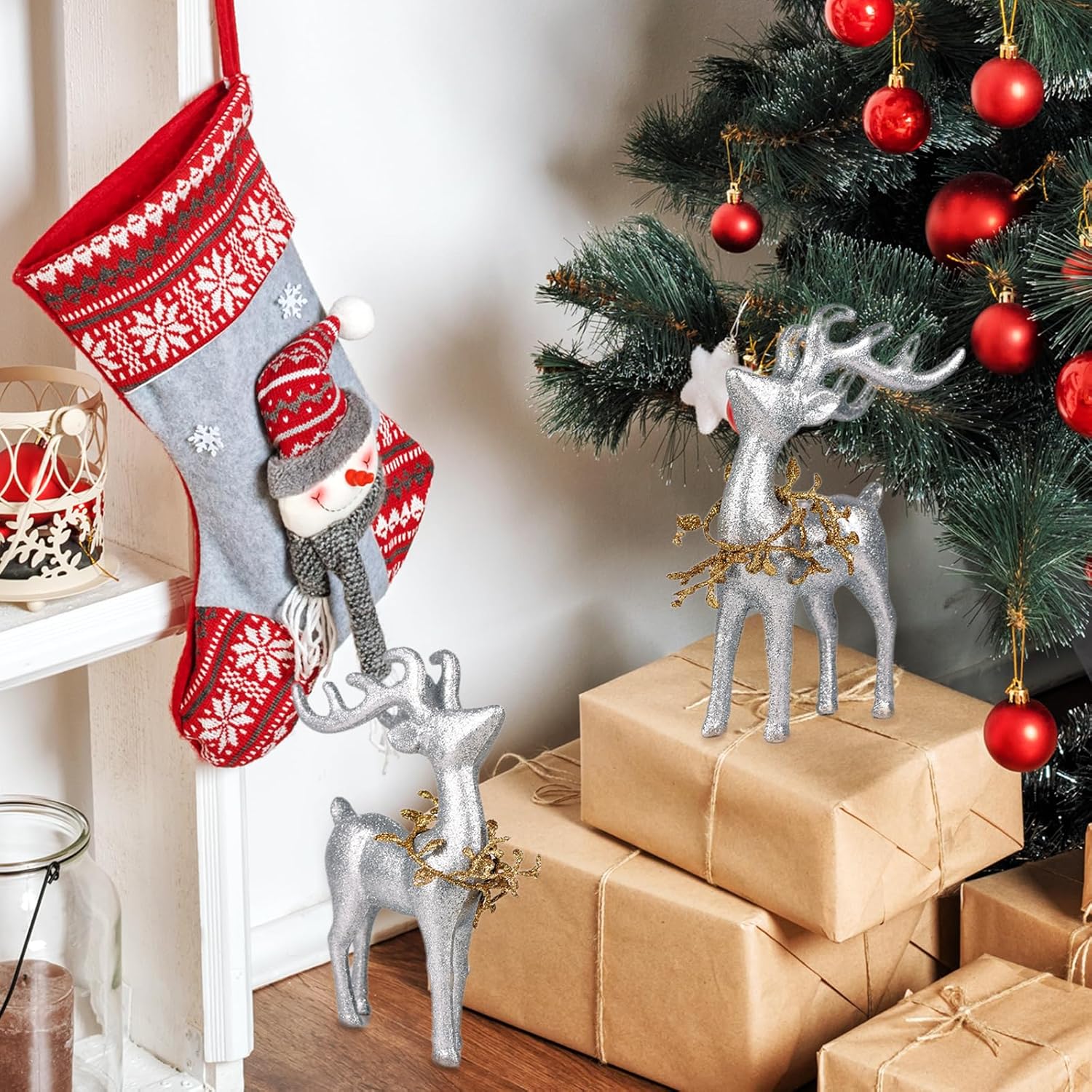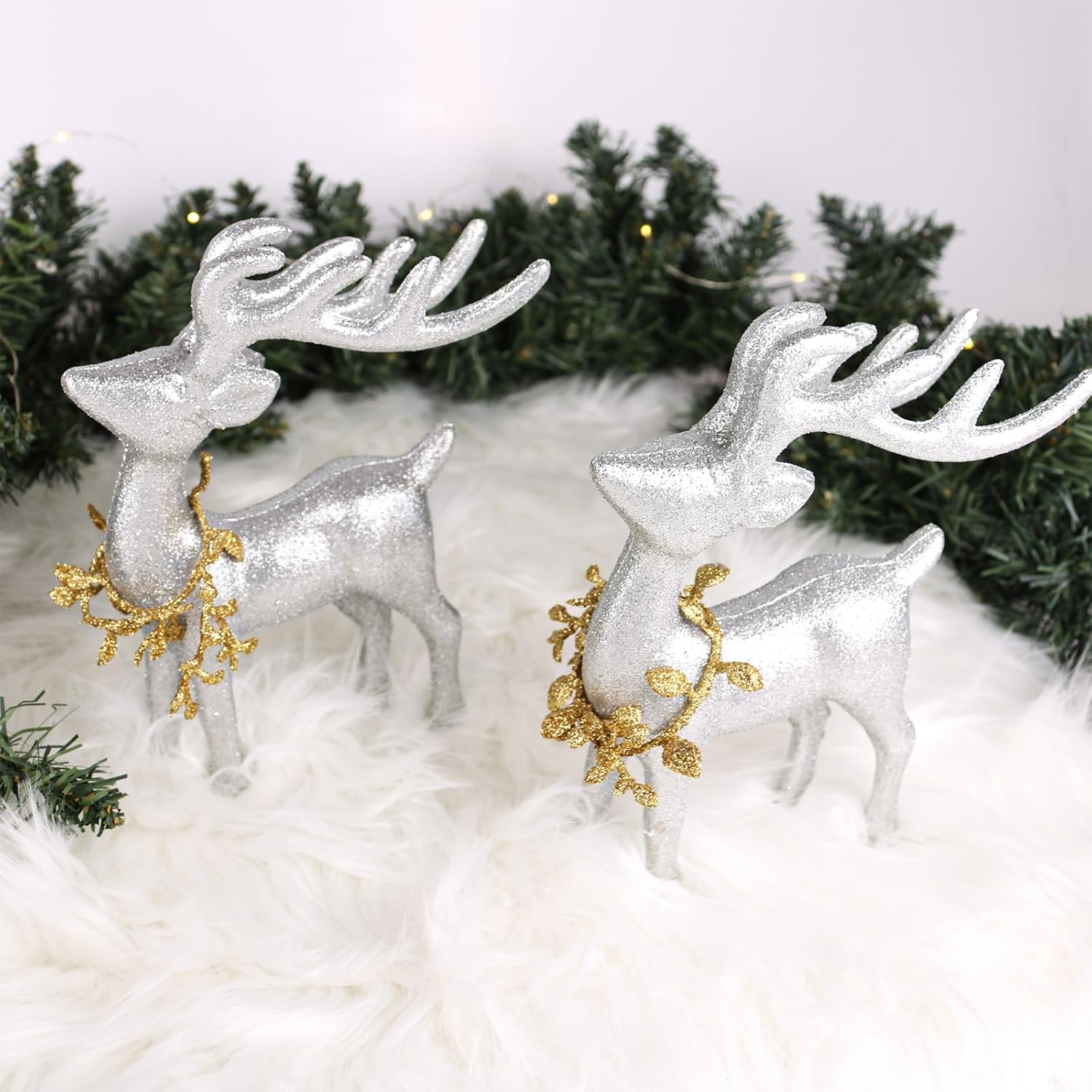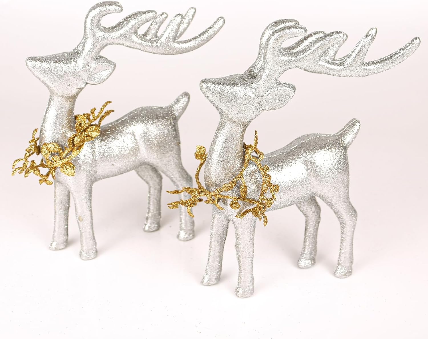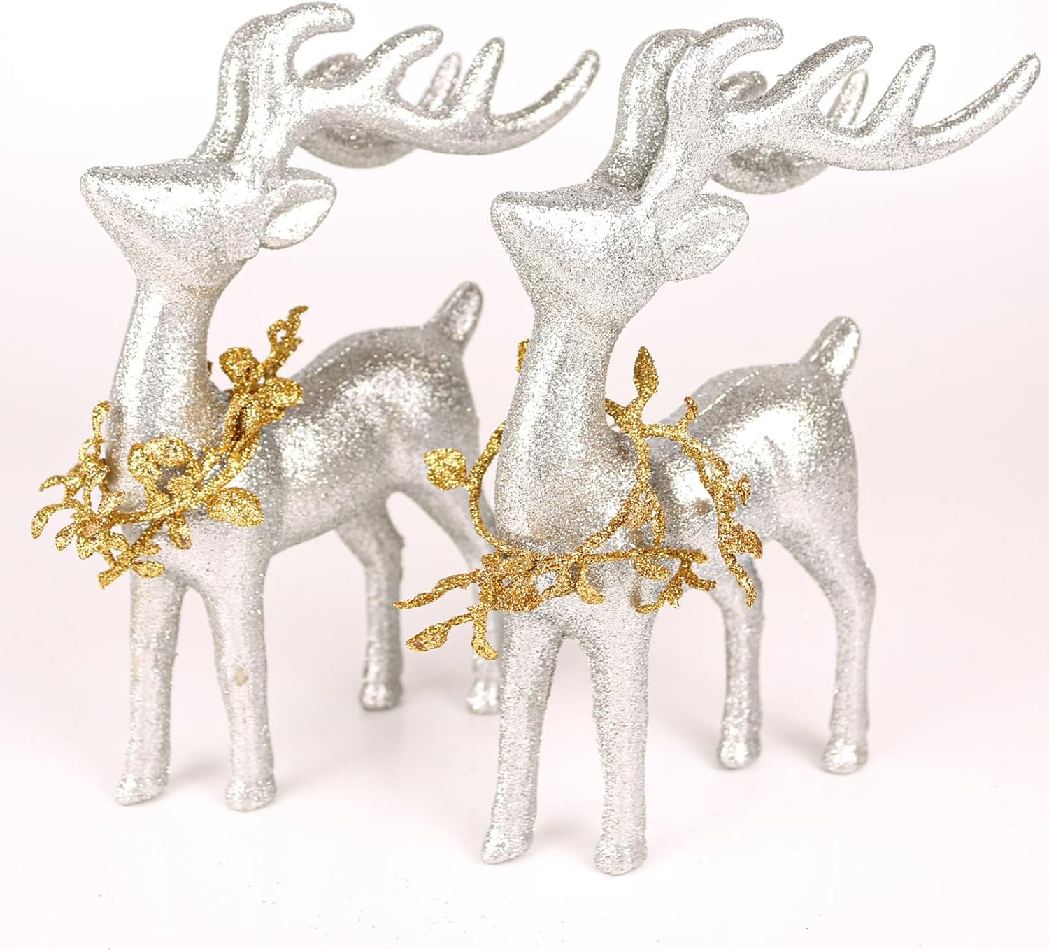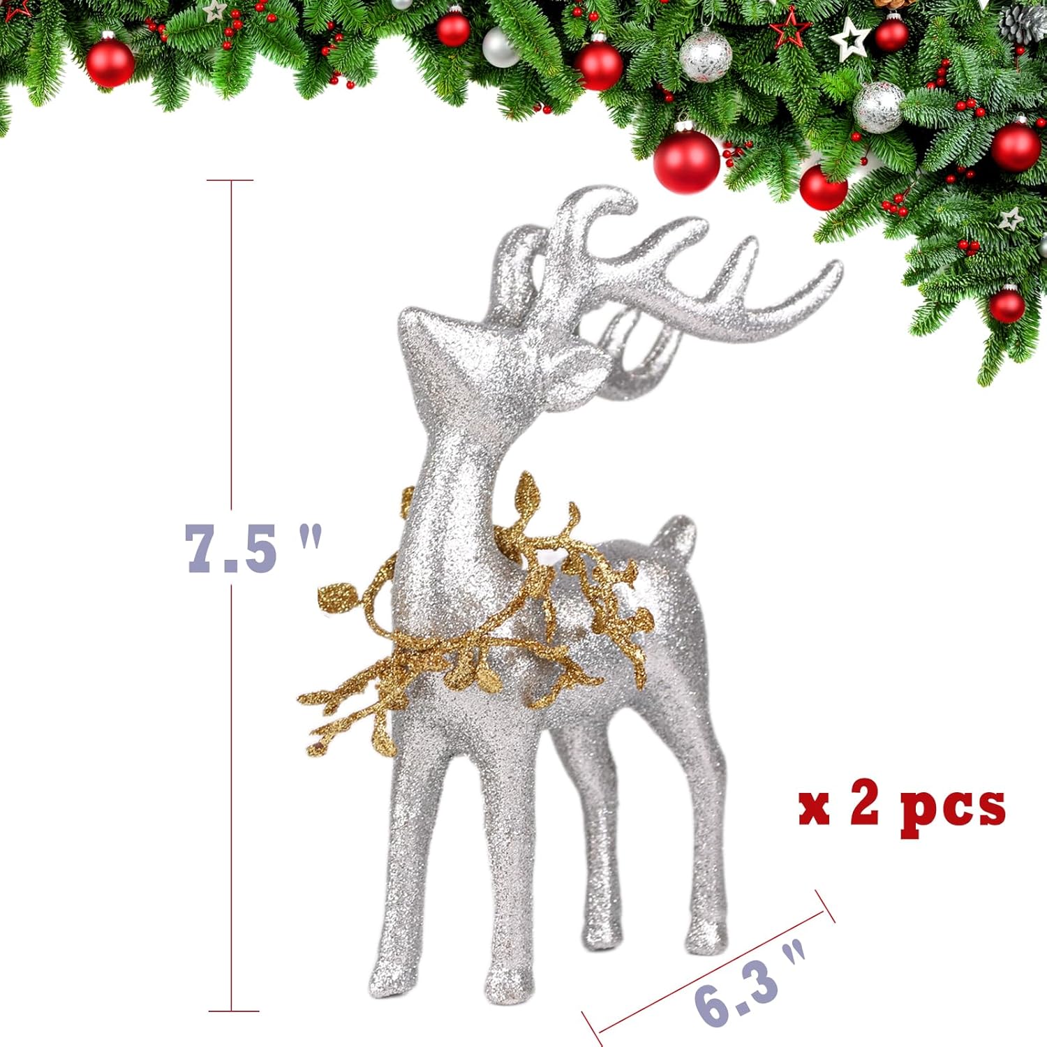 2 pcs Reindeer Christmas Decorations, Silver Christmas Reindeer Figurines with Gold Eucalyptus Garland, Indoor Deer Décor Christmas Table Centerpieces Decorations