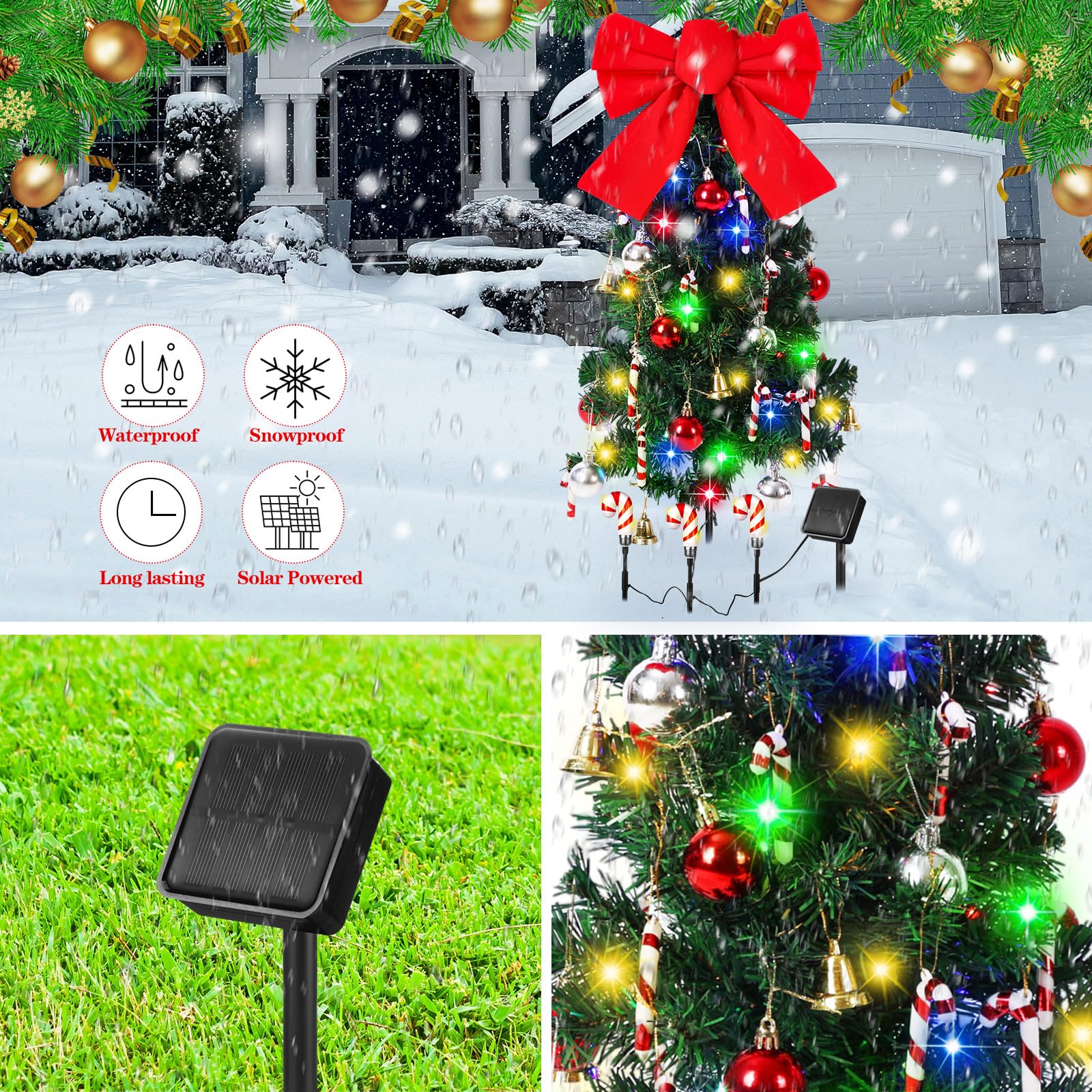 2 Pcs Solar Christmas Tree with Lights Outdoor Waterproof 31.5 Inch Solar Powered Xmas Tree Lights with 45 Leds and 8 Modes Bow Balls Bells Candy Bars Decor for Yard Garden Pathway Lawn Patio