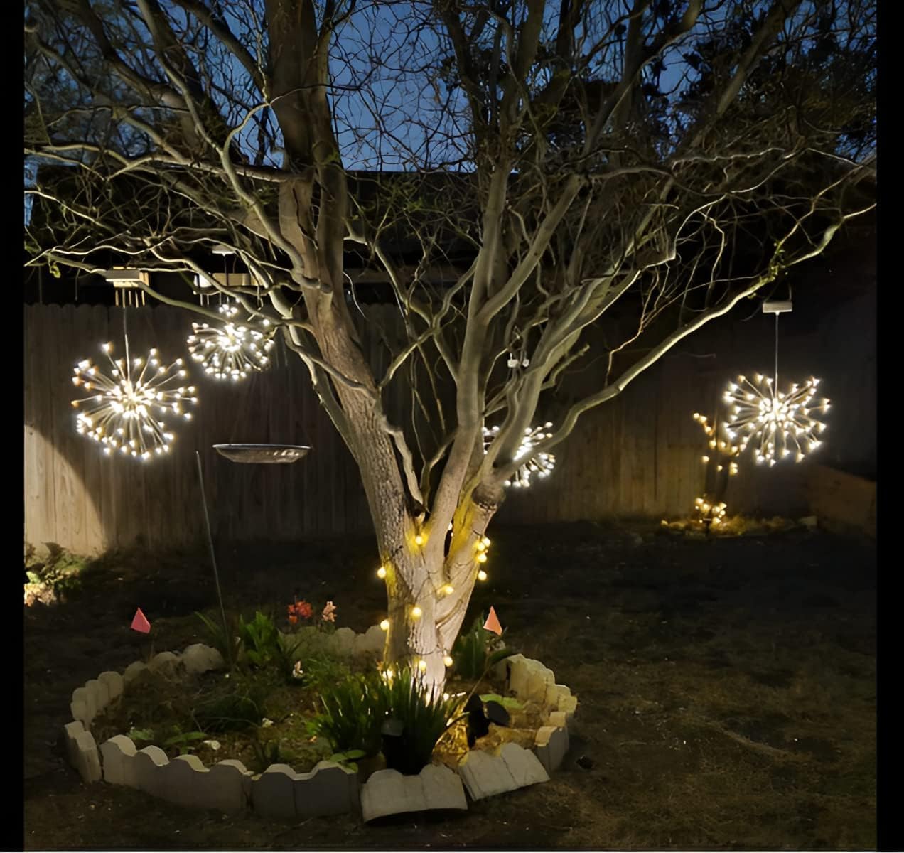 Brightness: 2 Pack outdoor fireworks lights with a total of 240 LED, updated with larger solar panels,provides ample lighting for outdoor spaces, perfect brightness, bright and beautiful lights is eye-catching, and beautiful decoration adds multi color to the space. 🎇Durability: The solar garden lights are IP65 waterproof and durable, and the light remains good in wind and rain. It is fully charged in sunlight for 6-8 hours and automatically lights up at night. Attention: Please do not cover the solar panel to avoid charging failure.
