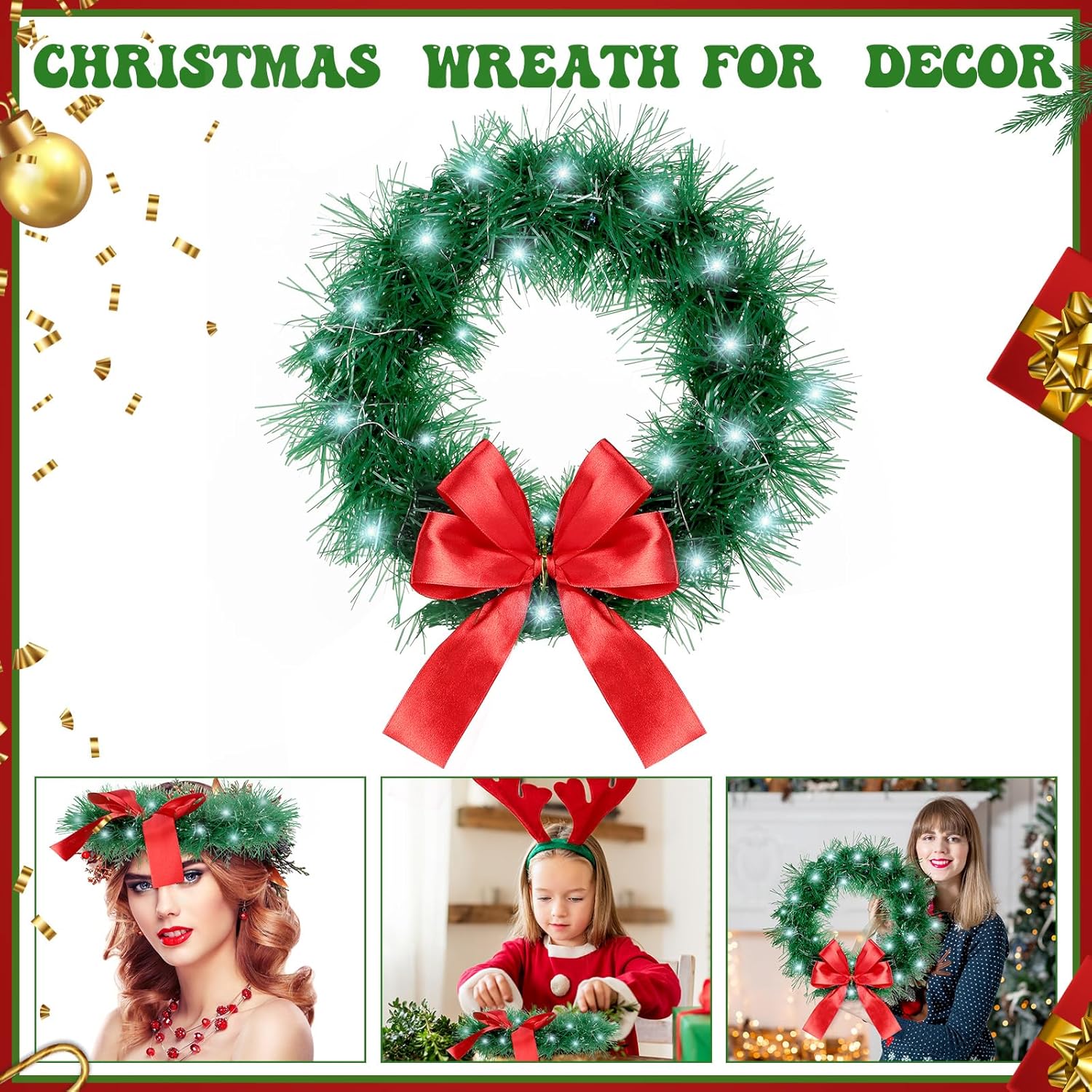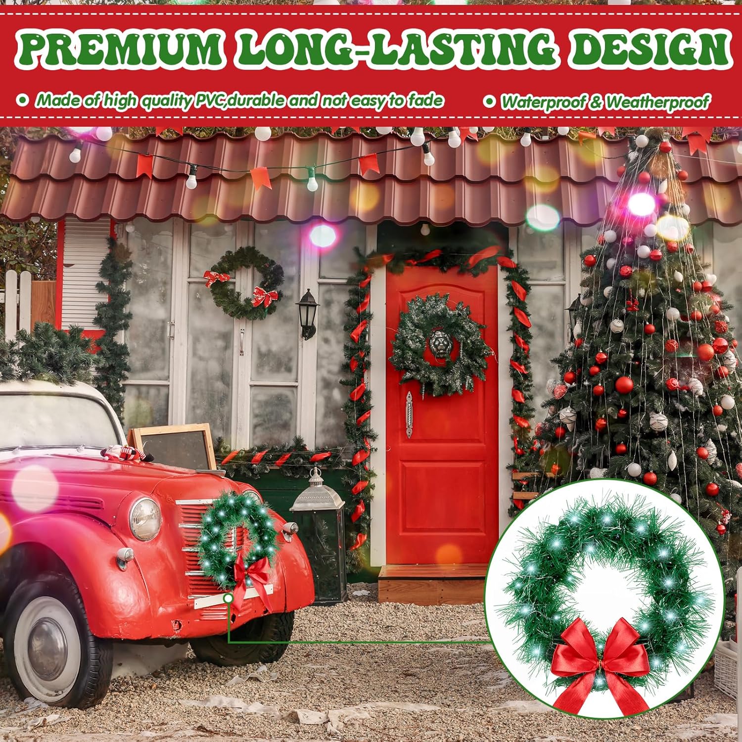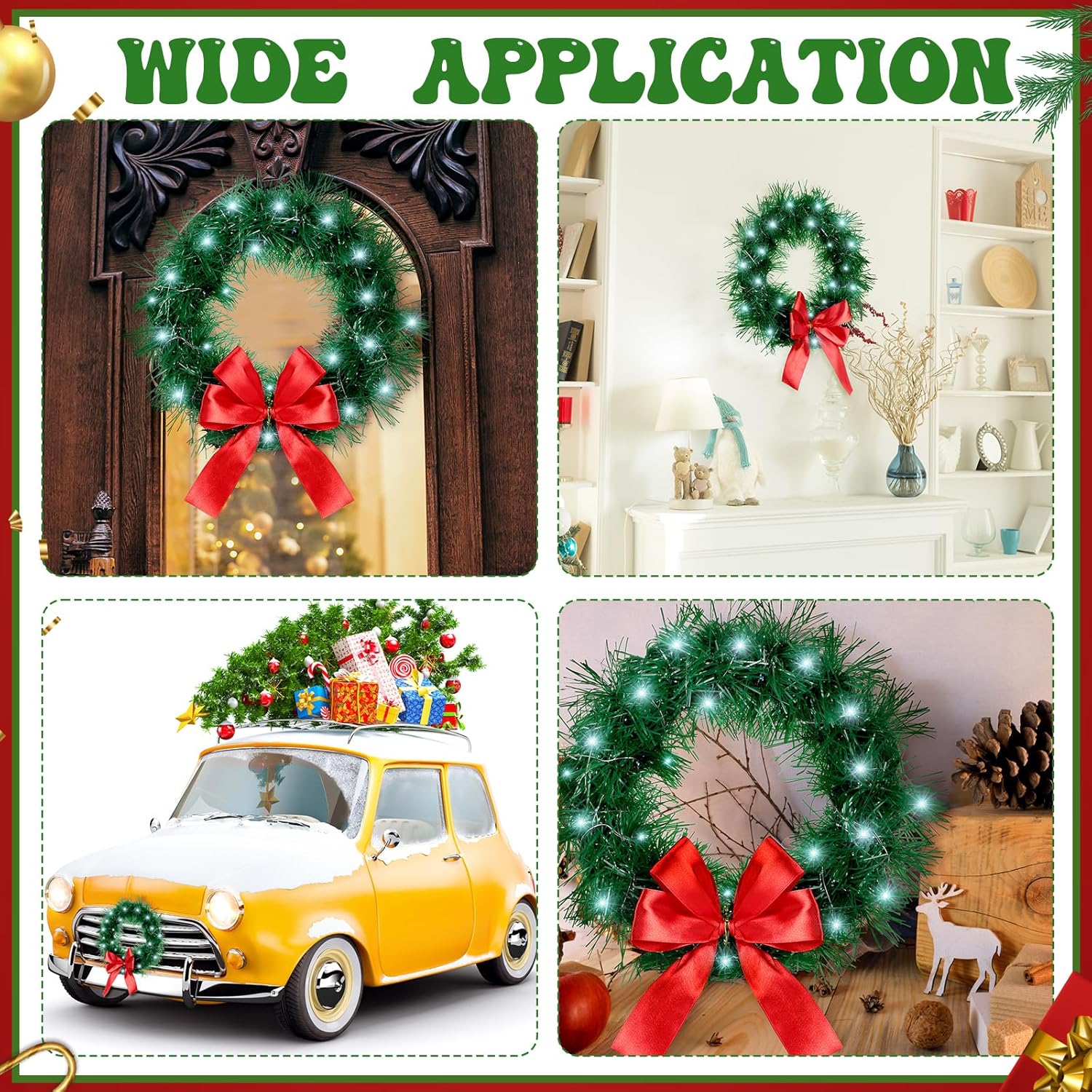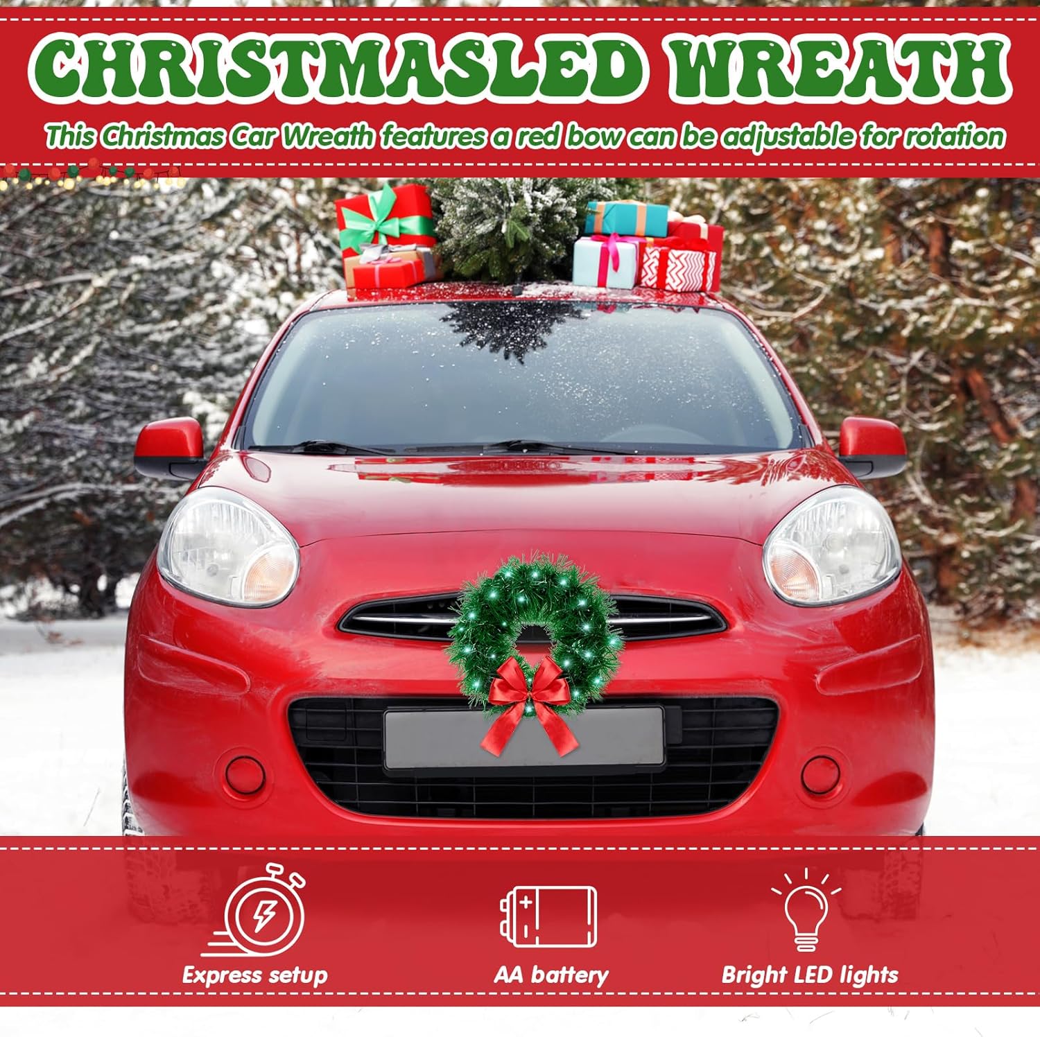 2 Pieces 13 Inch Car Christmas Wreath with 20 Small White Light Christmas Car Decoration with Red Bow Christmas Wreath for Car with Battery Case for Car, Suv Winter Christmas Decorations