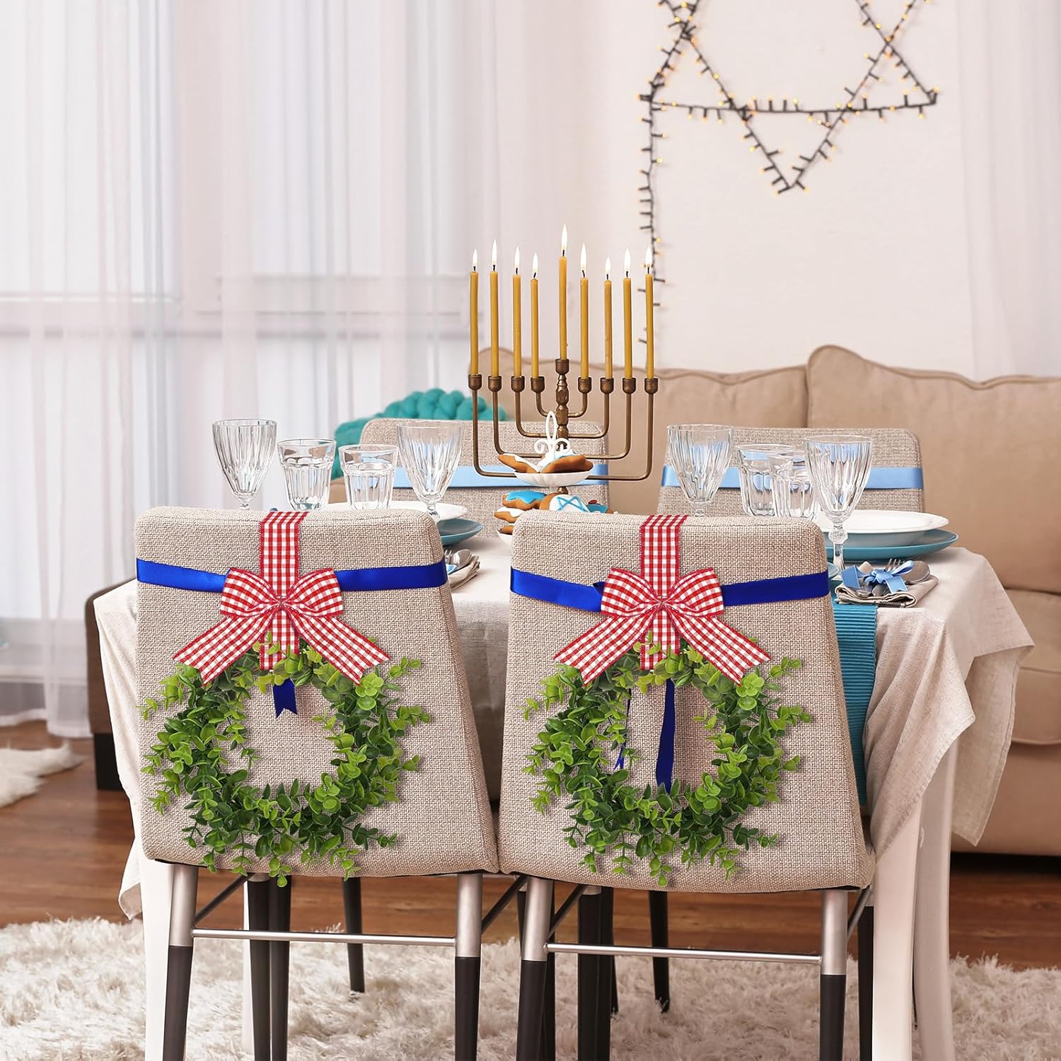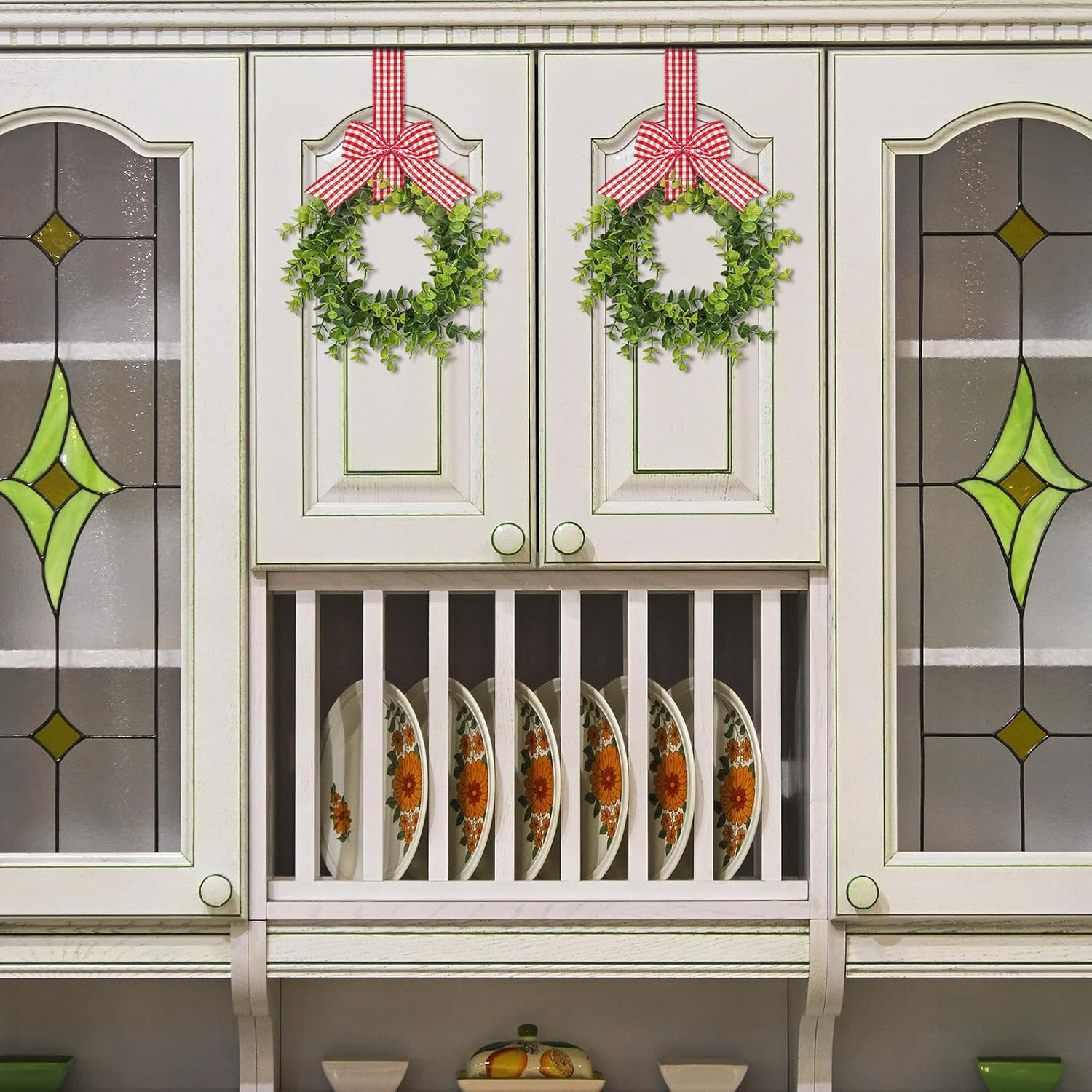 2 Pieces Faux Kitchen Cabinet Wreaths Christmas Boxwood Wreaths with Ribbon Artificial Green Leaves Wreaths Decorative Christmas Hanging Wreaths for Cabinet Wall Window (Red and White)