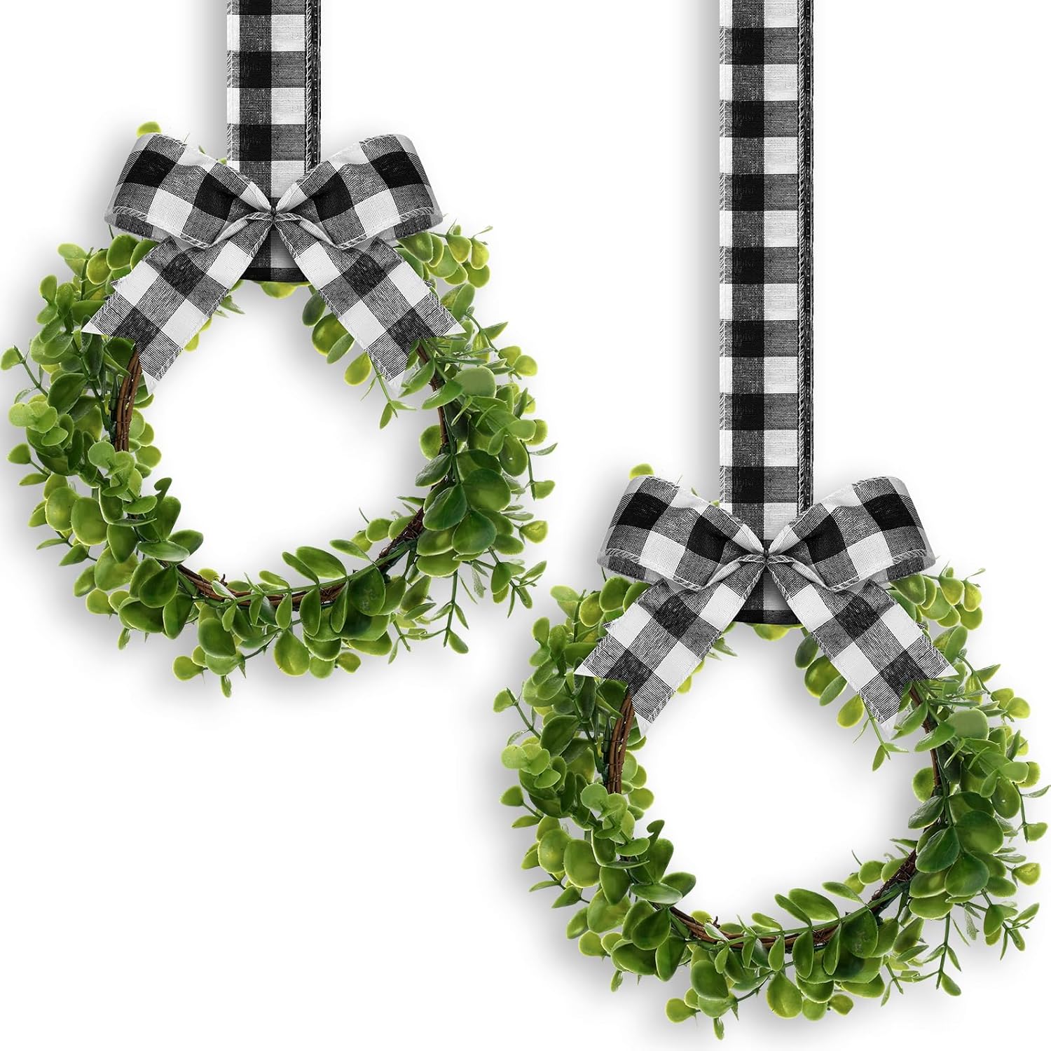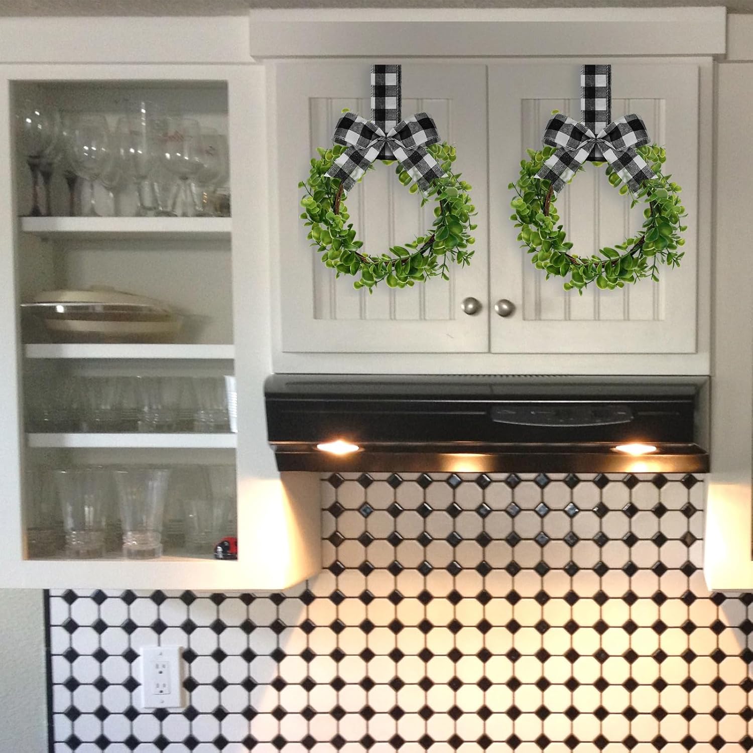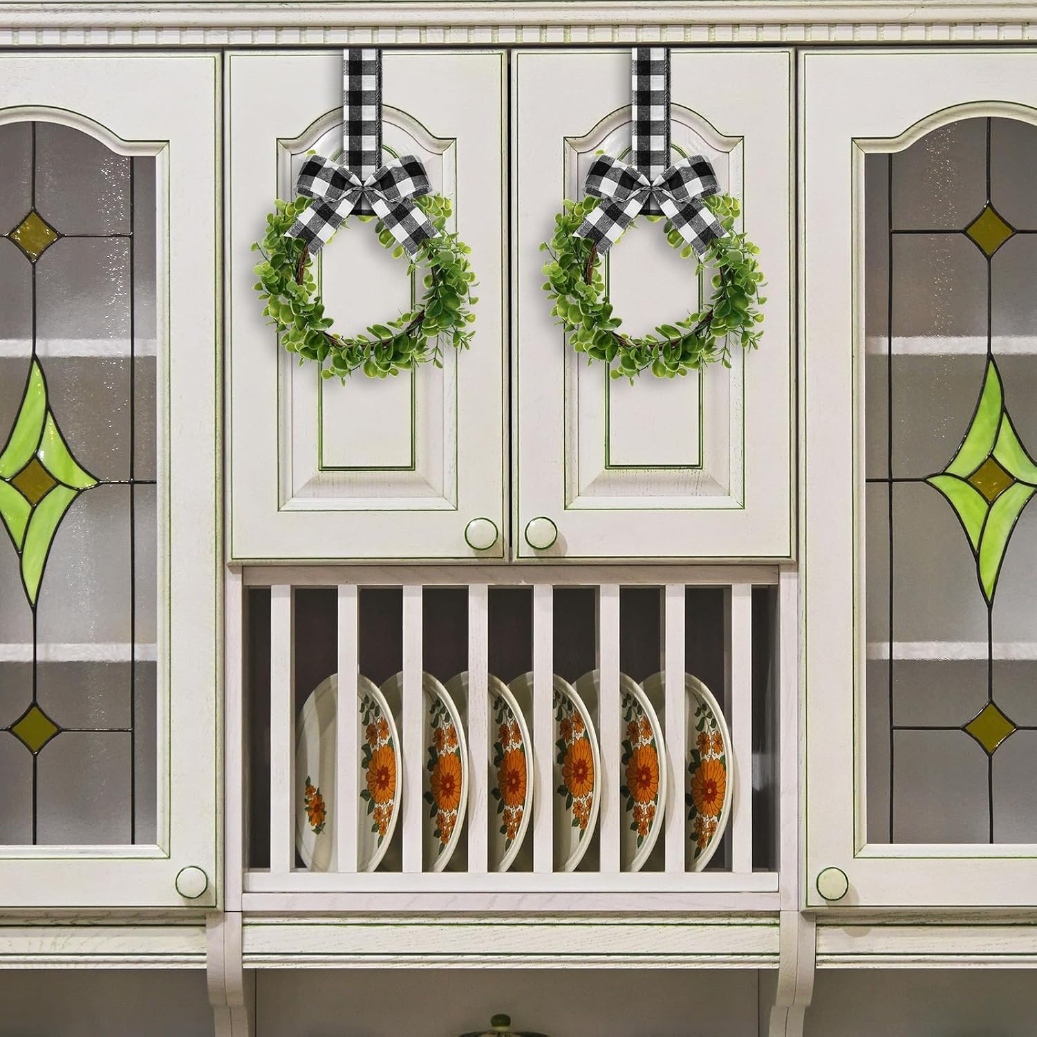 2 Pieces Faux Kitchen Christmas Cabinet Wreaths Boxwood Wreaths with Ribbon Buffalo Plaid Kitchen Decor Hanging Wreaths Small Farmhouse Wreaths Artificial Greenery Wreaths for Kitchen Cabinet Doors