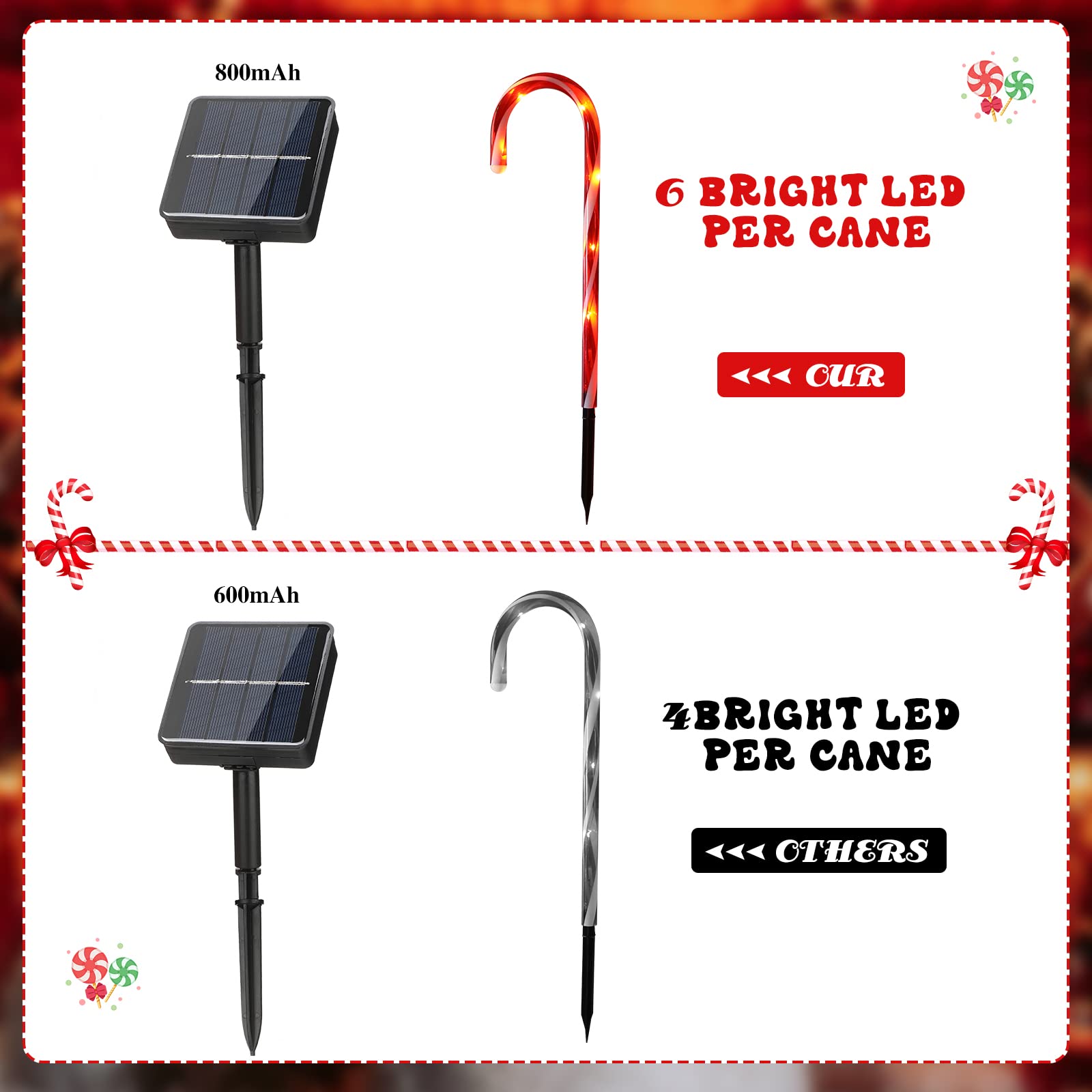 Christmas Candy Cane Lights Set: you will receive 2 sets of Christmas candy cane lights, each set contains 12 canes, every cane has 6 LED lights inside, Christmas cane lights are 18.6 inches high and the distance between the canes is 58 cm, enough crutches and LED lights to light up your Christmas yard, creating a strong Christmas vibe Solar Christmas Lights: Christmas canes are powered by solar energy, each cane light is equipped with 1.2V 1200mAh, the larger capacity solar battery makes the Christmas cane lights have stronger power storage capacity, and the cane lights are brighter and flickering at night