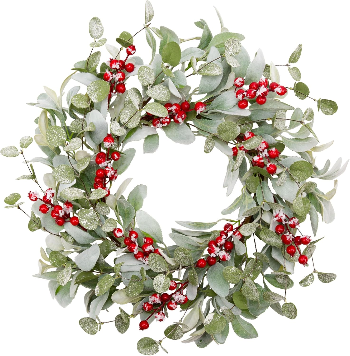 20 Inch Artificial Christmas Wreath Lambs Ear Leaves Door Wreath Winter Wreath with Artificial Snow Red Berries Christmas Decorations for Home Wall Window Decor